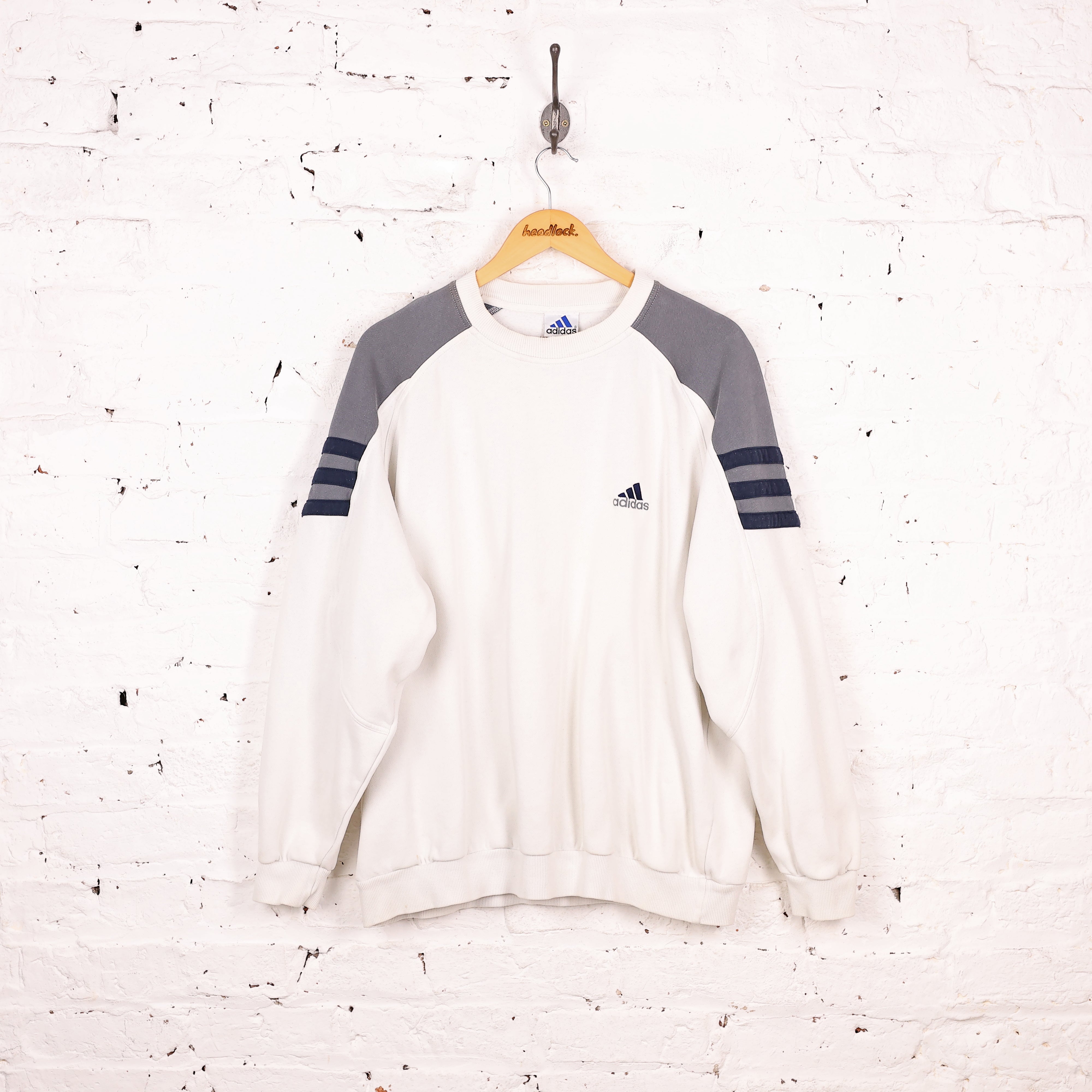 Good condition. 90s Adidas sweatshirt in white with stitched logo on the chest.