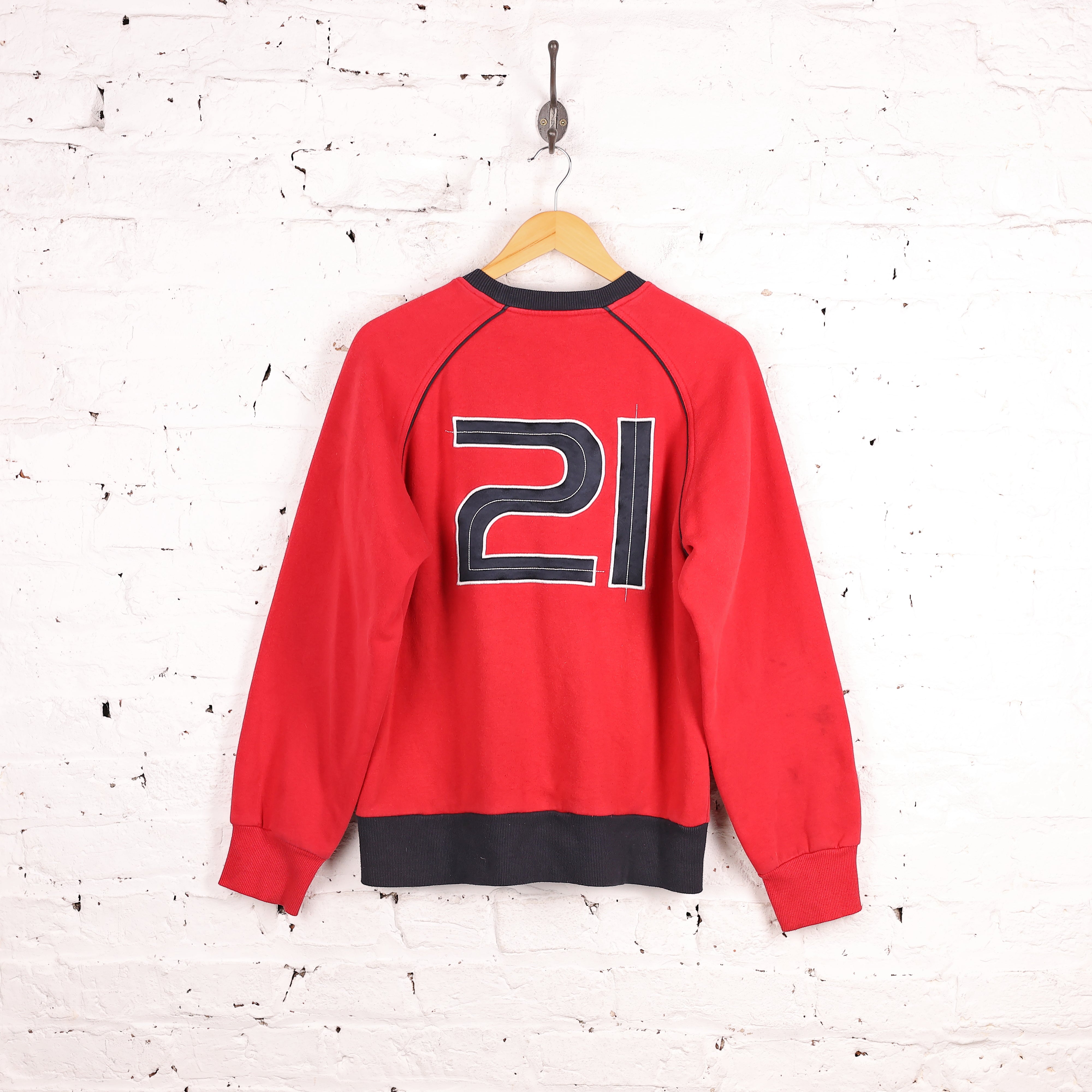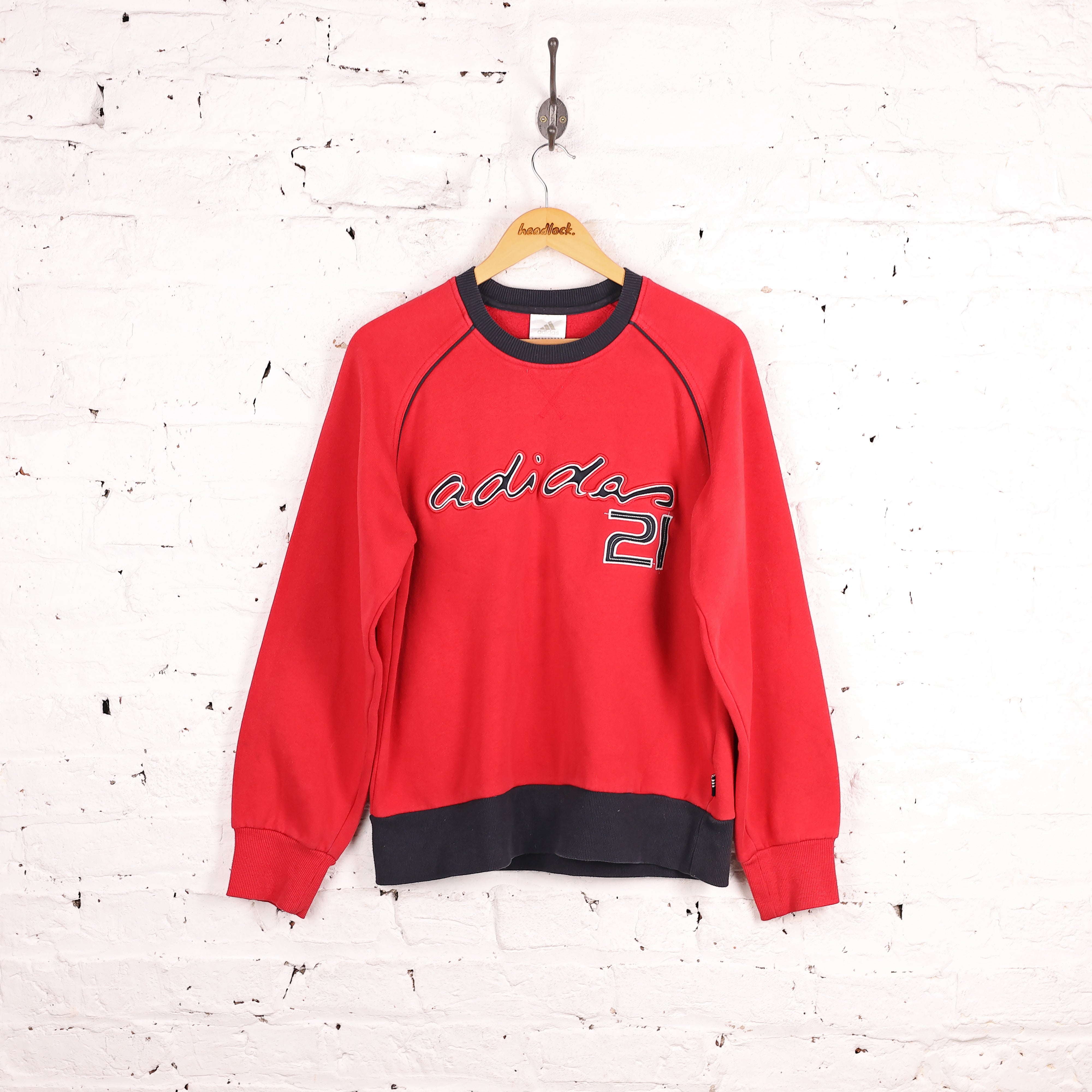Good condition. Adidas 21 sweatshirt in red with stitched lettering across the chest and back.