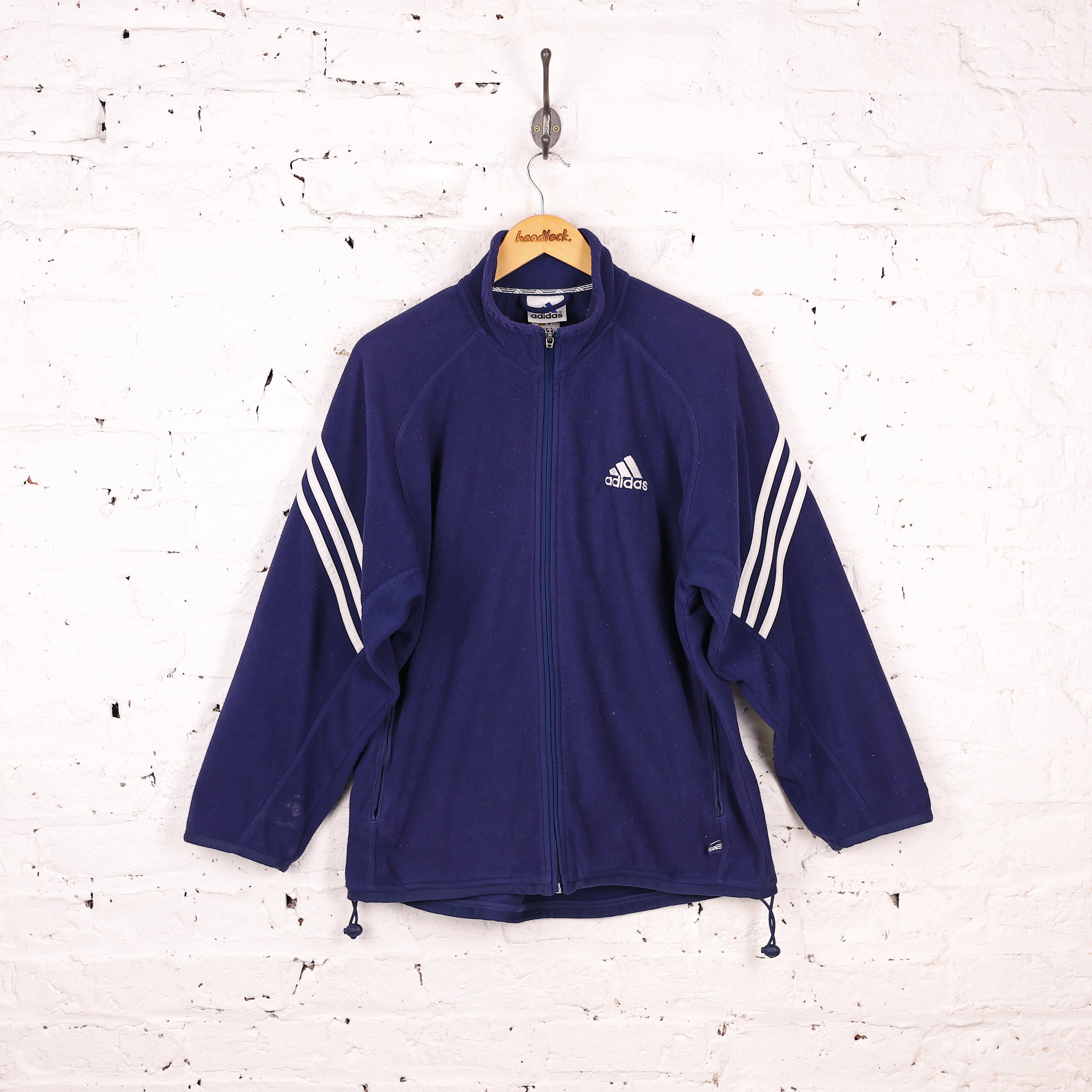 Fair condition, slightly bobbled fabric. Adidas full zip 90s fleece with stitched logo on the chest, three stripe on the arms and zip pockets.