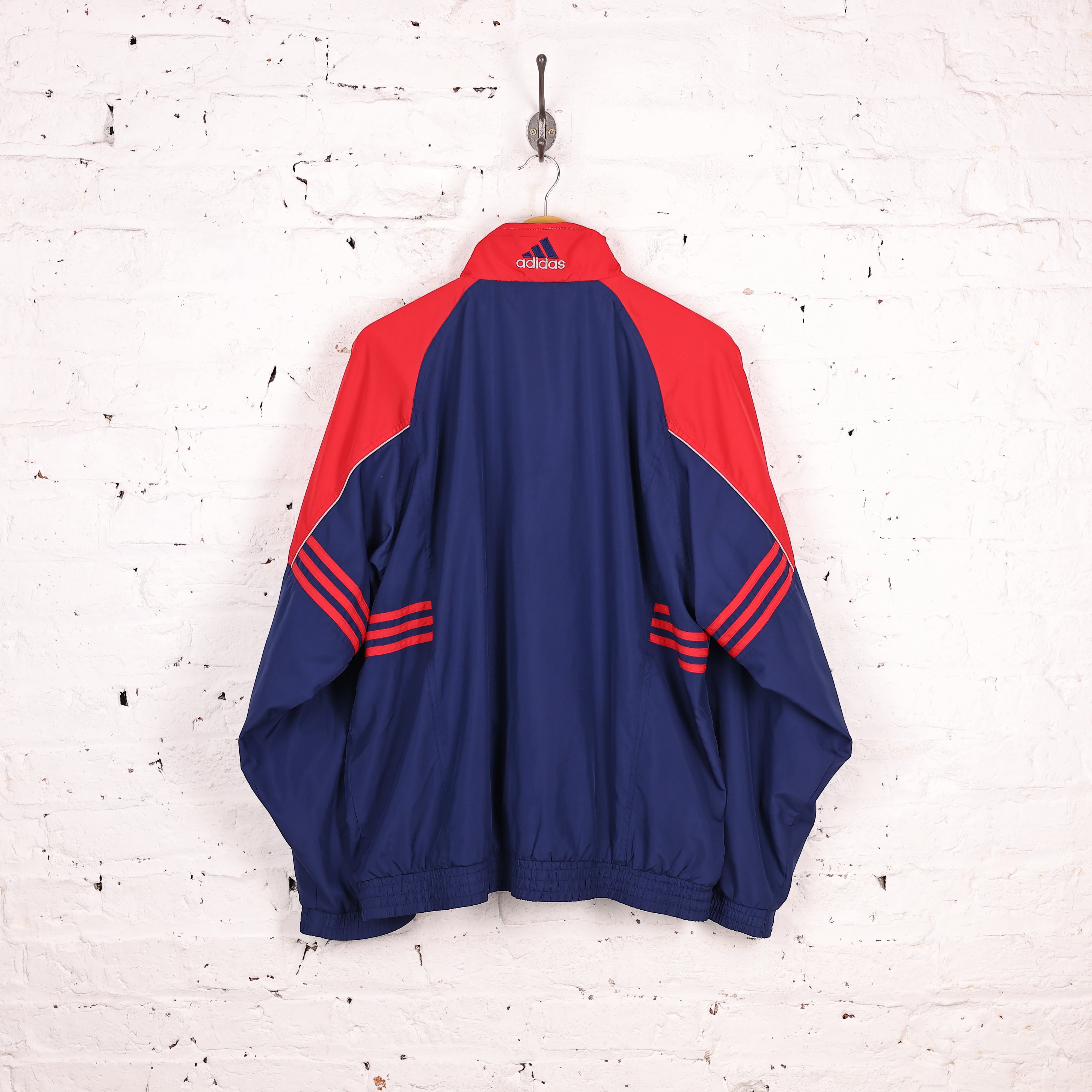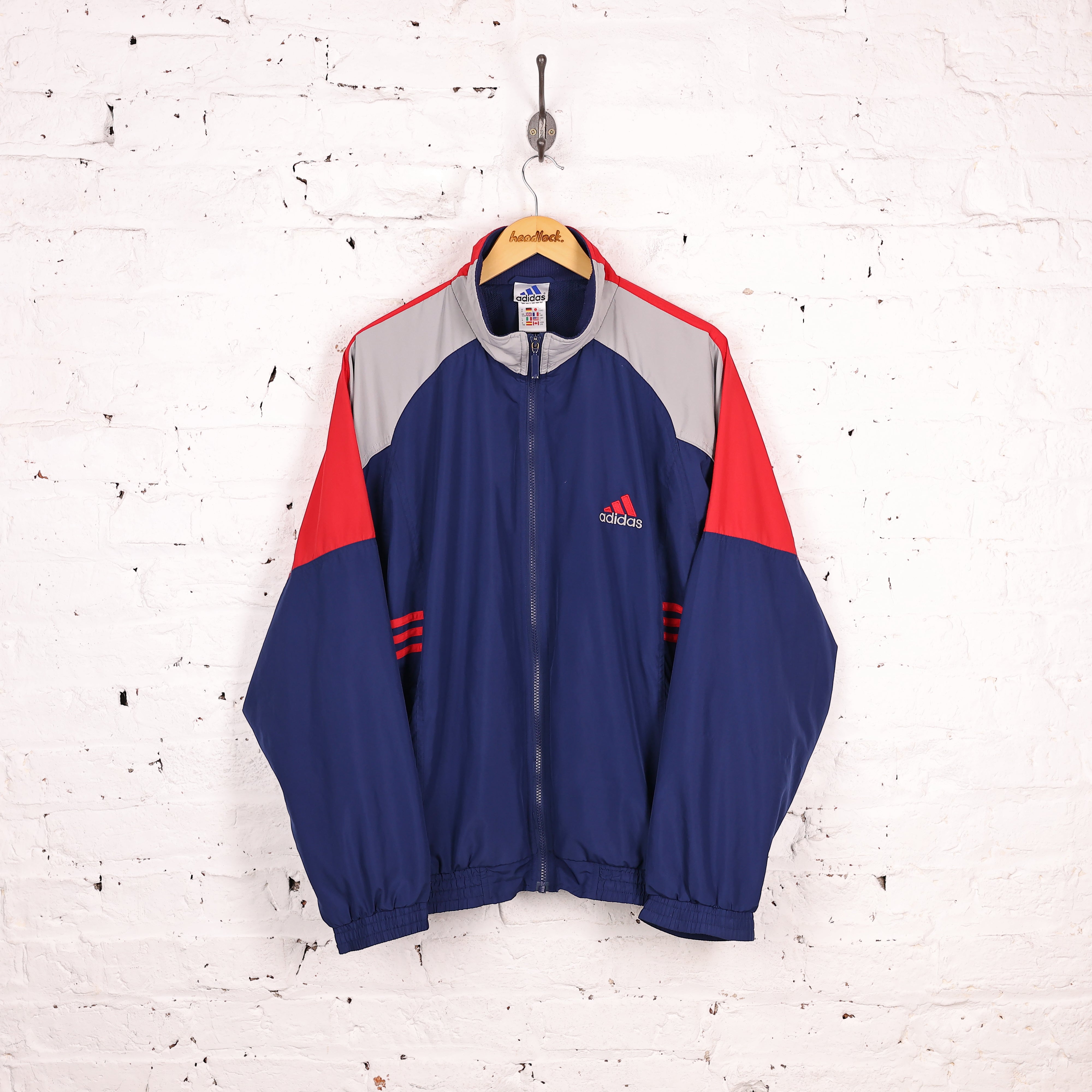 Excellent condition. Adidas shell tracksuit top in blue, red and grey colours, two zip pockets and stitched logo on the chest.