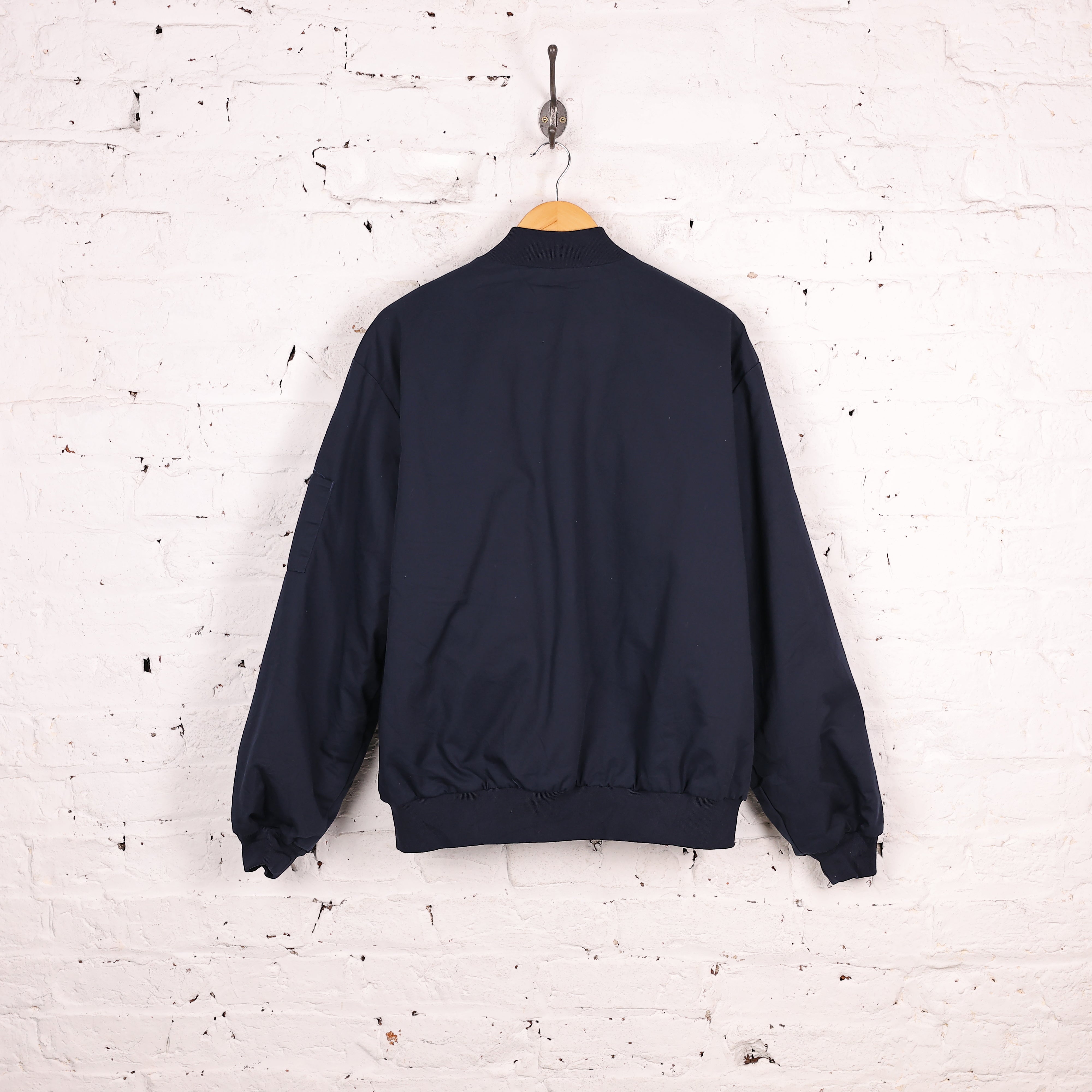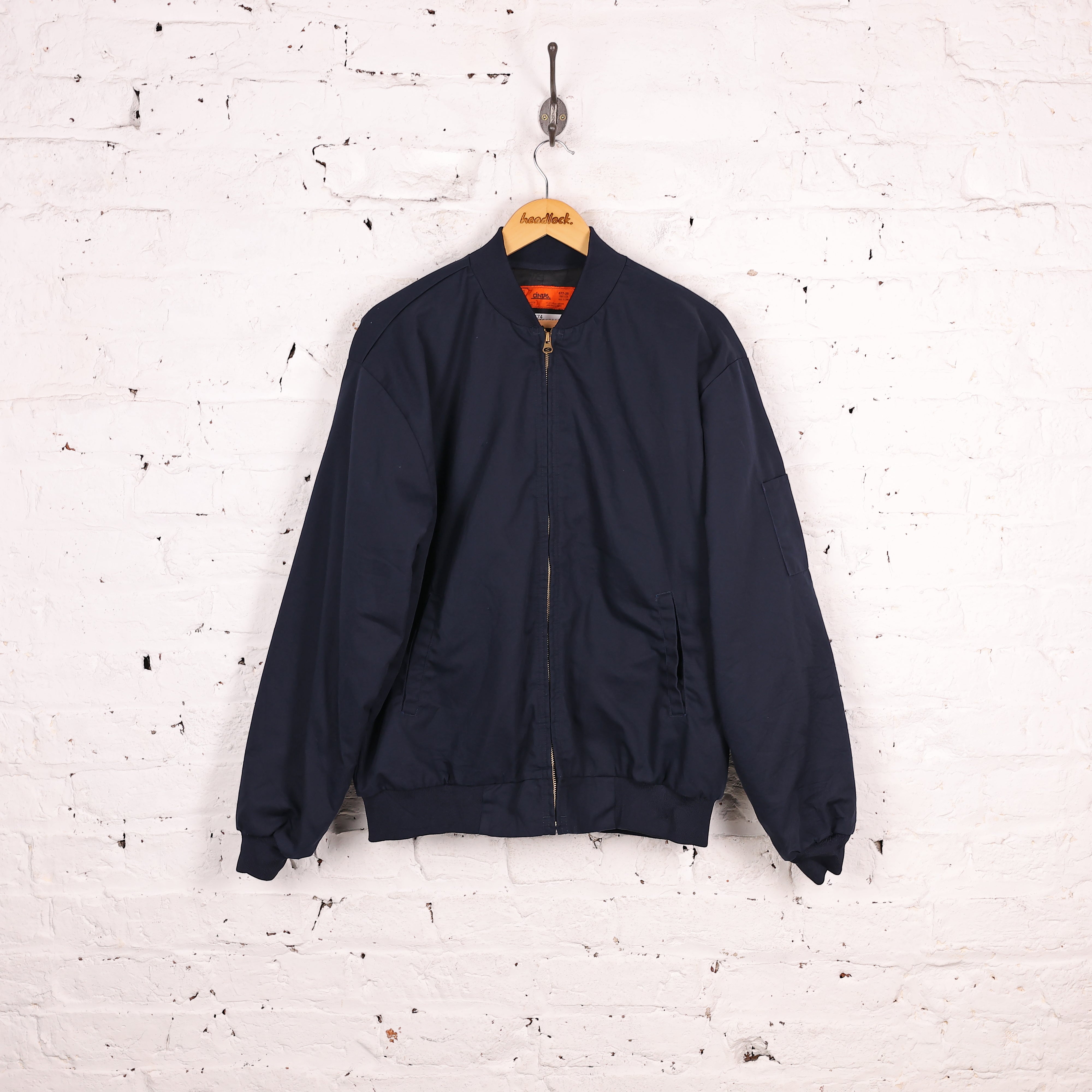 Good condition. American work bomber jacket in navy blue with two pockets and quilted inner lining.