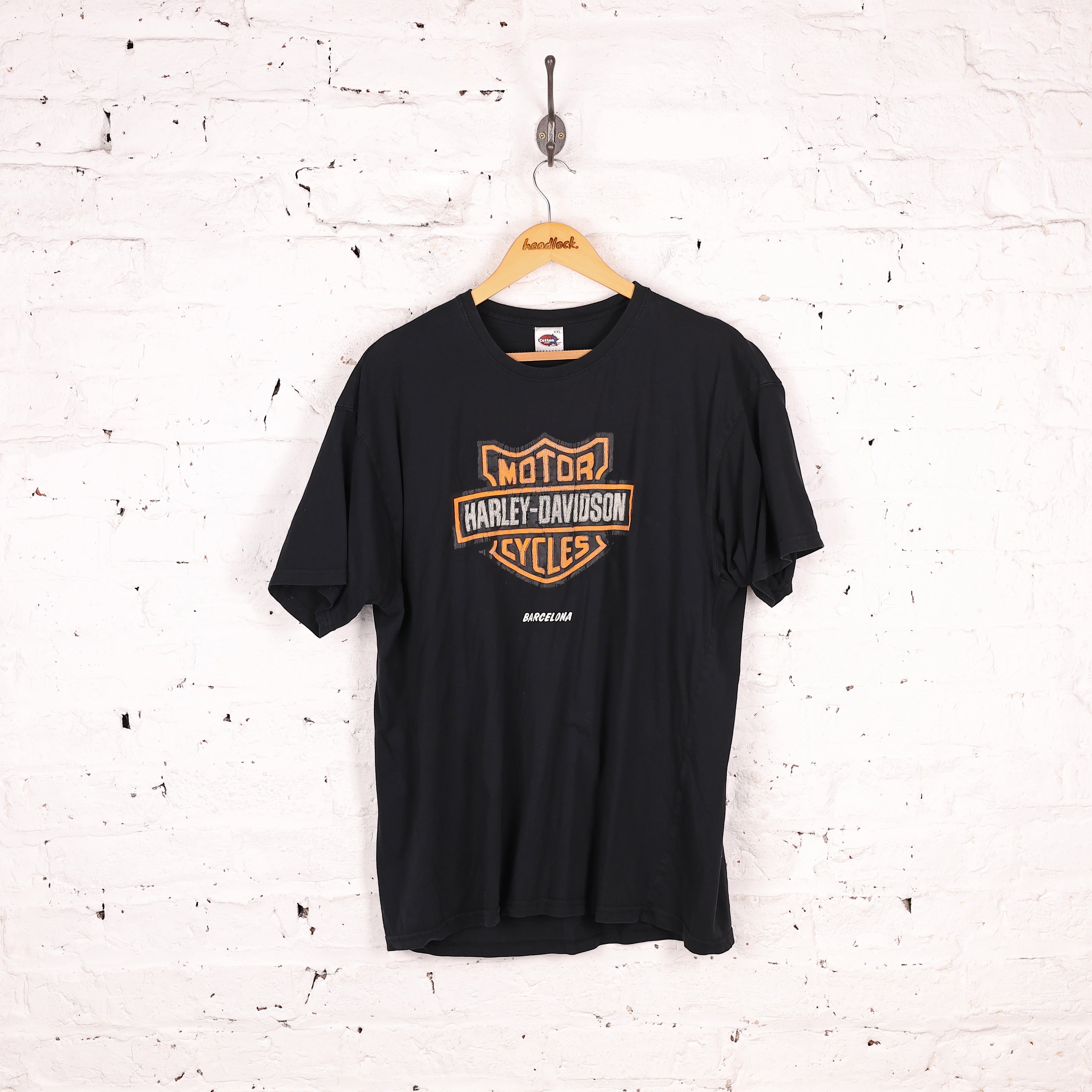 Good condition, cracking to logo on front. Harley Davidson, Barcelona T shirt in black.