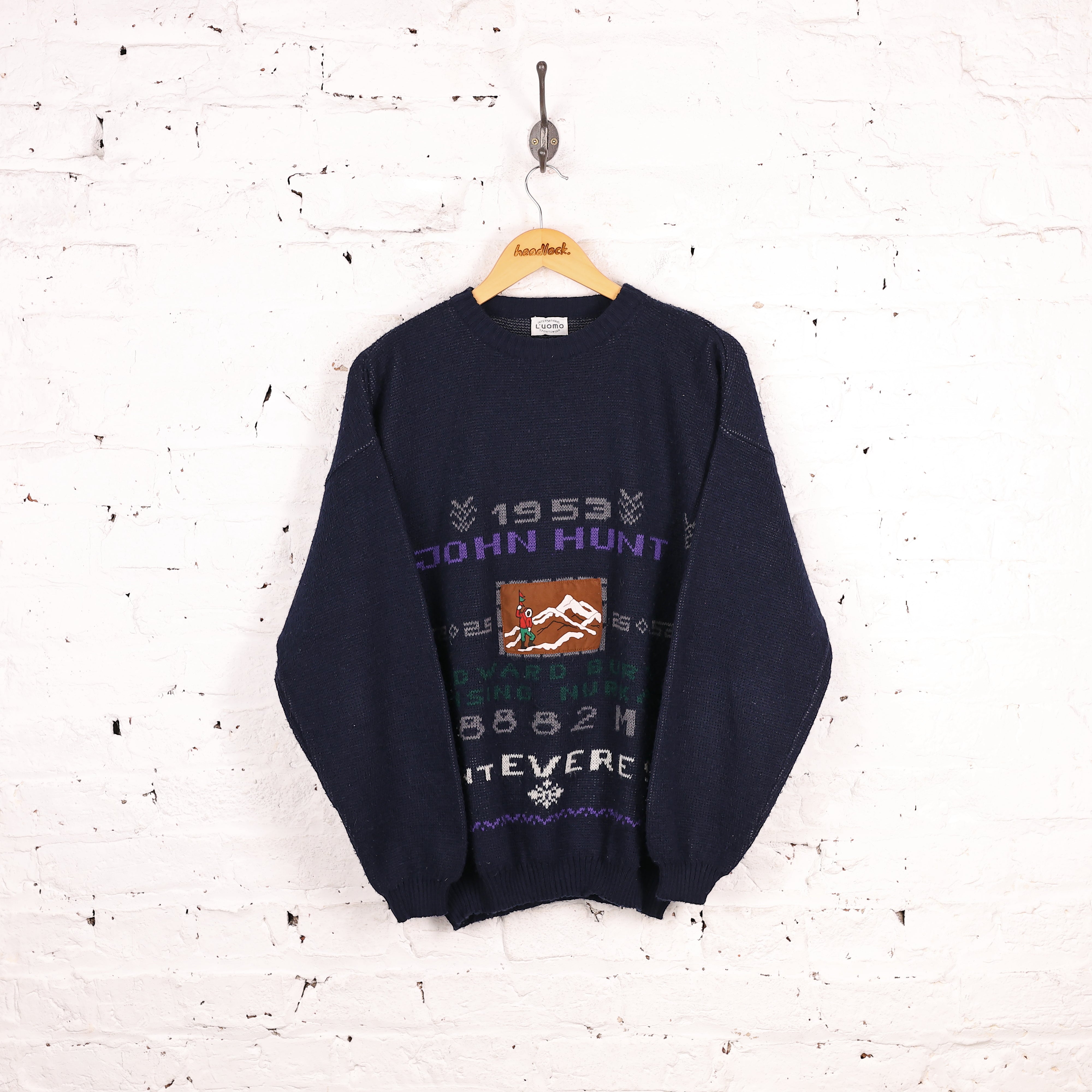 Good condition, slightly bobbled fabric. John Hunt Everest Knit jumper in blue with stitched image on the front. Celebrating that great expedition.