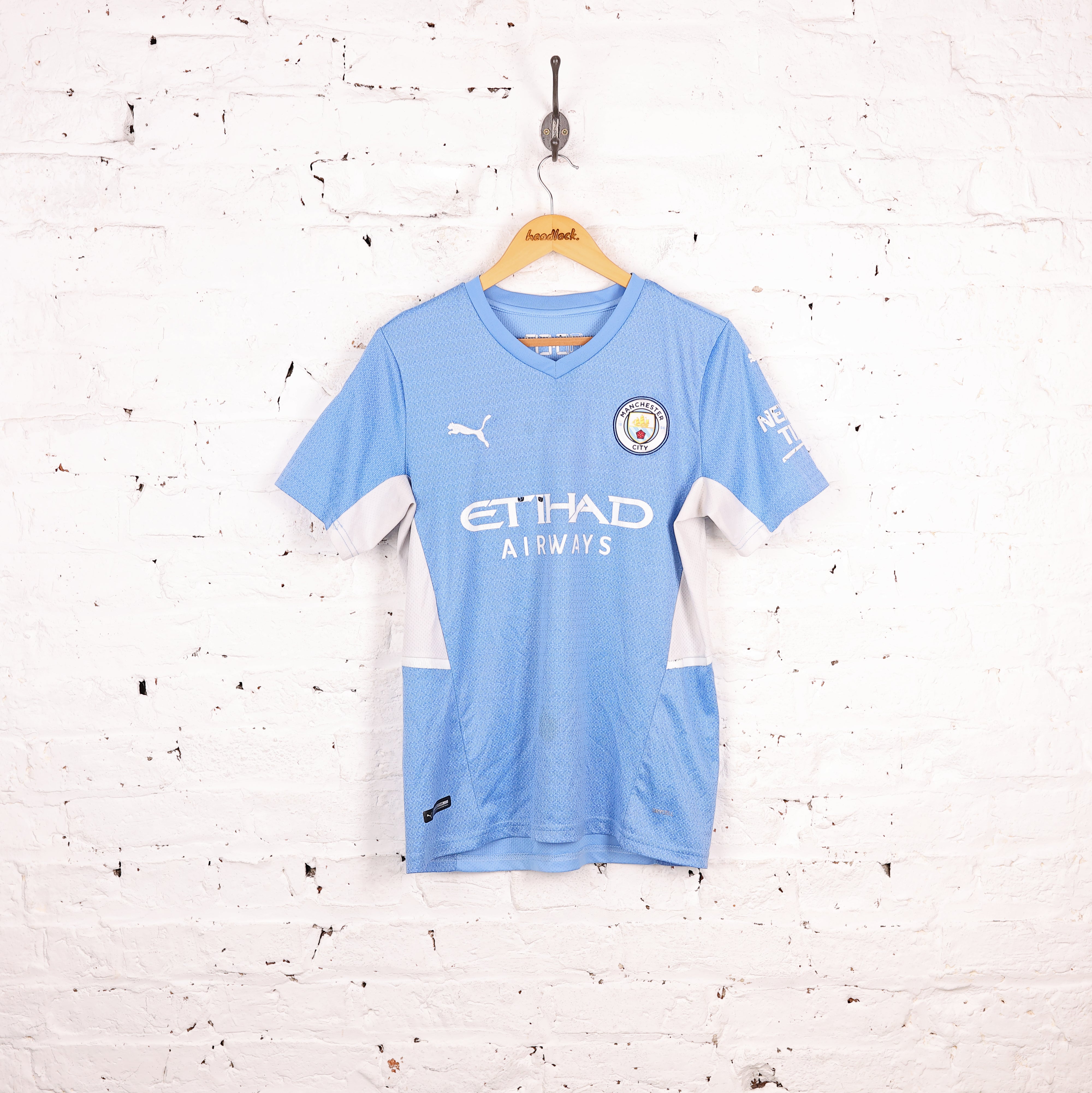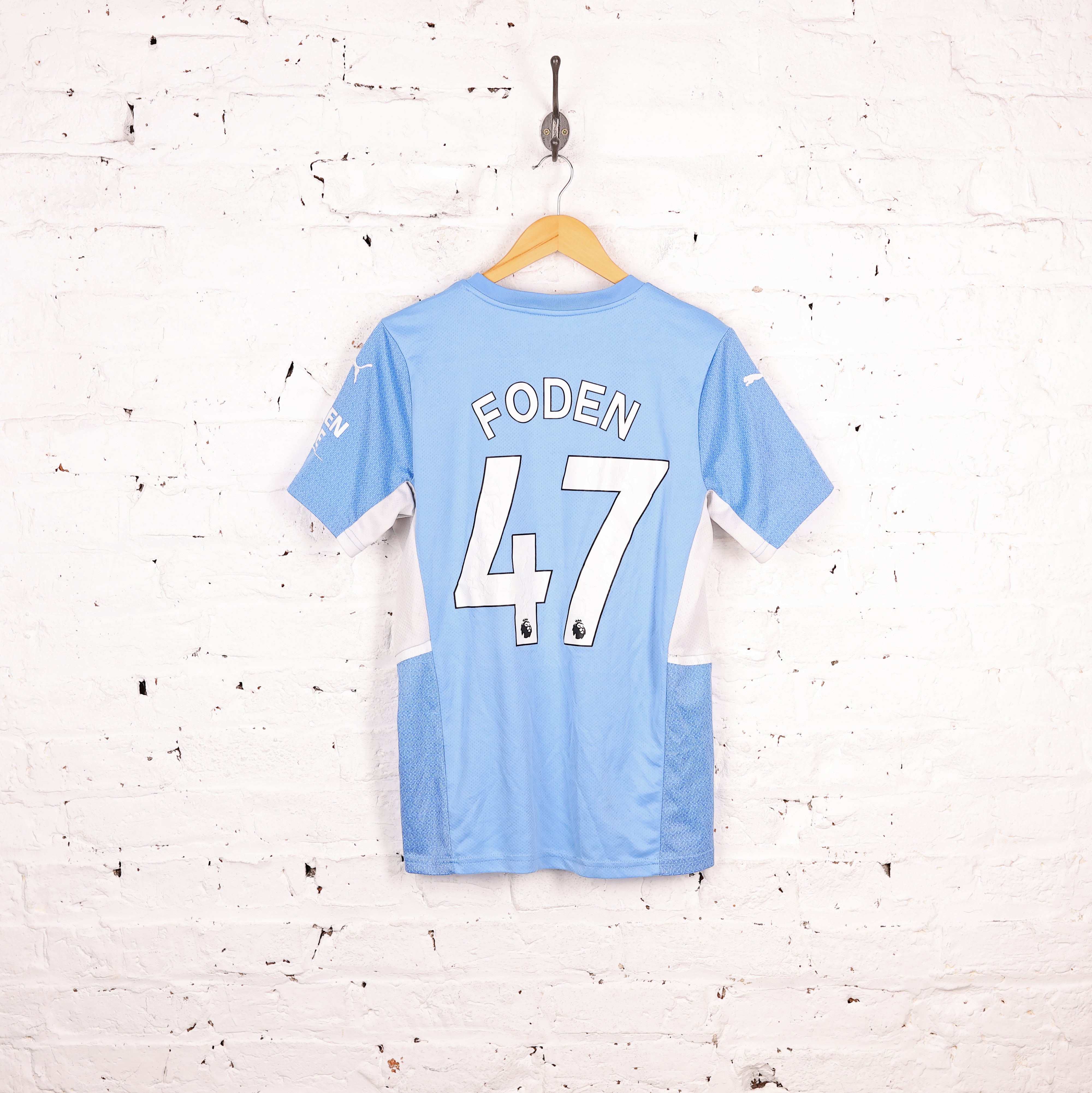 Fair condition, some damage and wear to sponsor on the front number on the back. Manchester City home shirt from 2021 Premier League season with Foden no. 47 on the back. Made by Puma with stitched badge and logo and 'Etihad Airways' sponsor.