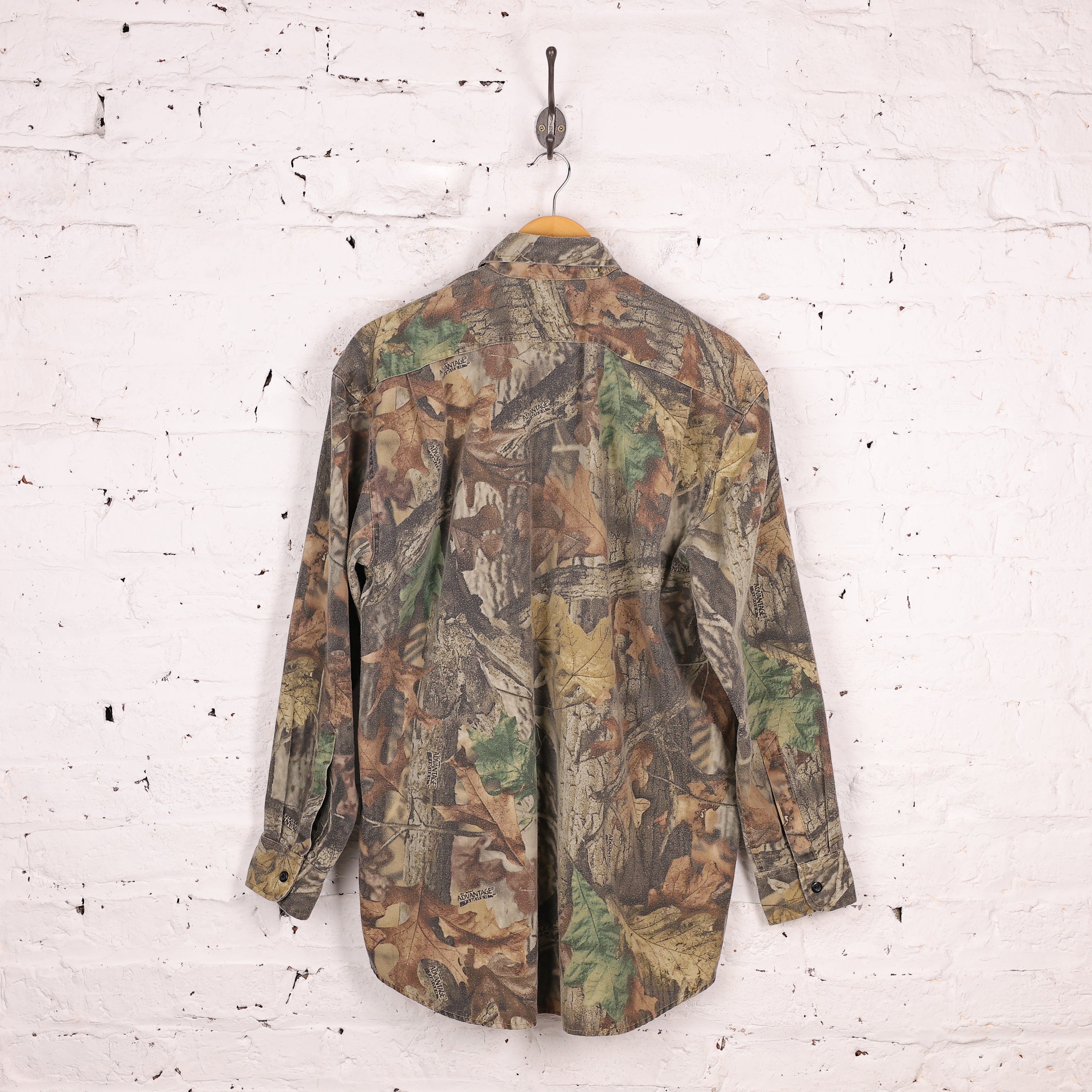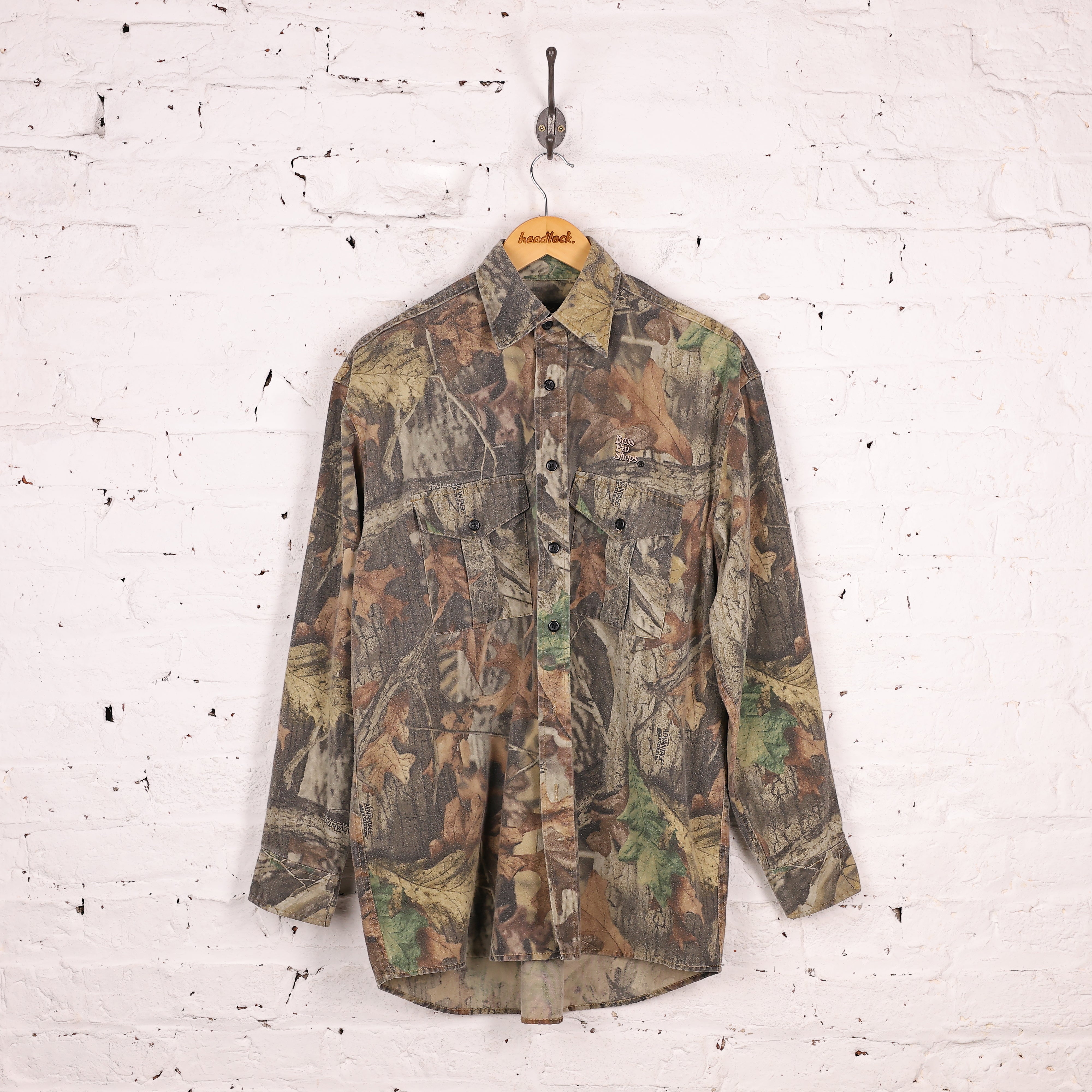 Good condition but missing bottom two buttons. Real Tree camo shirt with chest pockets, made by Bass Pro Shops.