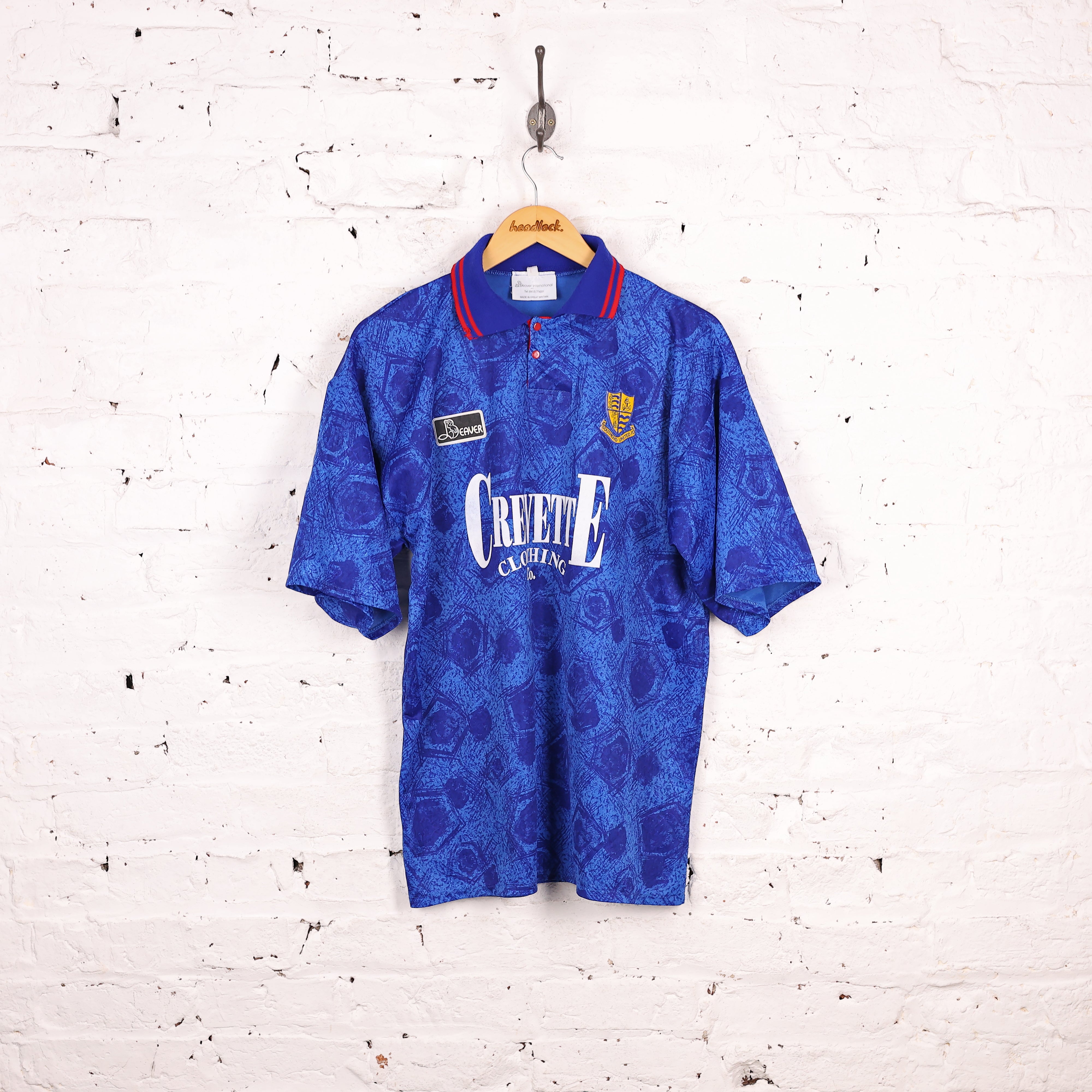 Excellent condition. Southend United home shirt from 1994-95 season made by Beaver with Crevette sponsor with button collar fasten in great 90s print fabric.