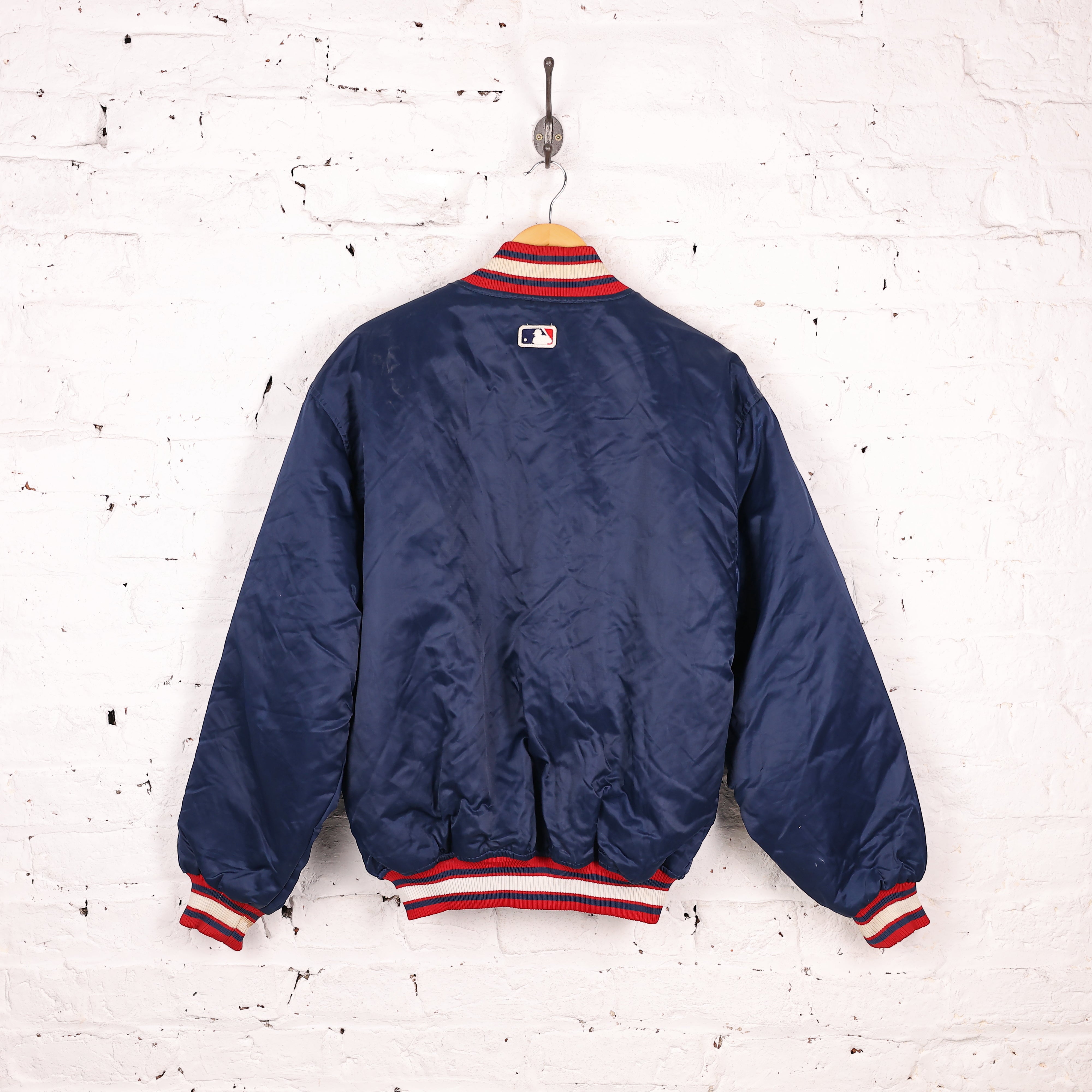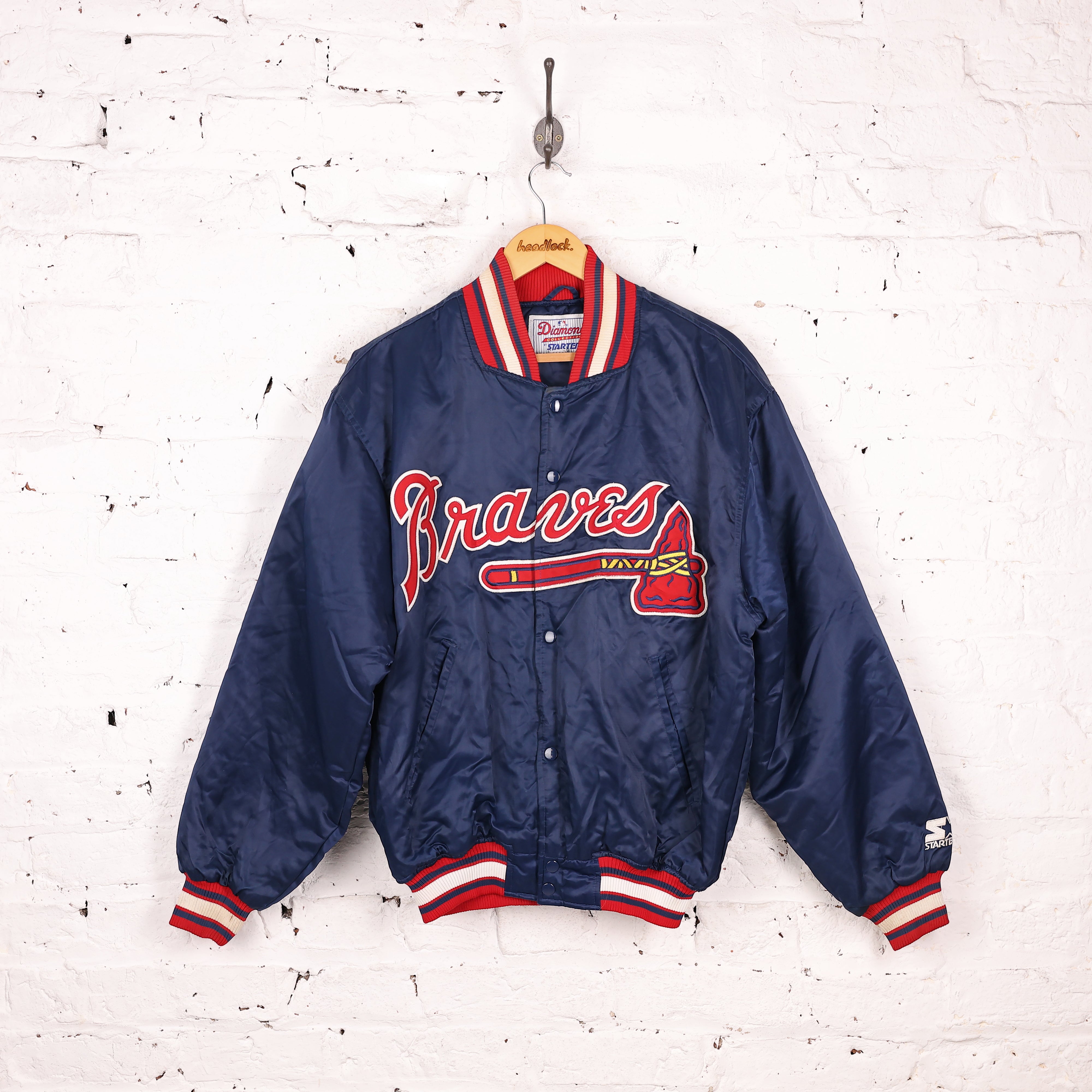 Good condition. Braves Baseball Starter jacket in blue with stitched logo across the chest, two pockets, popper button fastening and red quilted lining.