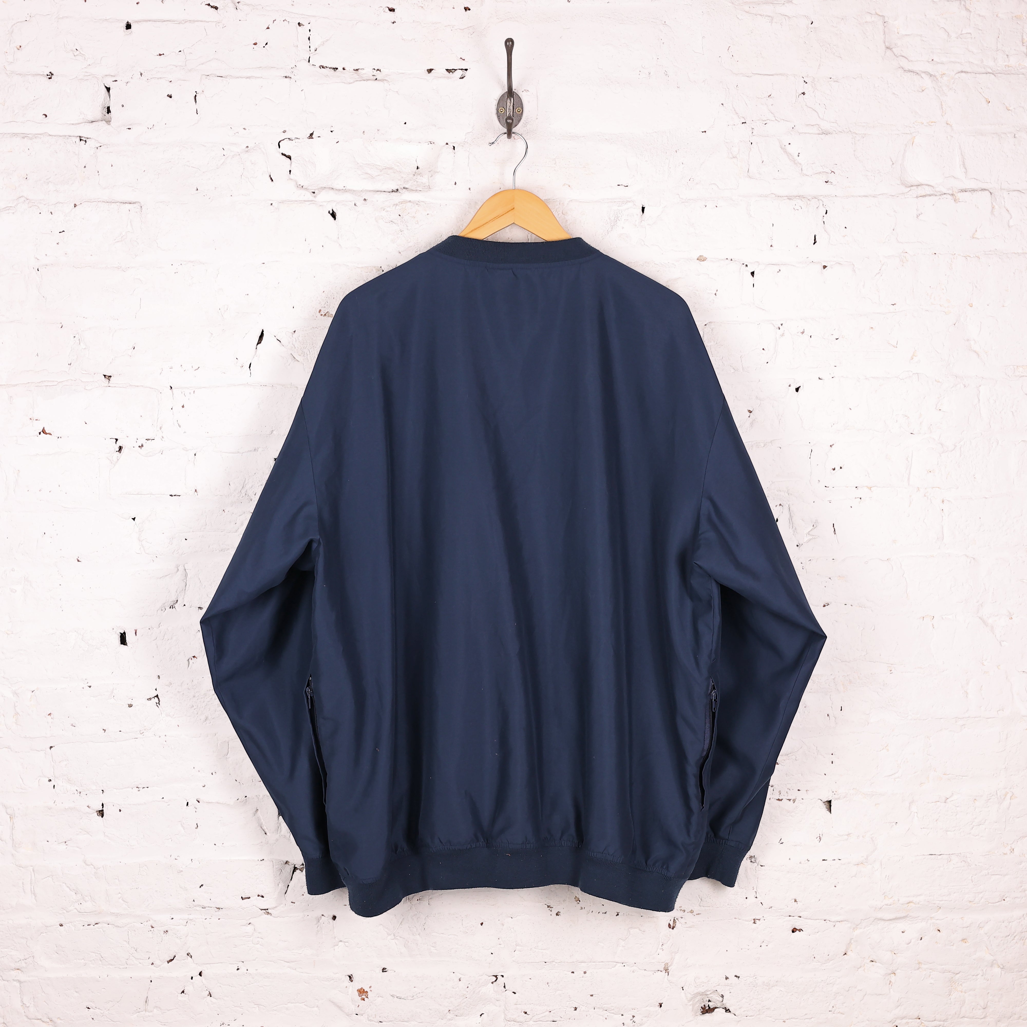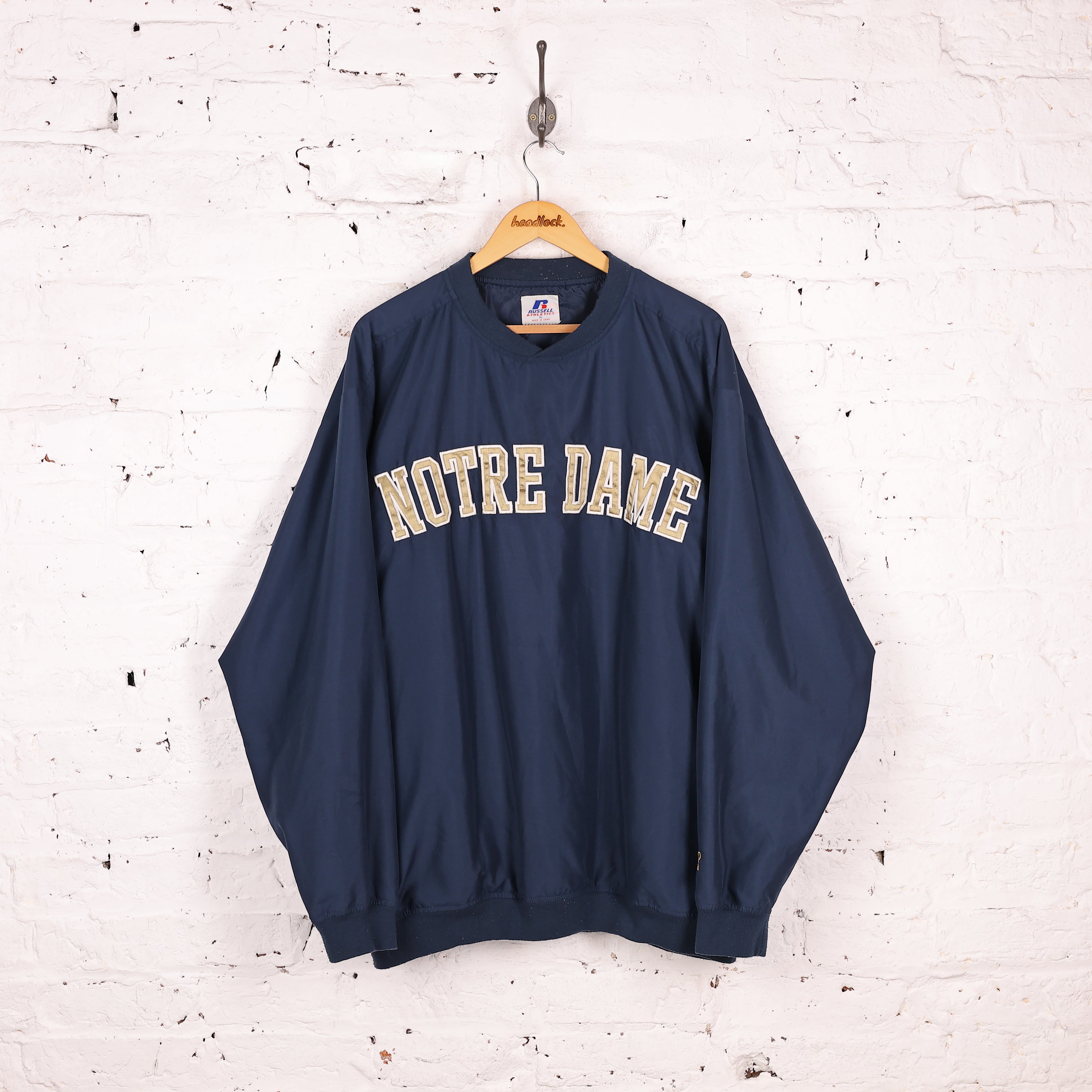 Excellent condition. Norte Dame drill top in blue with stitched spell out lettering across the chest, V neck and with two zip pockets.