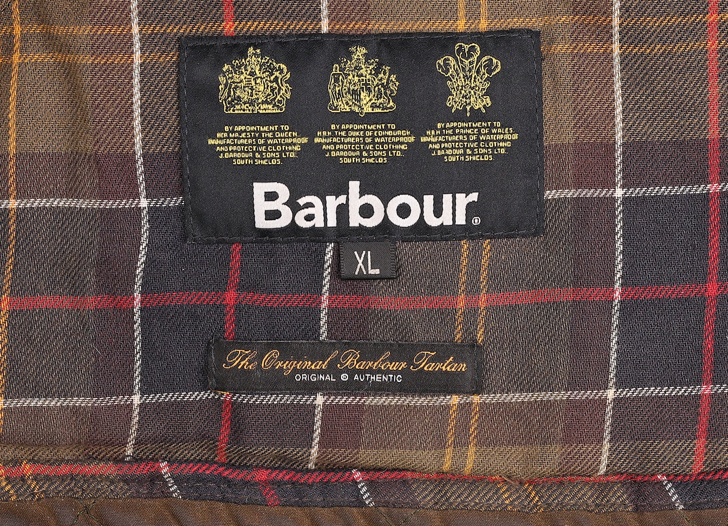 Good condition but worn outer. Barbour Chelsea quilted wax jacket in green with three outer pockets, cord collar and check inner lining.
