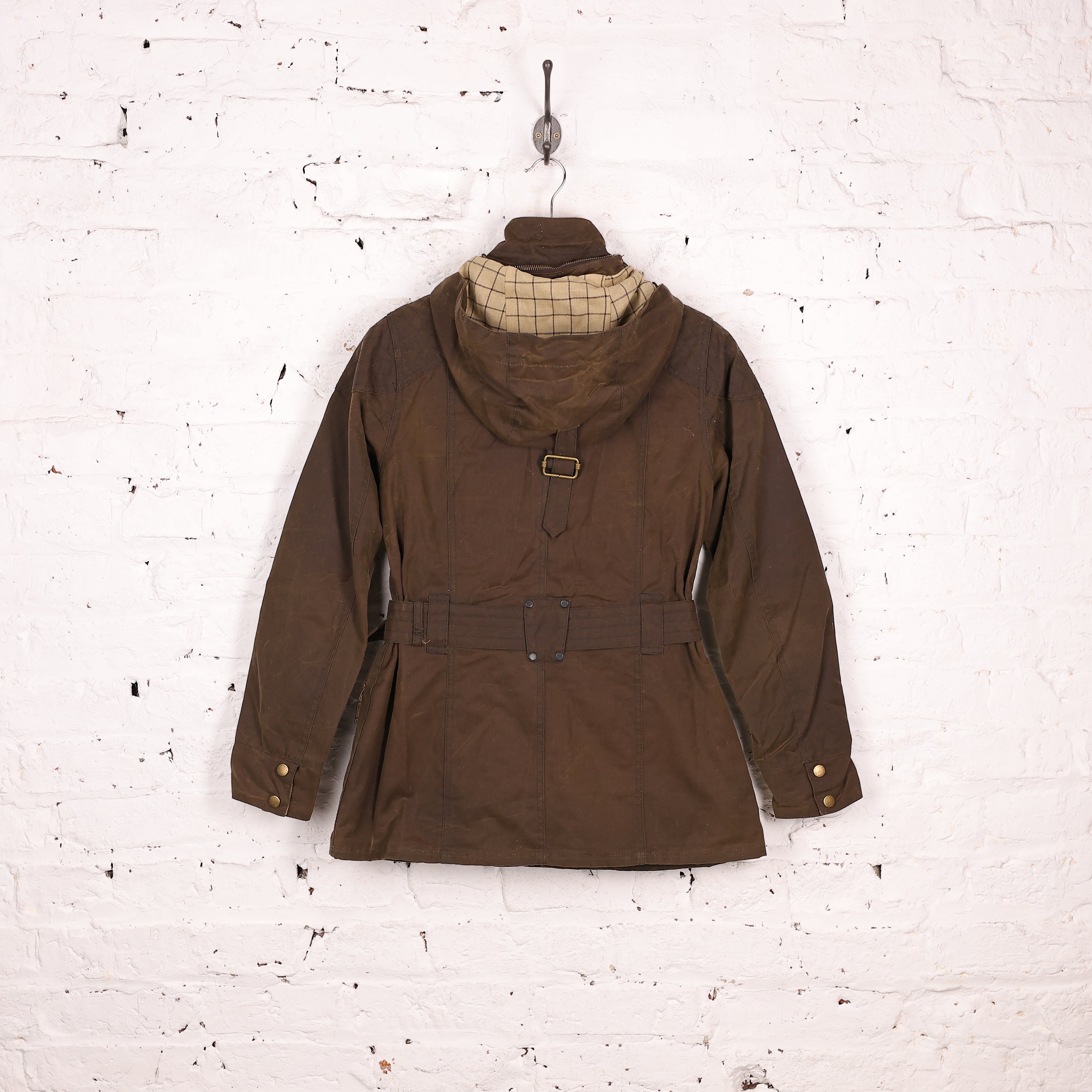 Good condition, slight wear. Barbour Rebel wax jacket in brown with beige chek inner lining, four outer pockets, zip fasten and waist belt. UK Size 10