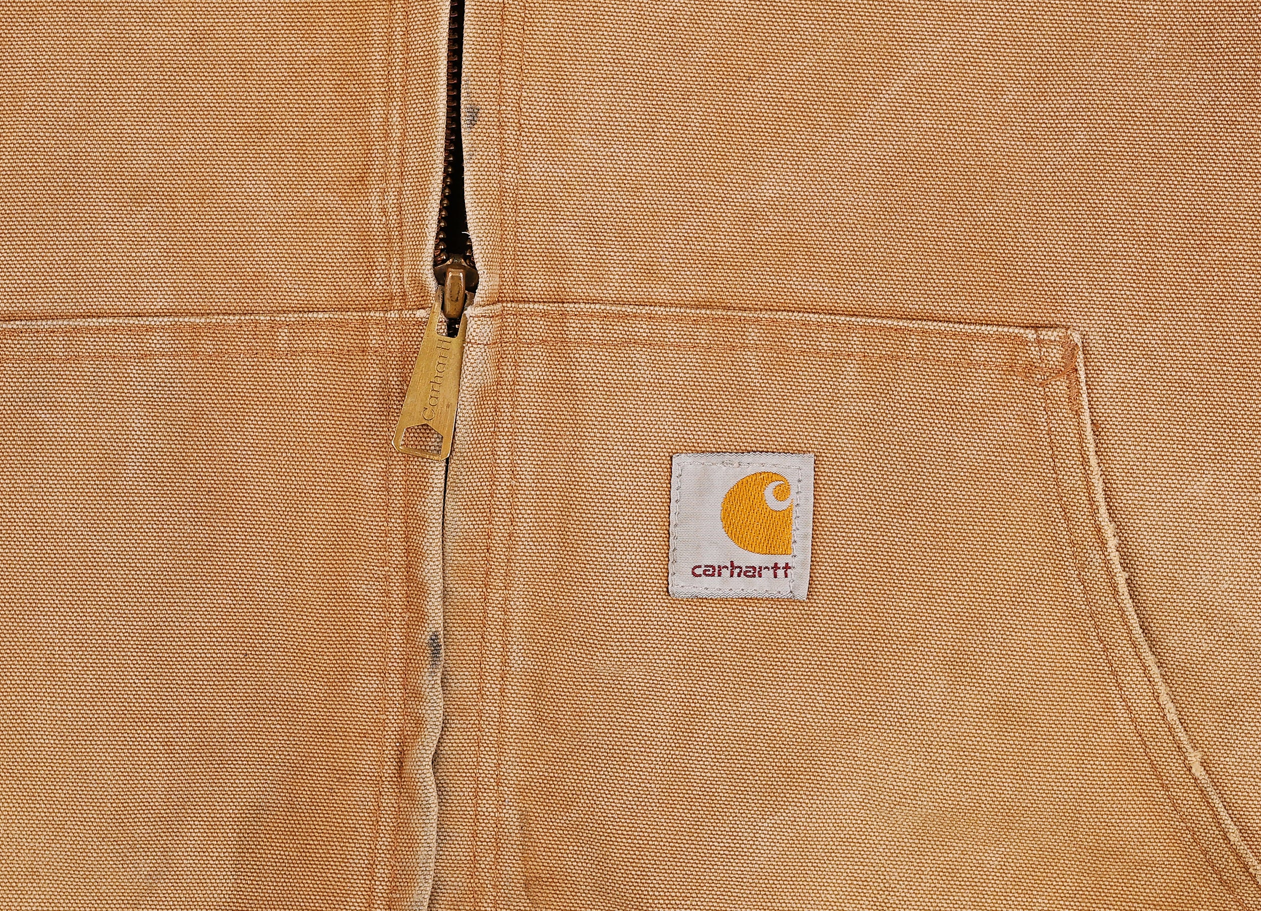 Good condition but some work marks to the front, black dots and small marks. Carhartt work jacket in sand with front pocket and stitched tab logo.