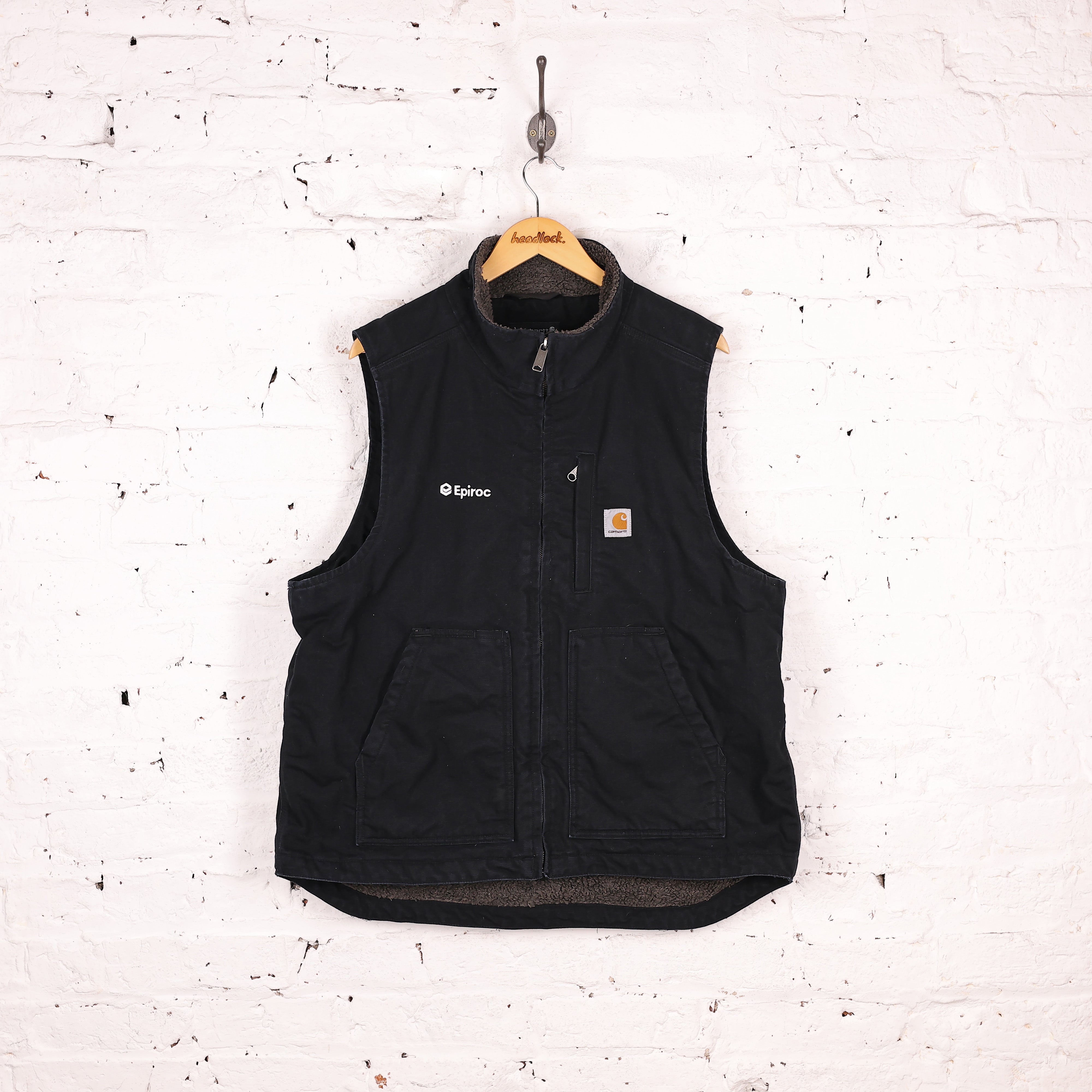 Excellent condition. Carhartt loose fit gilet with fleece inner lining, three outer pockets, stitched Carhartt tab and zip fasten. Epiroc stitched on the chest.