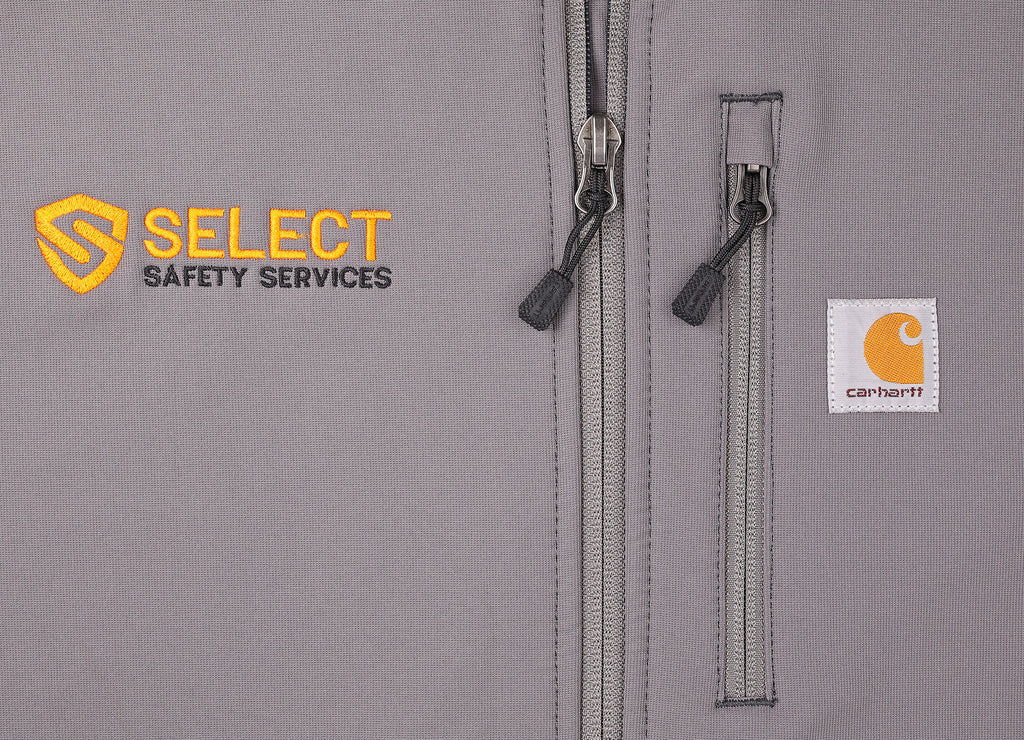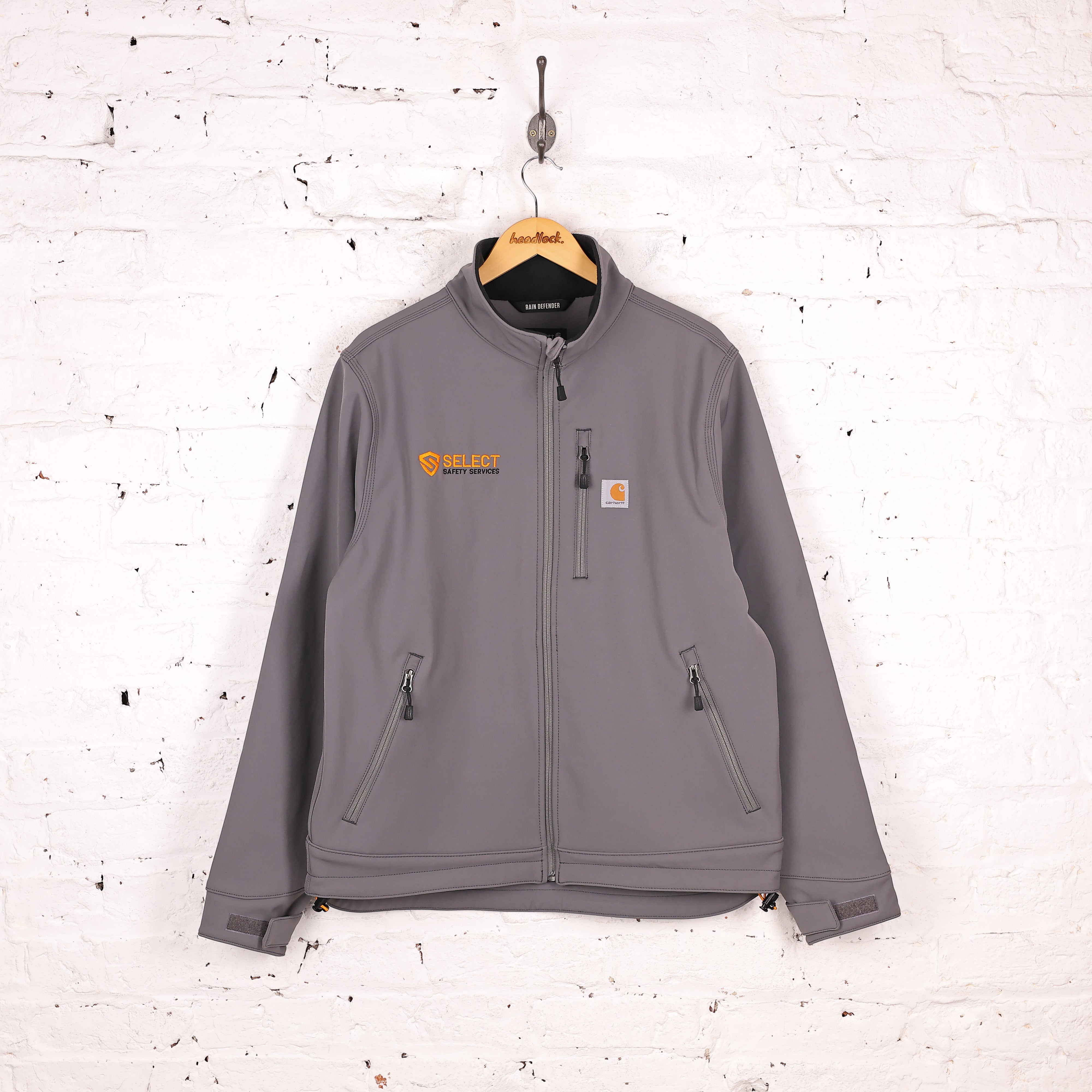 Excellent condition. Carhartt shell jacket in grey with zip pockets, fleece lining and stitched Select Safety Services. Relaxed fit.
