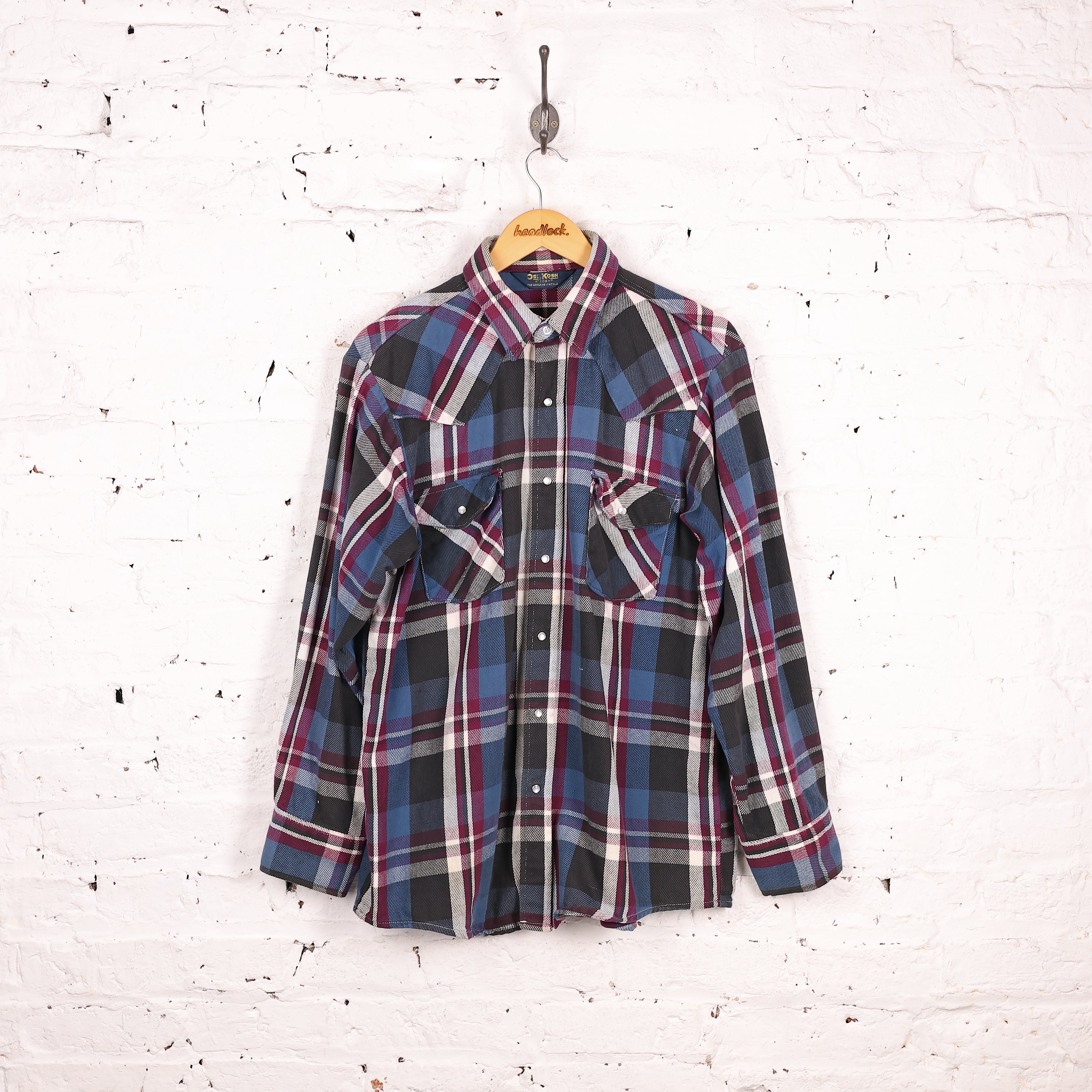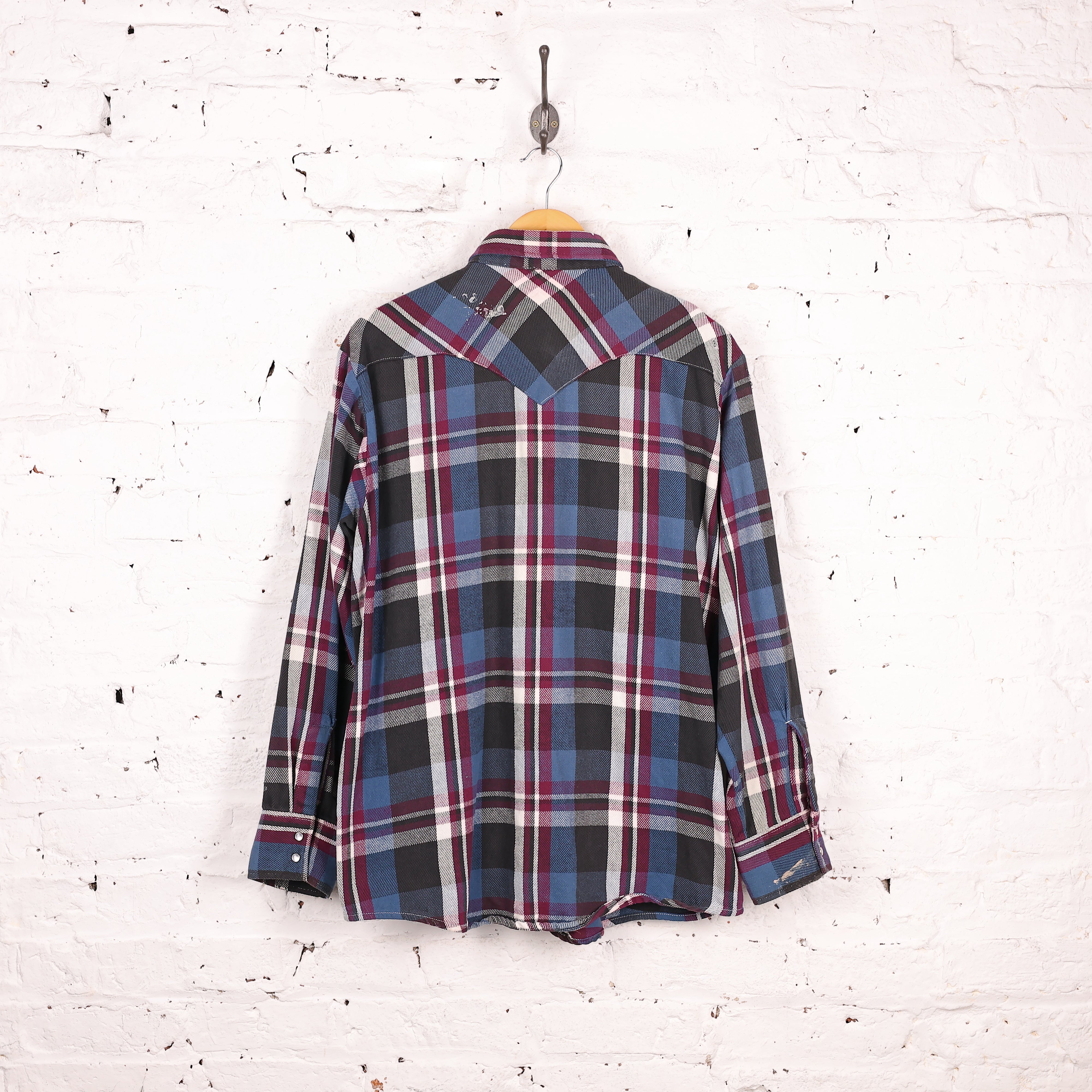 Good condition but some very small paint spot marks and small pulls. OshKosh check shirt in blue, white and maroon colours, popper button fastening and two chest pockets.