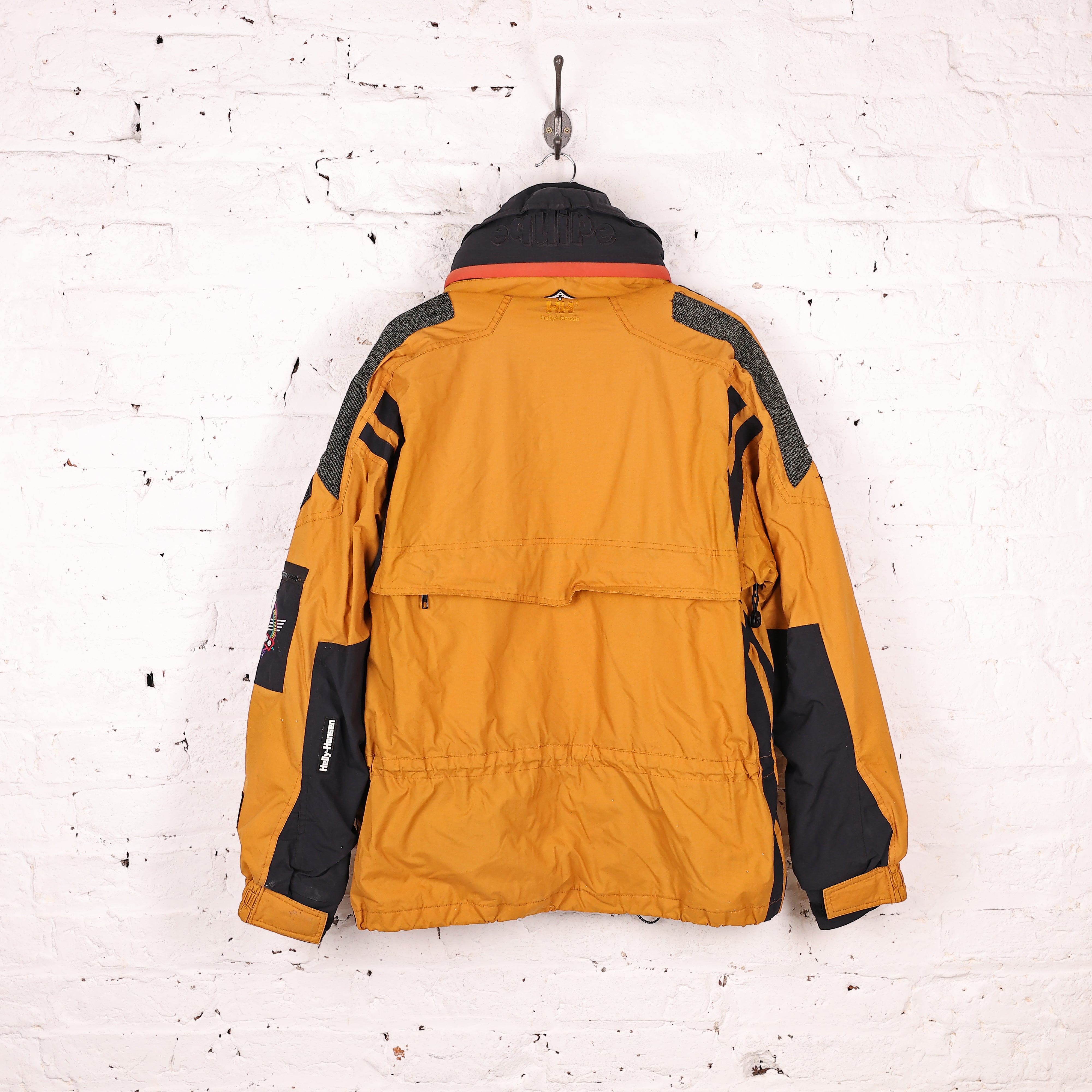 Good condition, slight wear. Helly Hansen Equipe jacket in orange with lining, zip pockets. stitched lettering and hood in the collar.