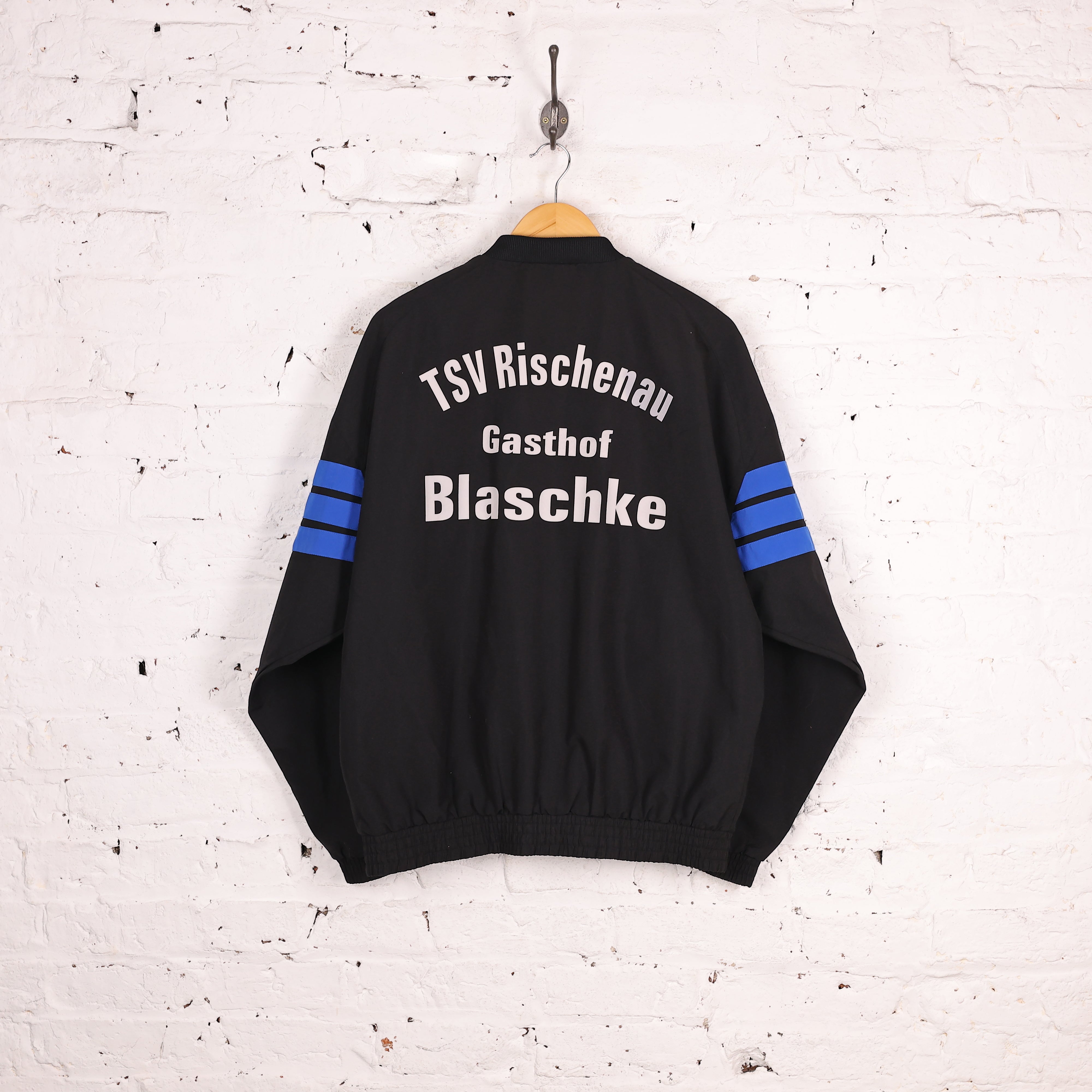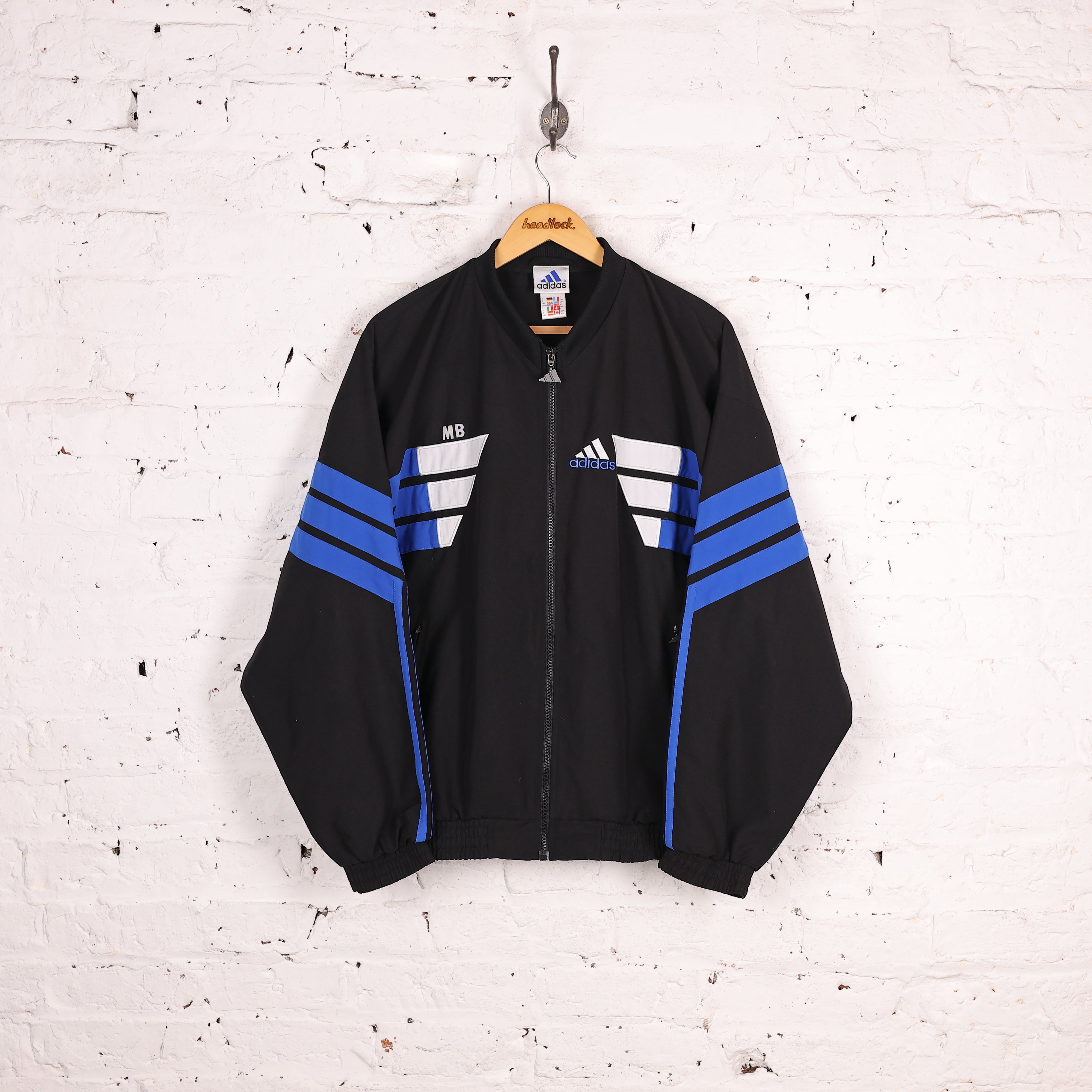 Excellent condition. Adidas 90s bomber style tracksuit top in black, blue and white colours, stitched logo and zip pockets.