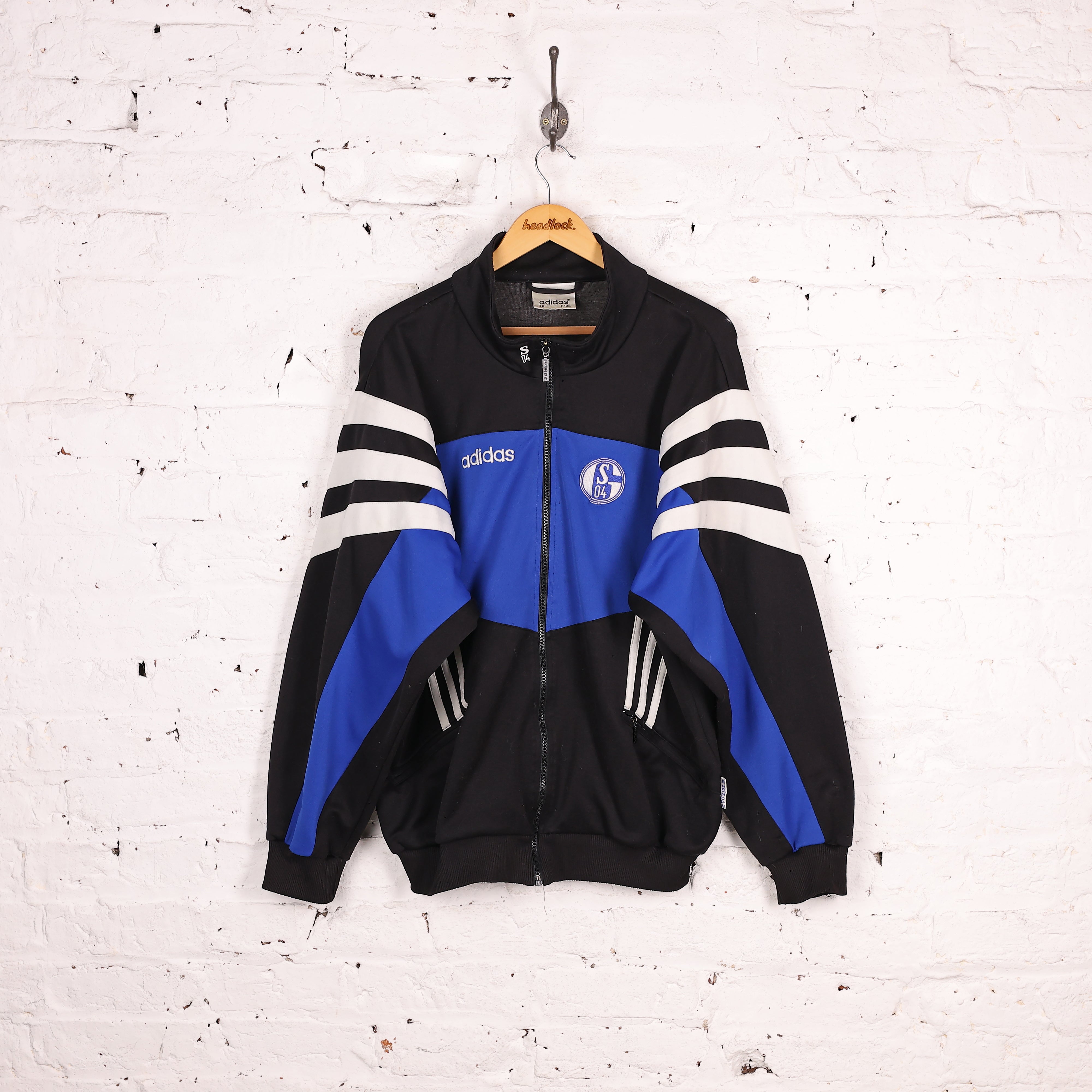 Good condition, some small wear. Adidas Schalke football tracksuit top jacket in blue and black colours with stitched badges and zip pockets.
