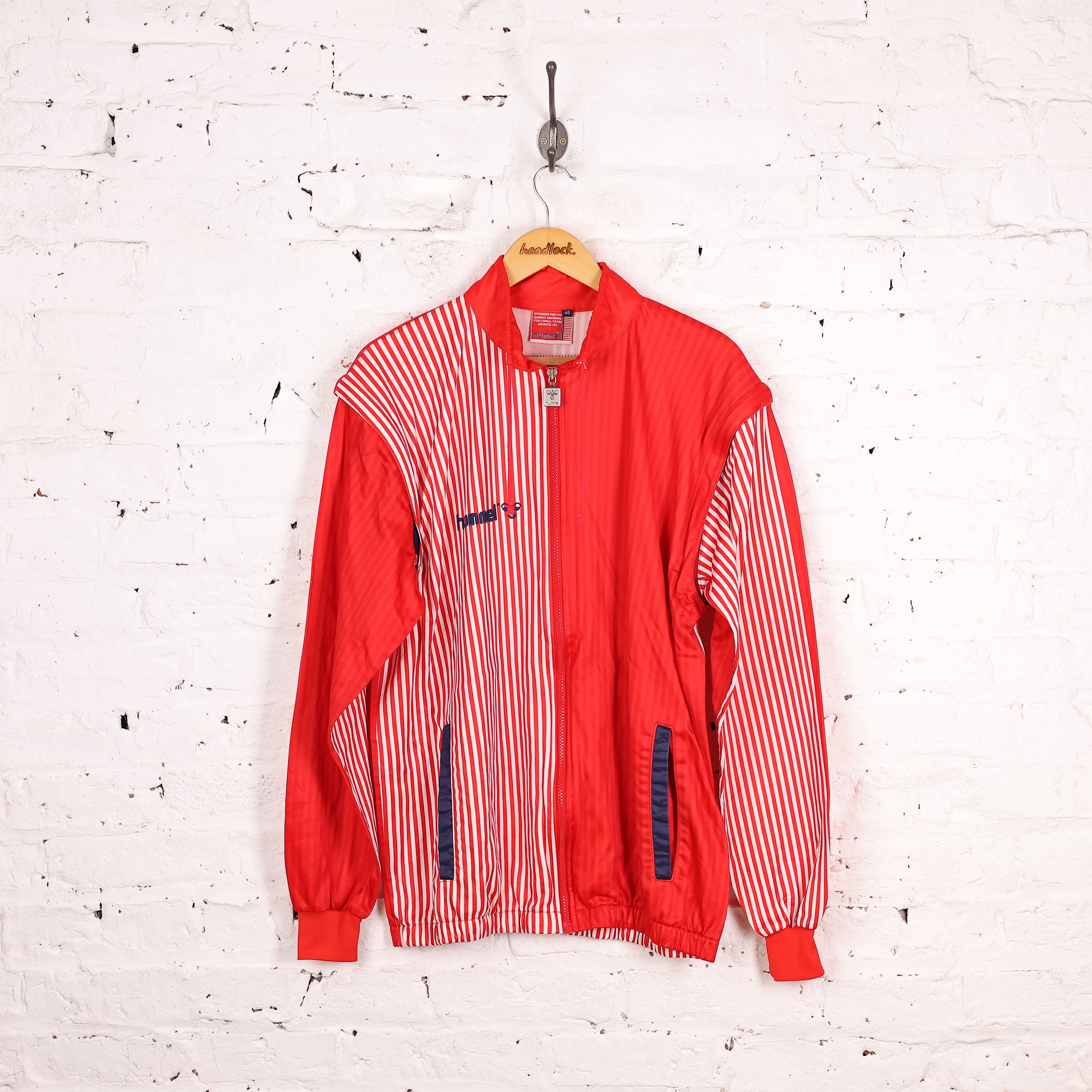 Excellent condition. Hummel 90s tracksuit top in red and white stripe, two pockets and stitched logo on the chest. Zip off sleeves.