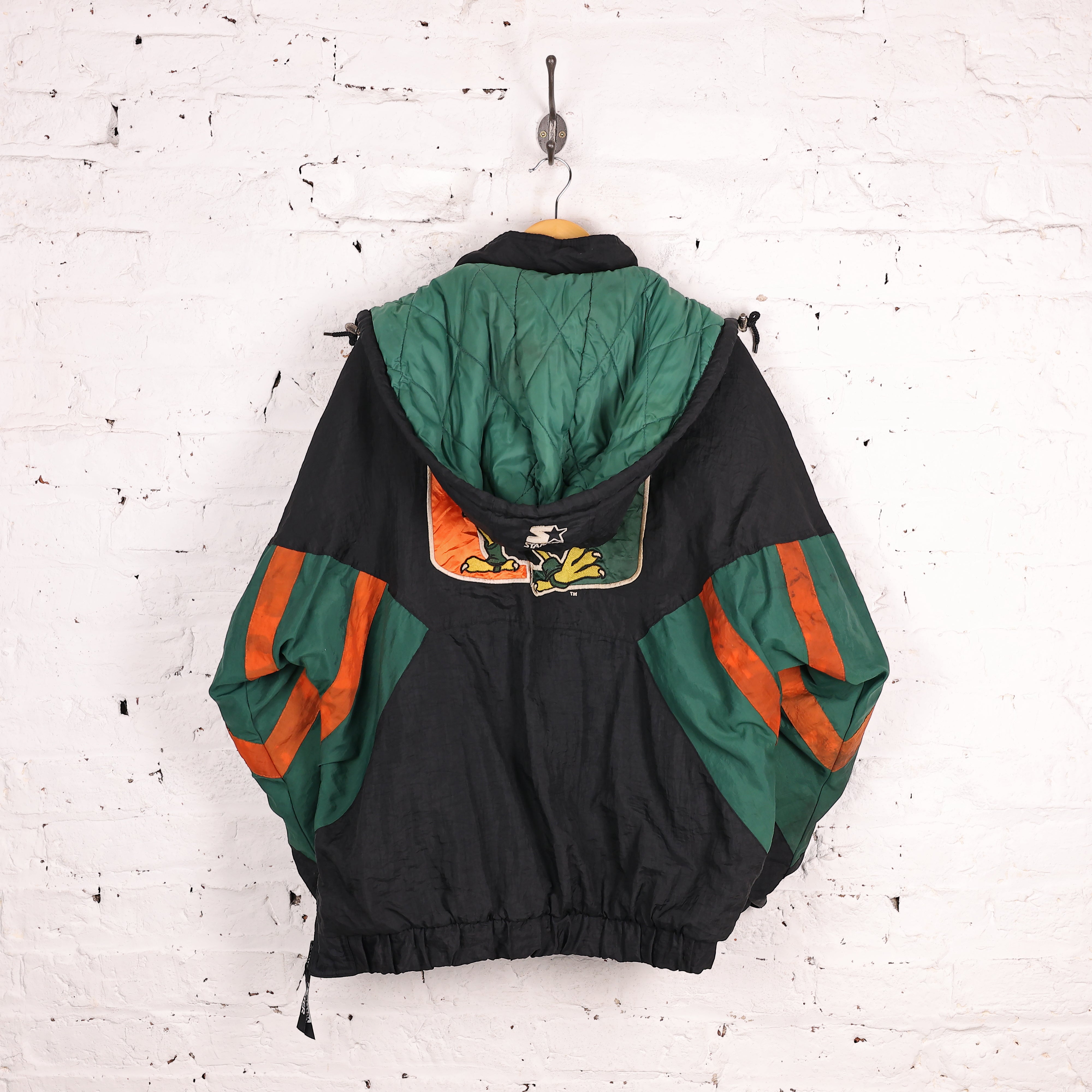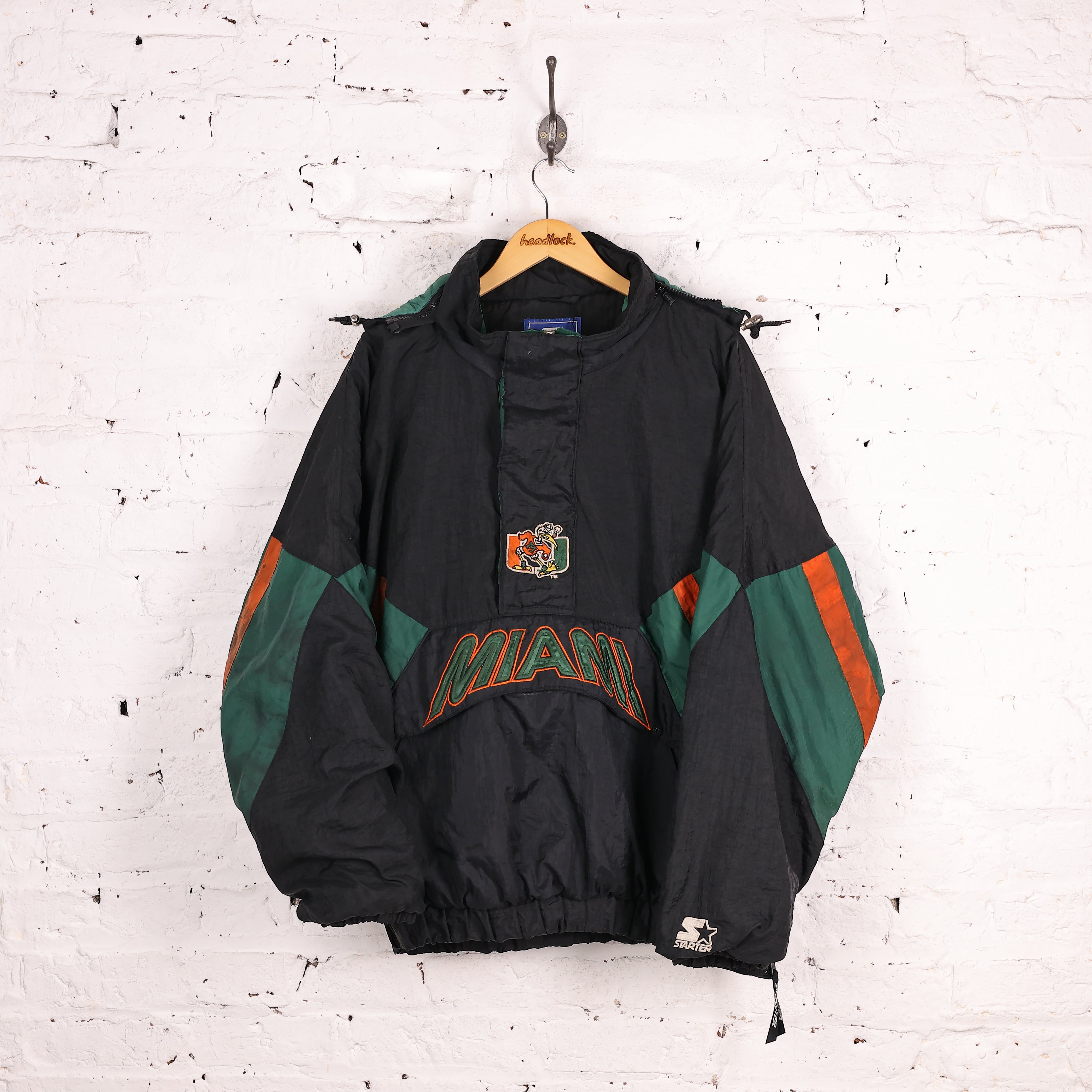 Good condition, some slight wear. Miami Hurricanes jacket in black, green and orange colours, 1/4 zip fasten and with front pocket.