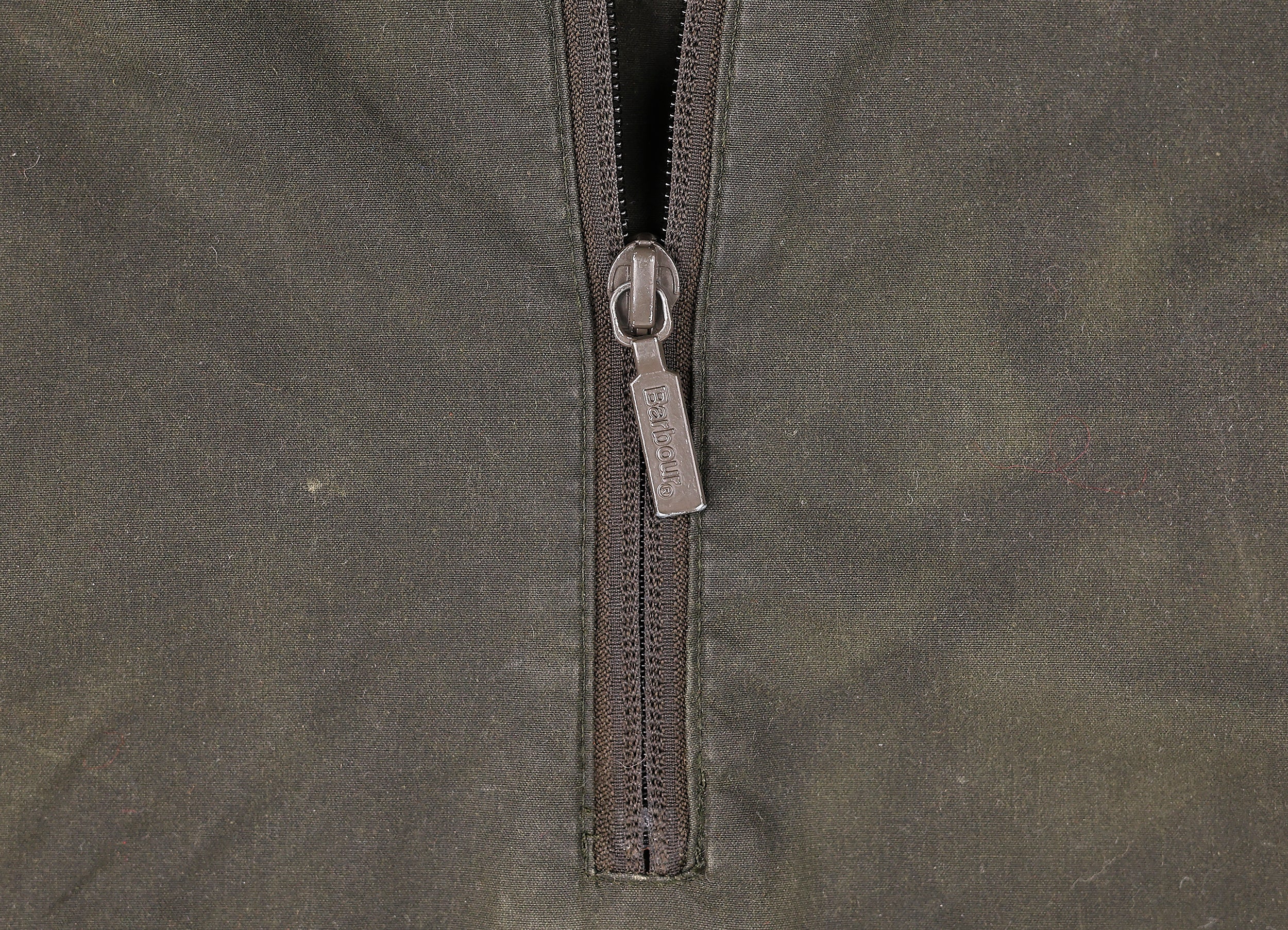 Good condition, some slight wear, missing badge from the arm and bottom drawstring. Barbour Smock wax jacket in dark green with zip front pocket.