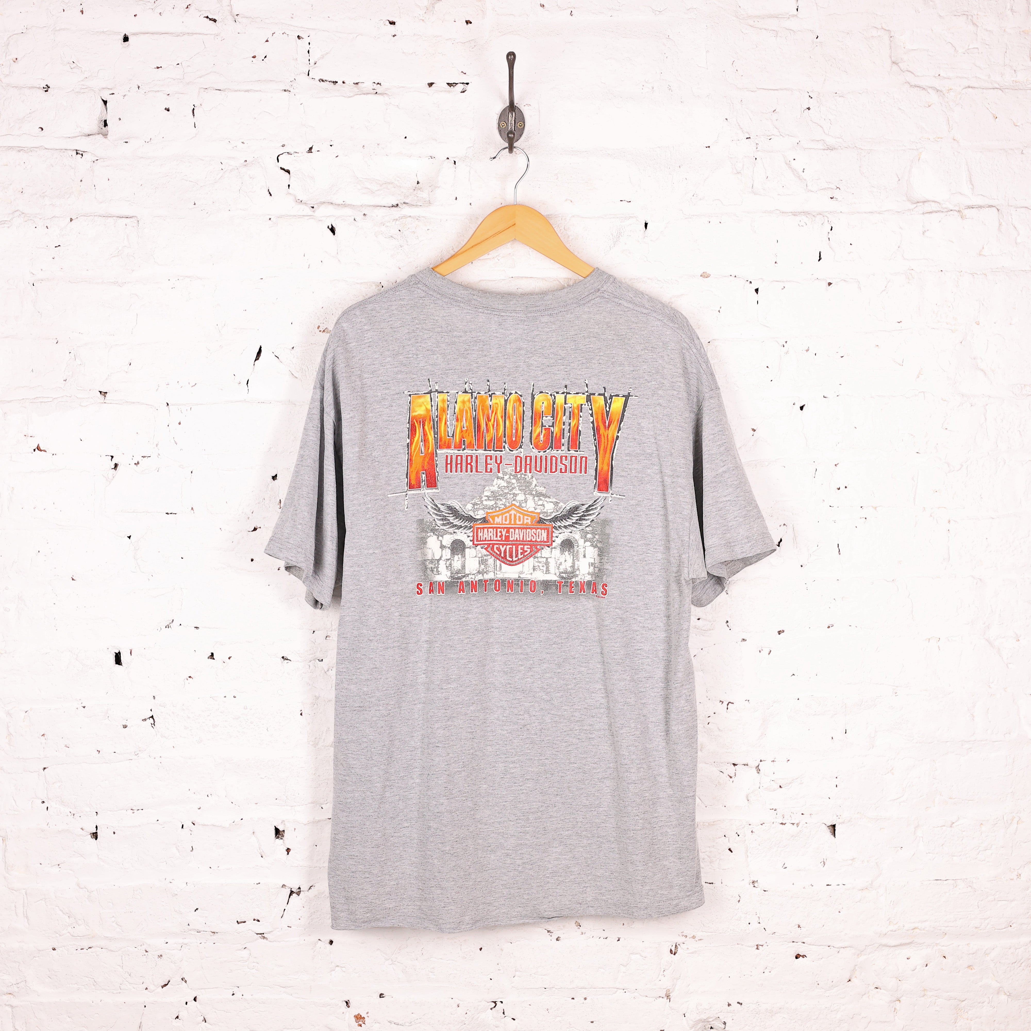 Good condition. 90s Harley Davidson, San Antonio T shirt in grey with flame print design on the back.