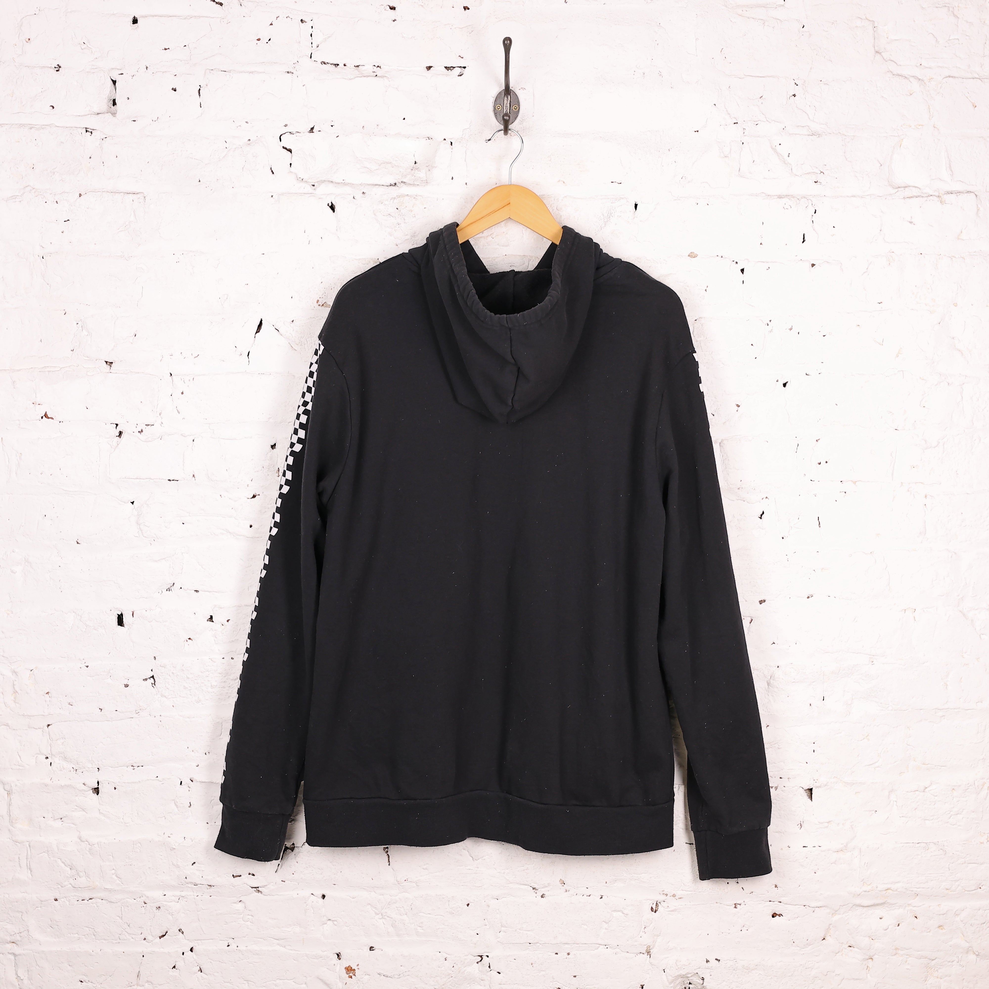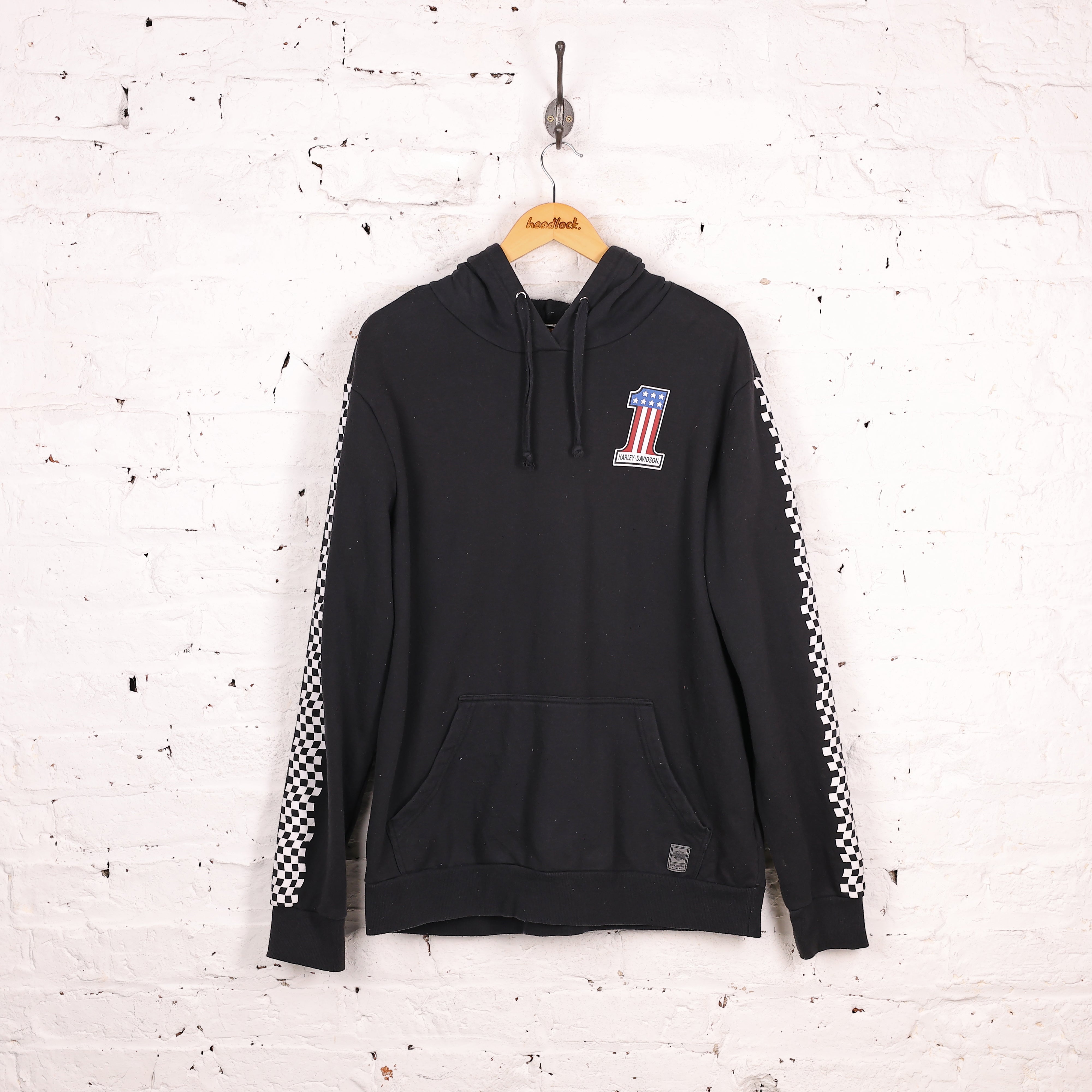 Good condition, slight bobbling to front pocket. Harley Davidson hoodie in black with America's Number 1 graphic on the chest and chequers down the sleeves.