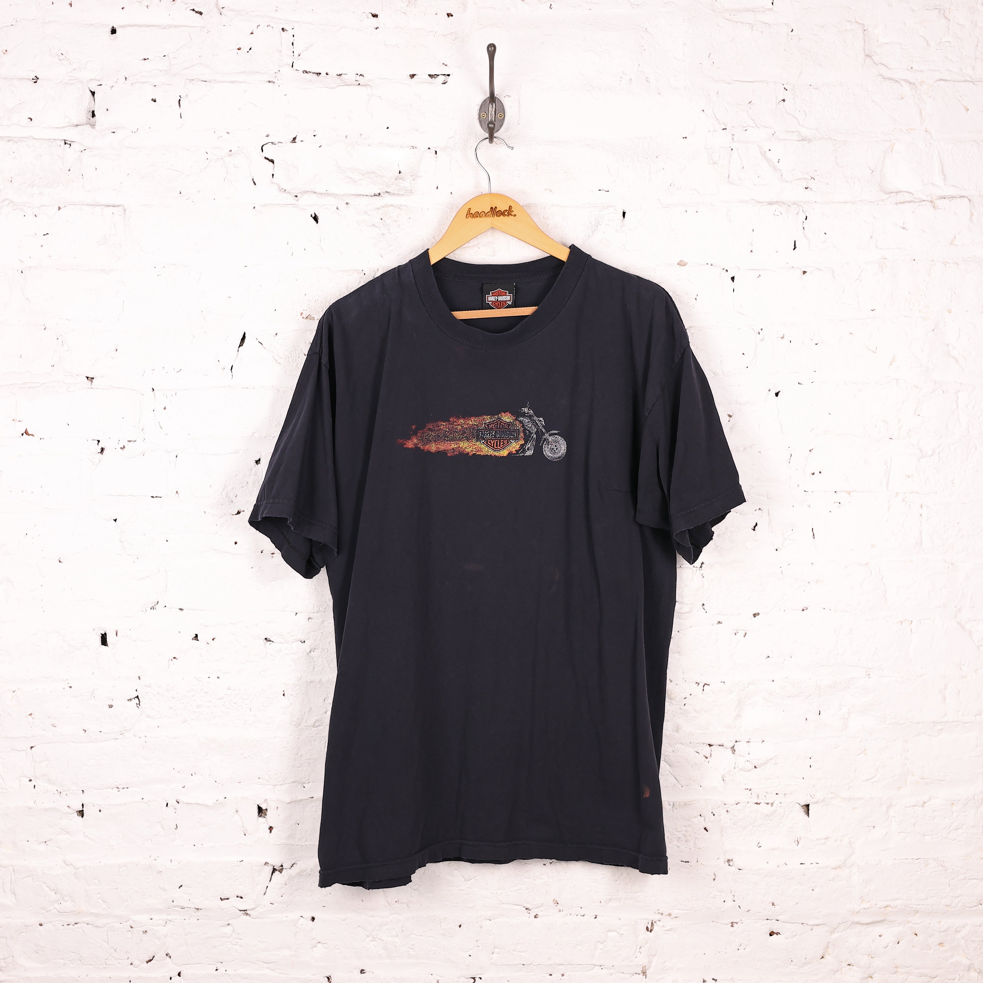 Fair condition, front graphic faded and small mark to low front left, stitching under left armpit. Harley Davidson t shirt in black with motorcycle graphic on the front.