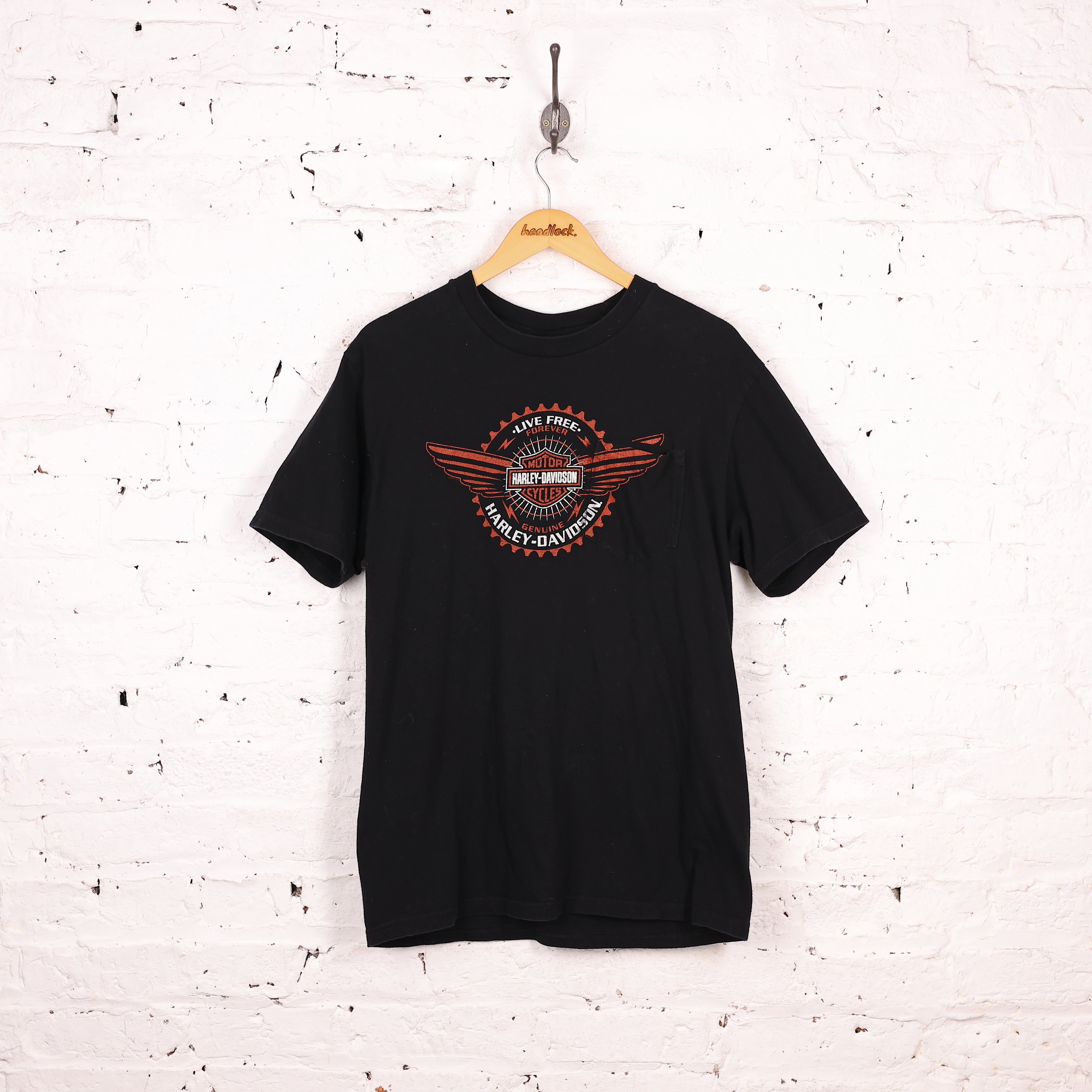 Good condition. Harley Davidson T shirt in black with chest pocket and Miss Caliente 2012 graphic on the back.