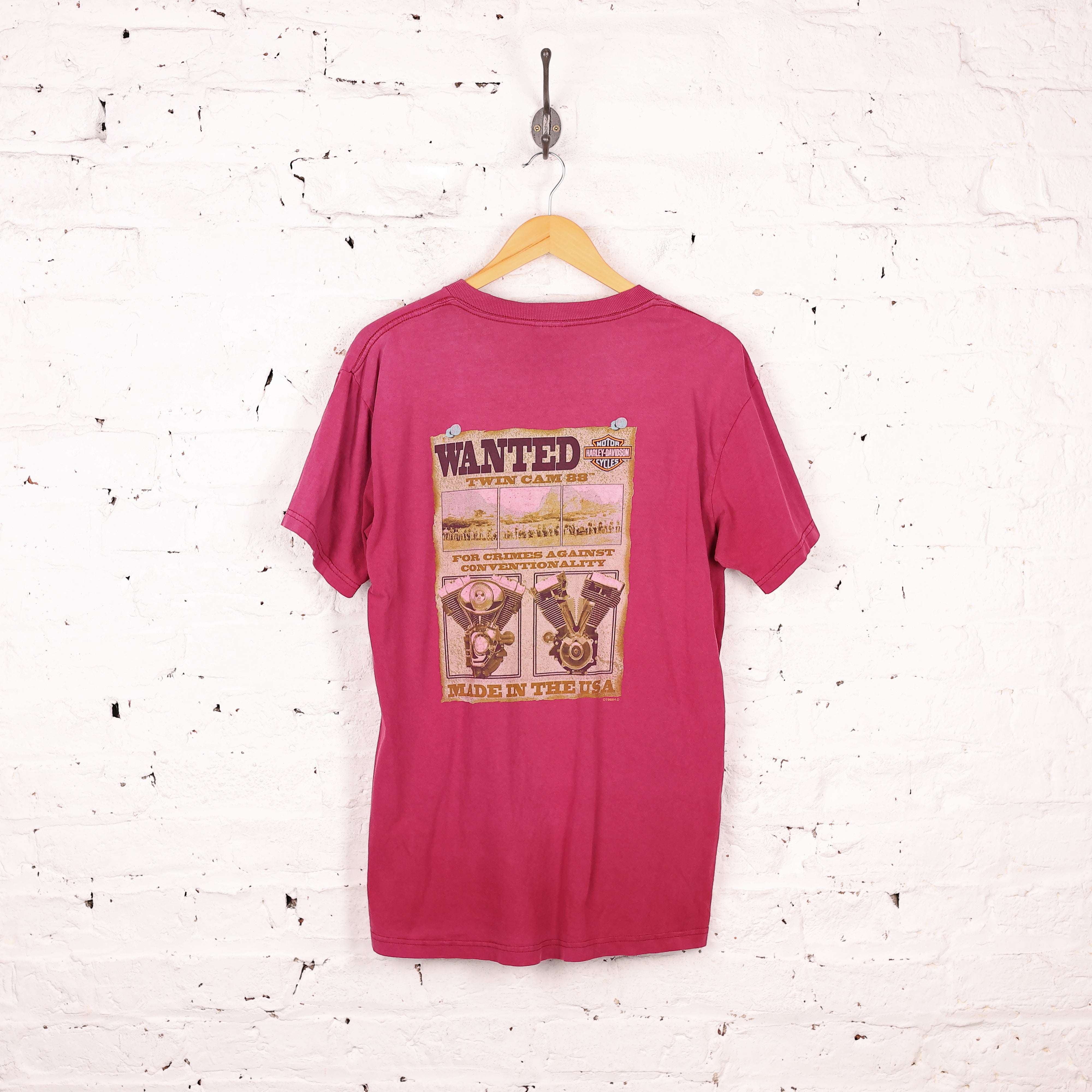 Good condition. Harley Davidson t shirt in pink with most wanted poster graphic on the back.