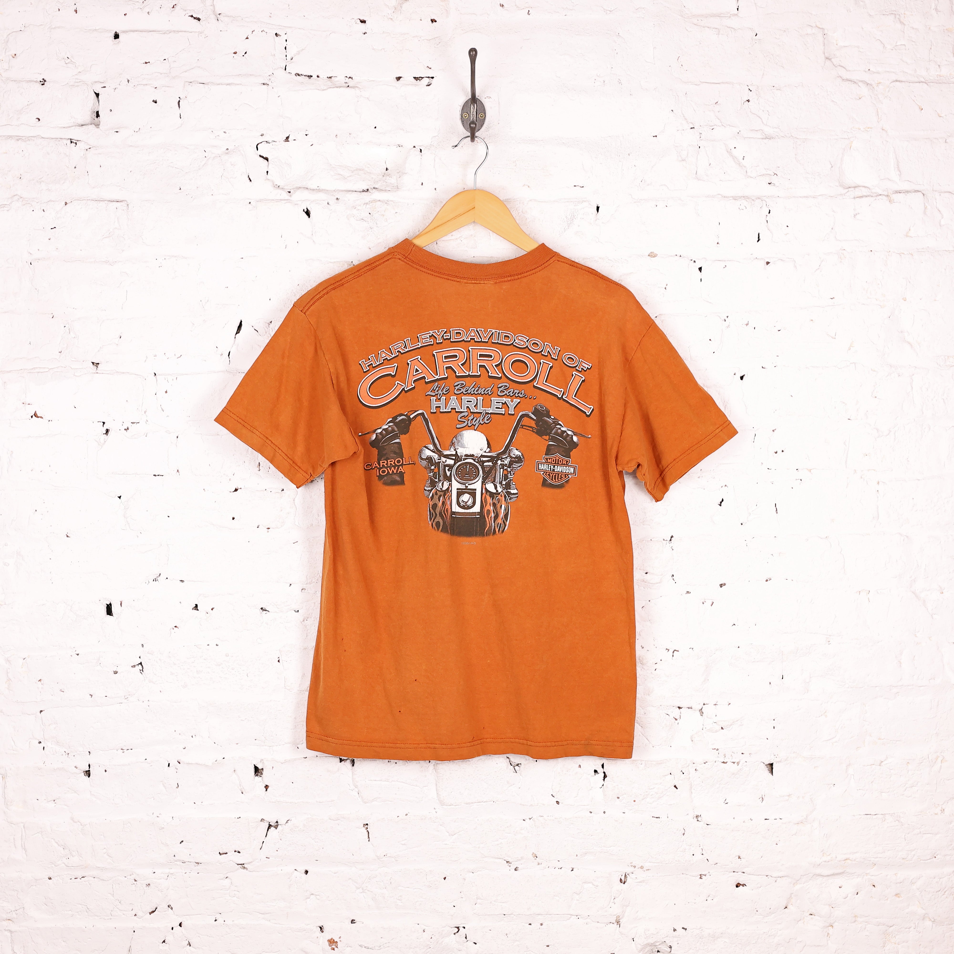Good condition, small hole to bottom left. Harley Davidson, Carroll Iowa T shirt in orange with clown design on the front.