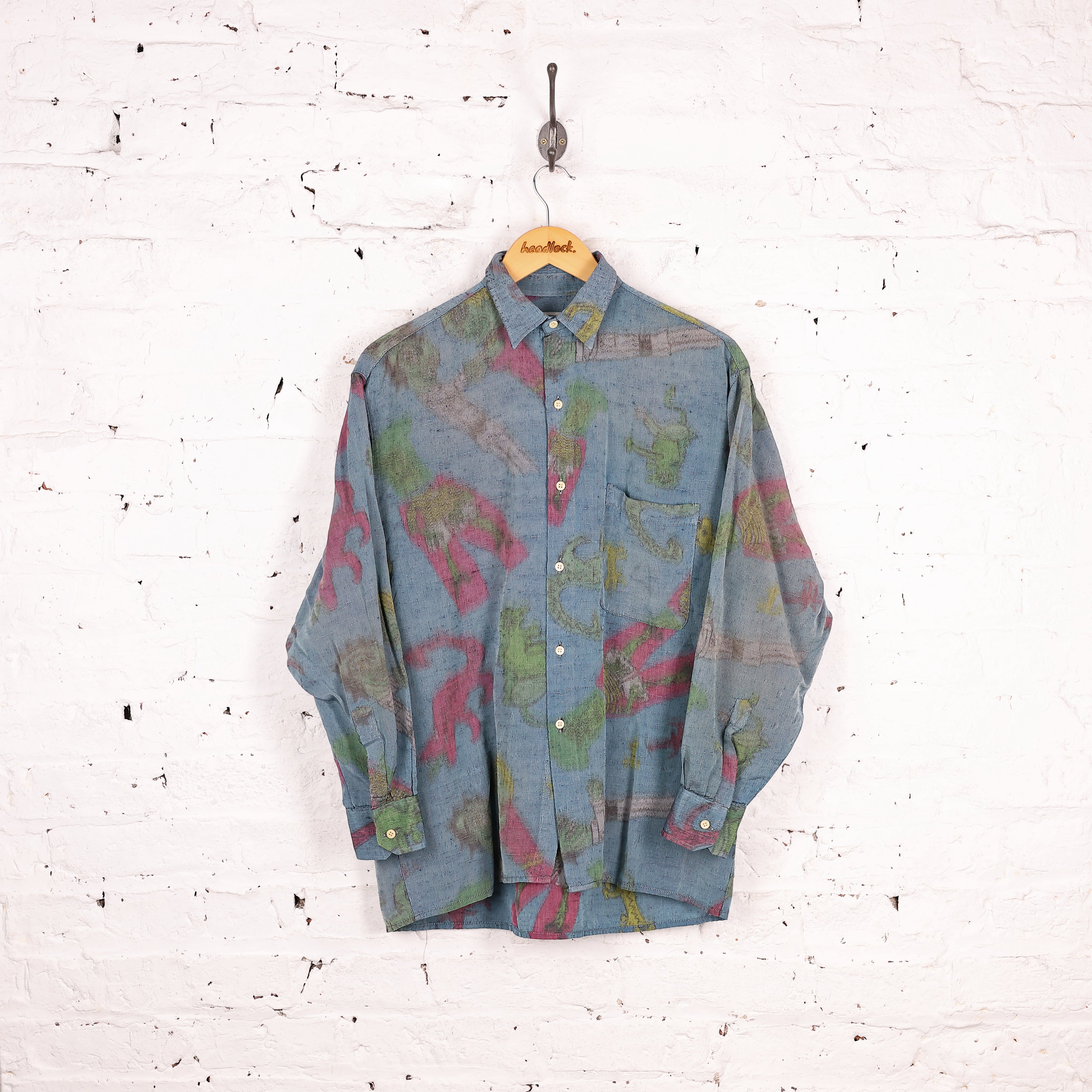 Good condition. 90s Long Sleeve Pattern Shirt in blue, green and pink with chest pocket.