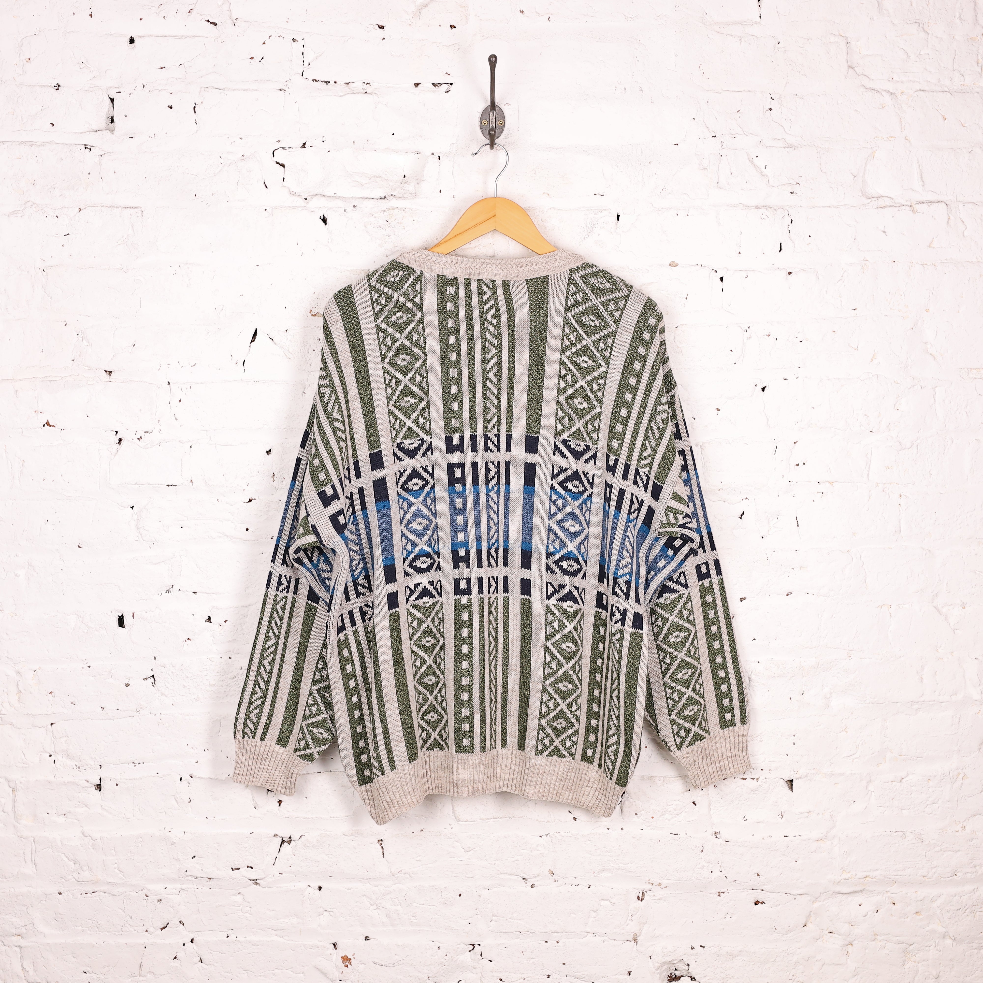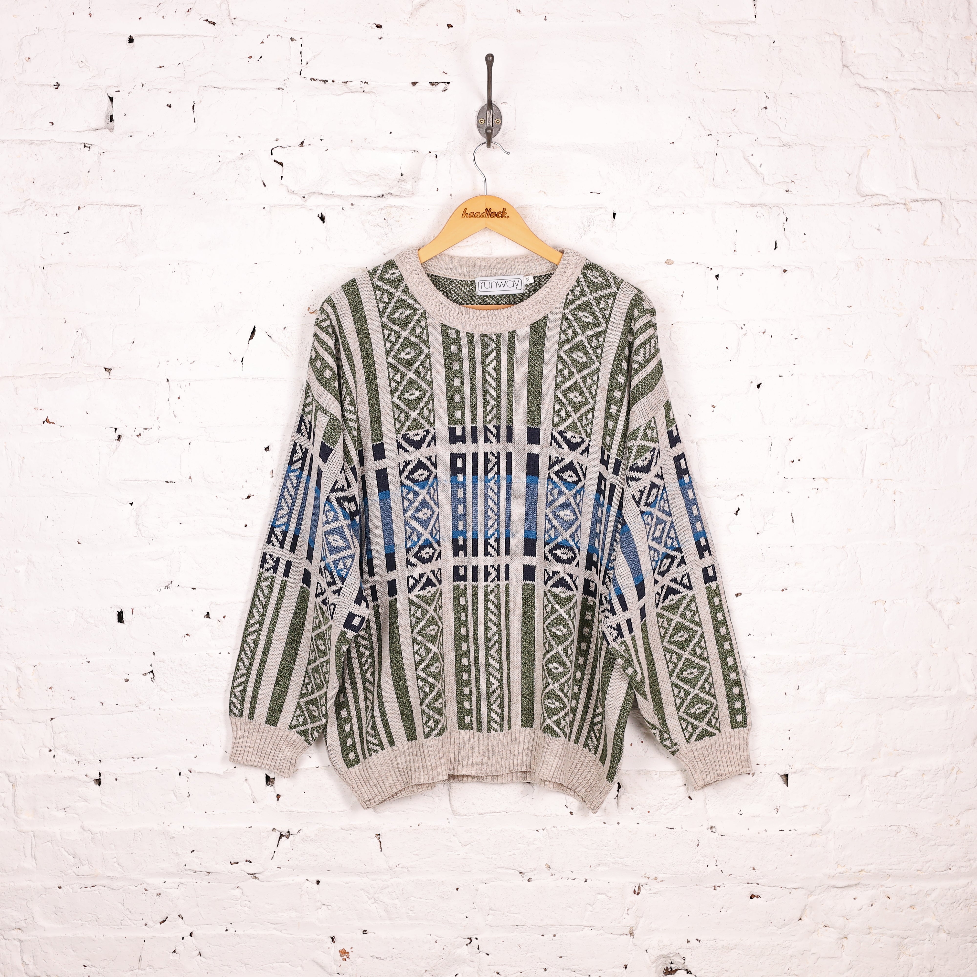 Good condition. 90s Pattern Knit Jumper in beige, green and blue.