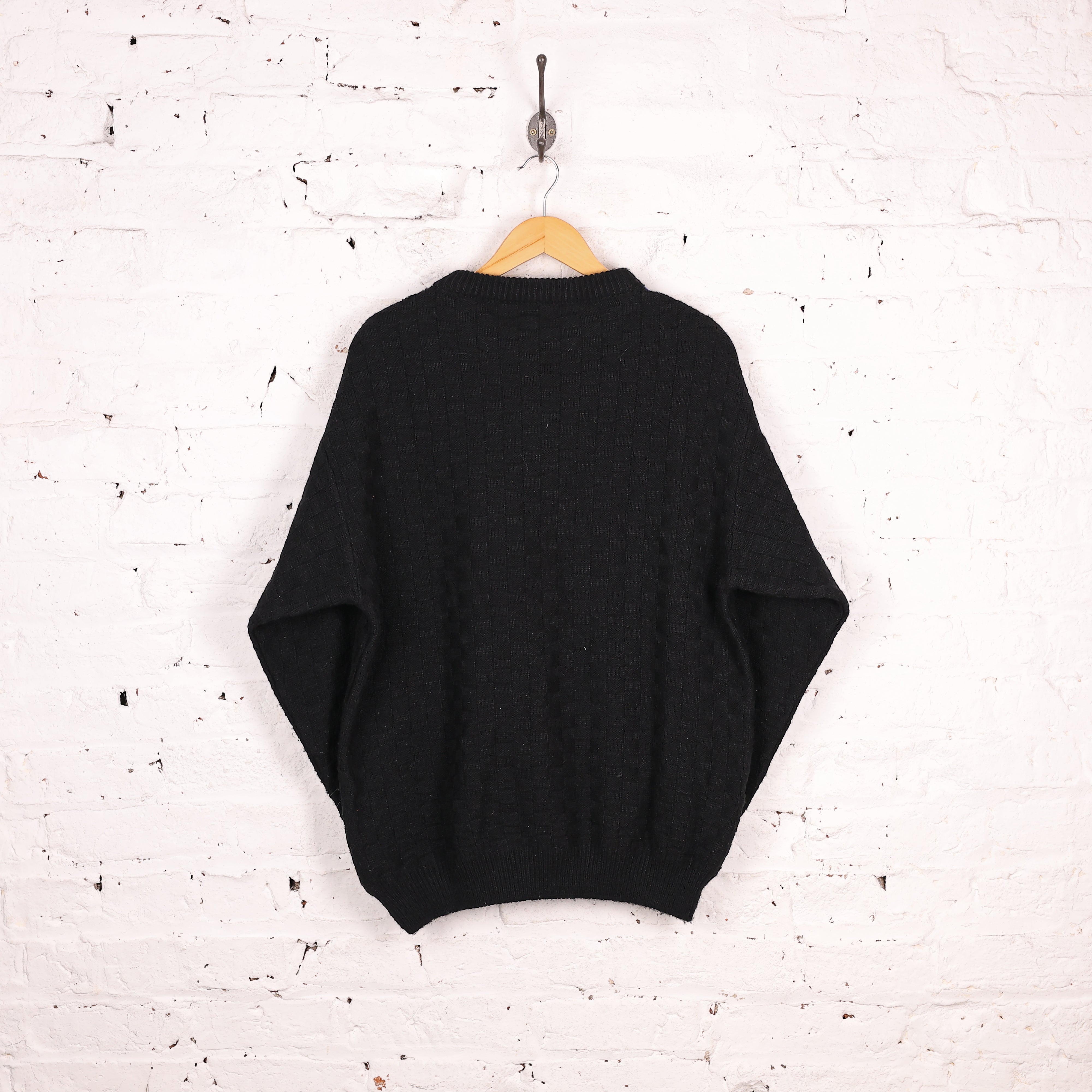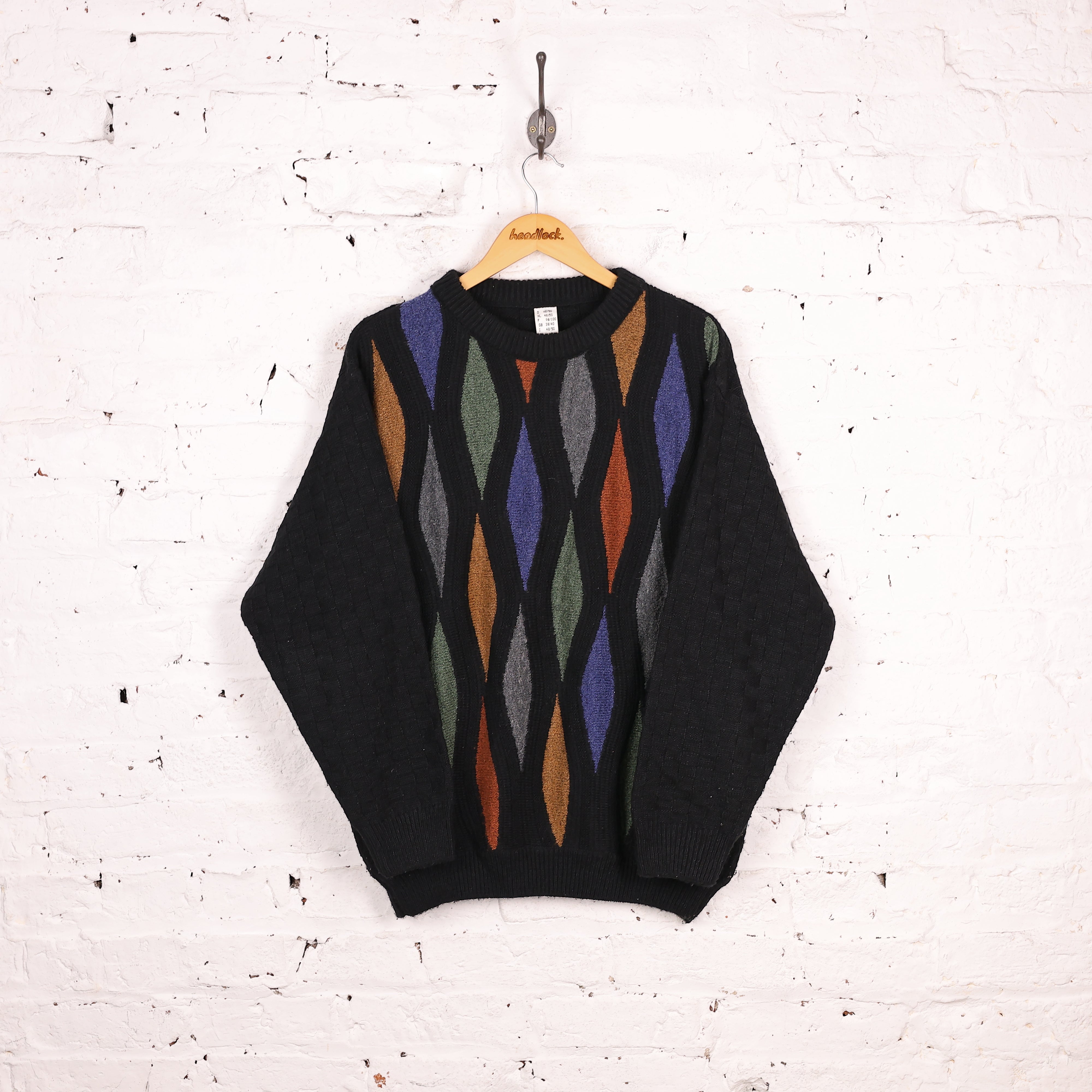 Good condition, slightly bobbly. 90s pattern knit jumper in crew neck with diamonds/wavy pattern.