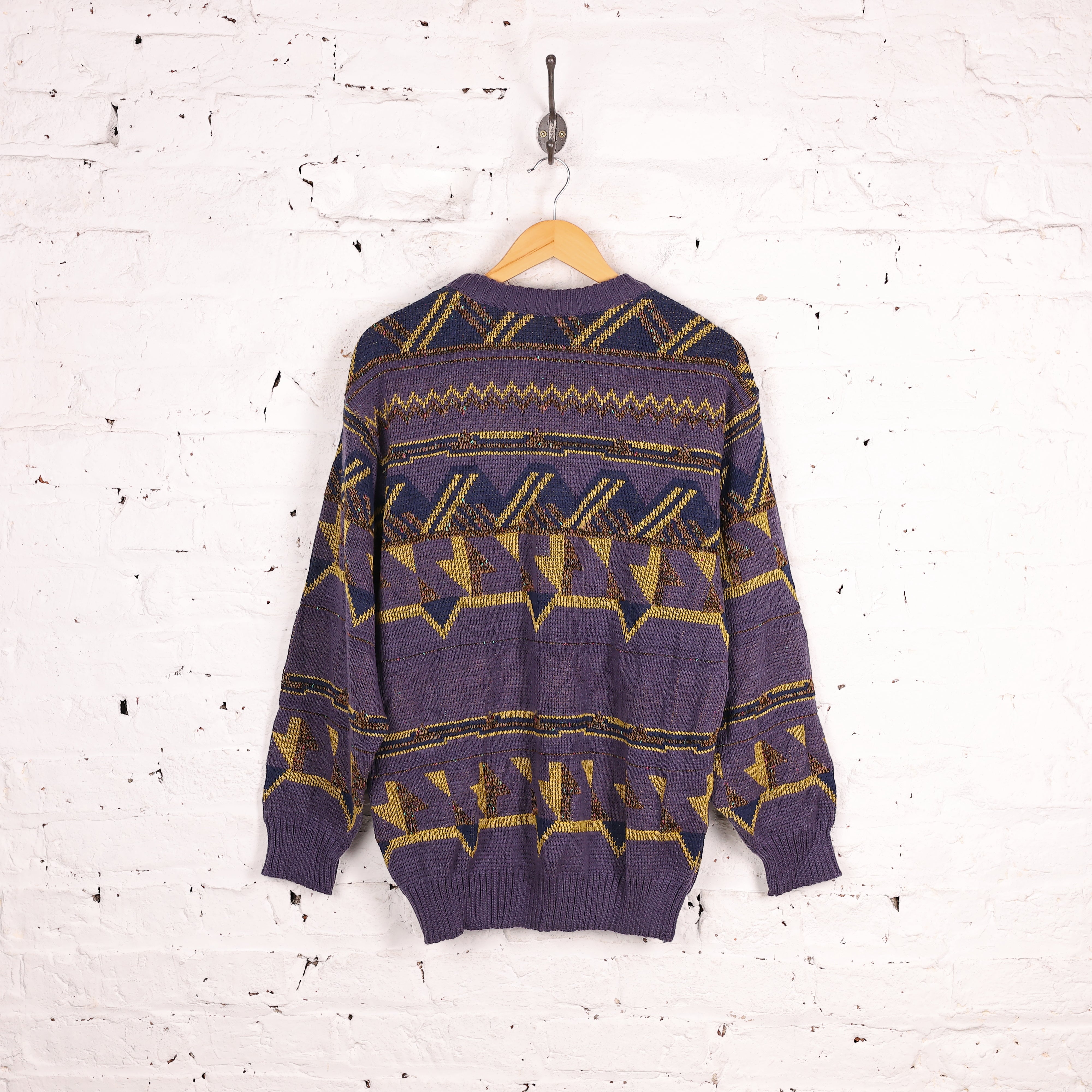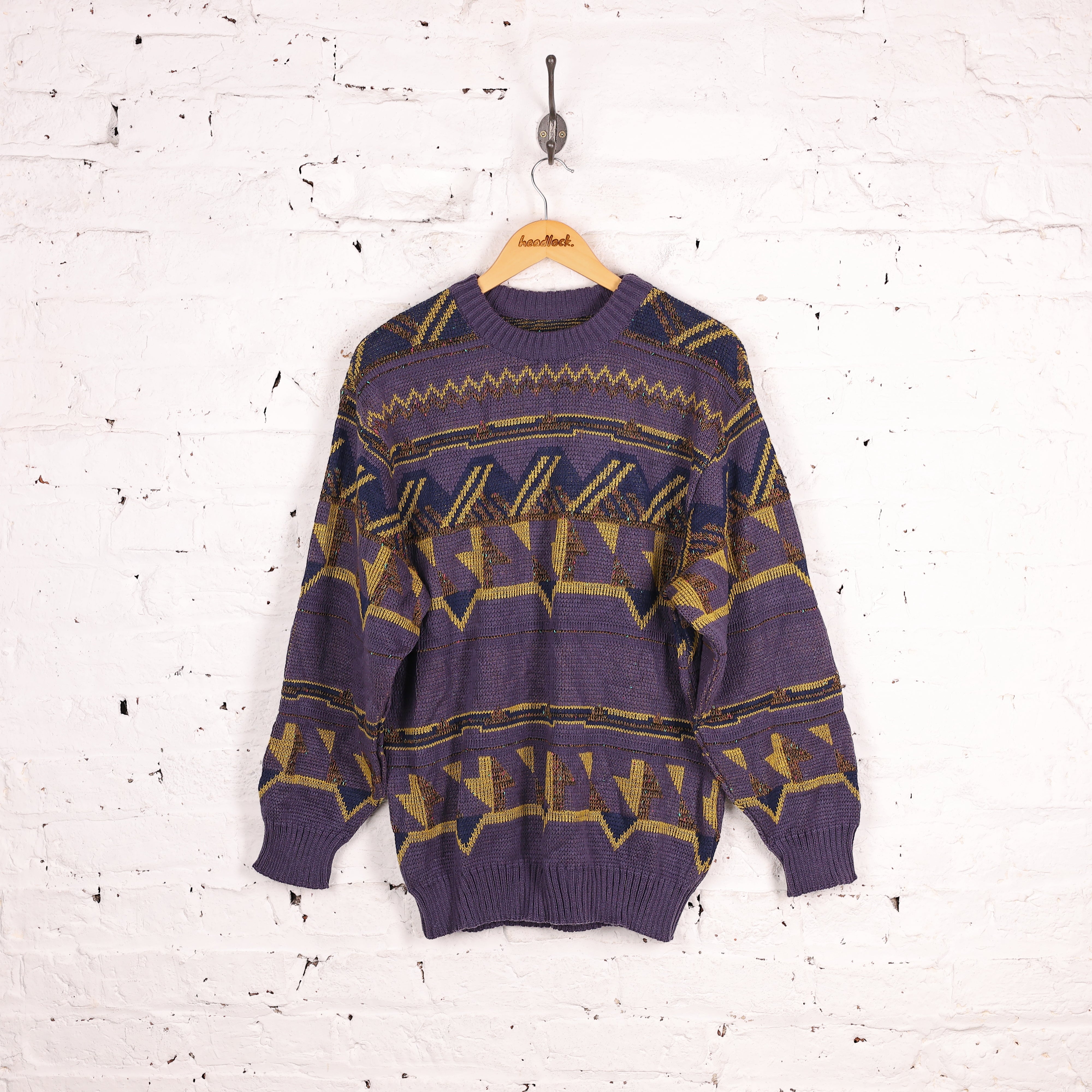 Good condition. 90s pattern knit jumper in purple and gold colours, loose fitting and crew neck.