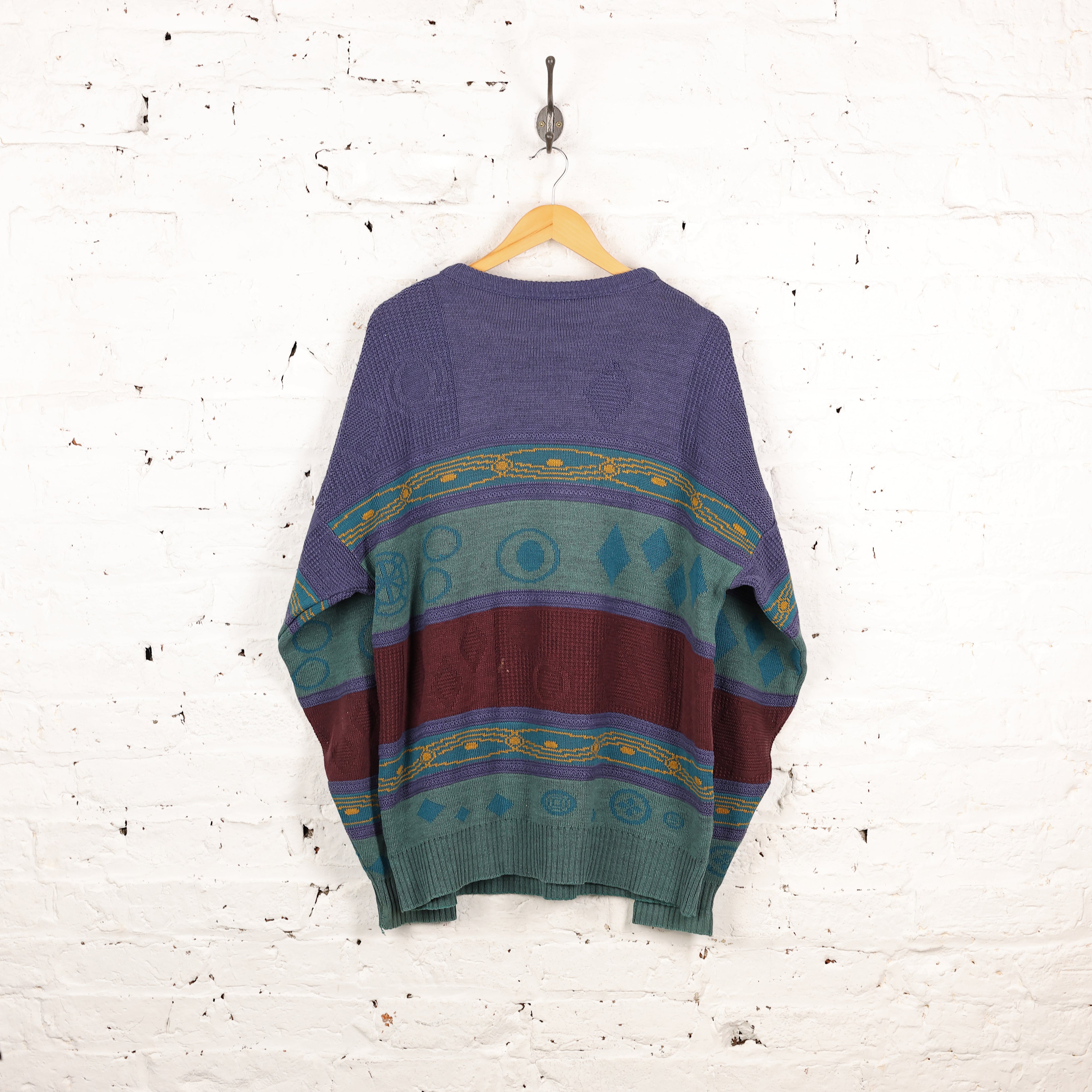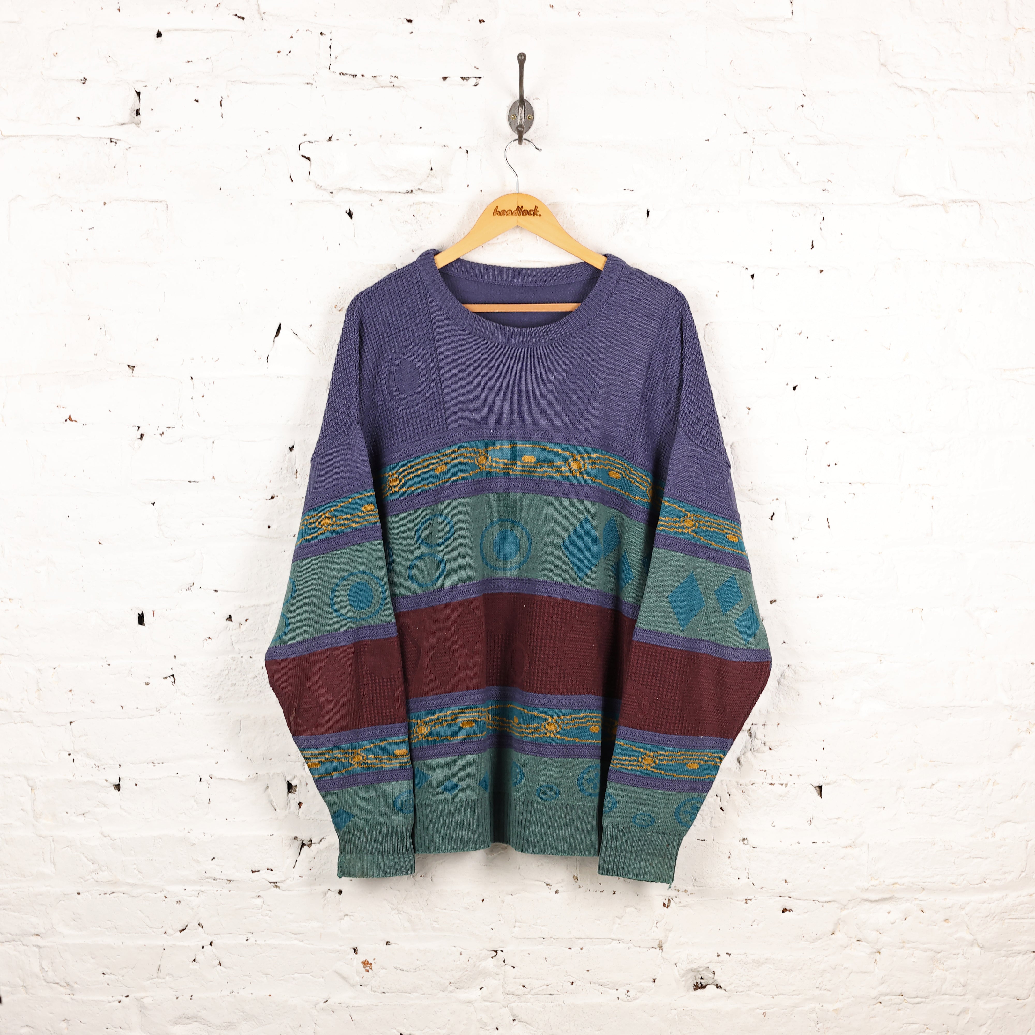 Good condition, some small pulls. 90s pattern knit jumper in purple and green colours.