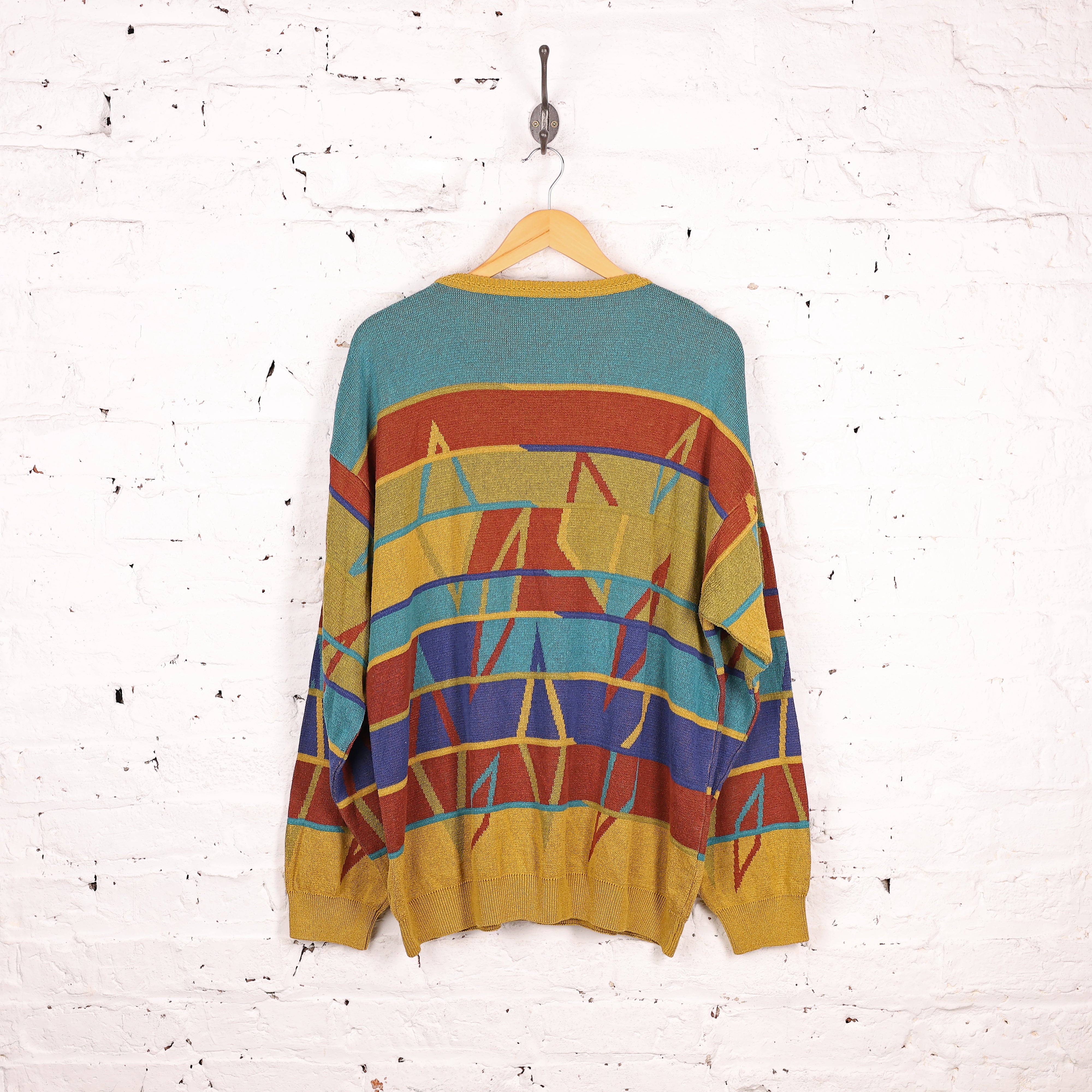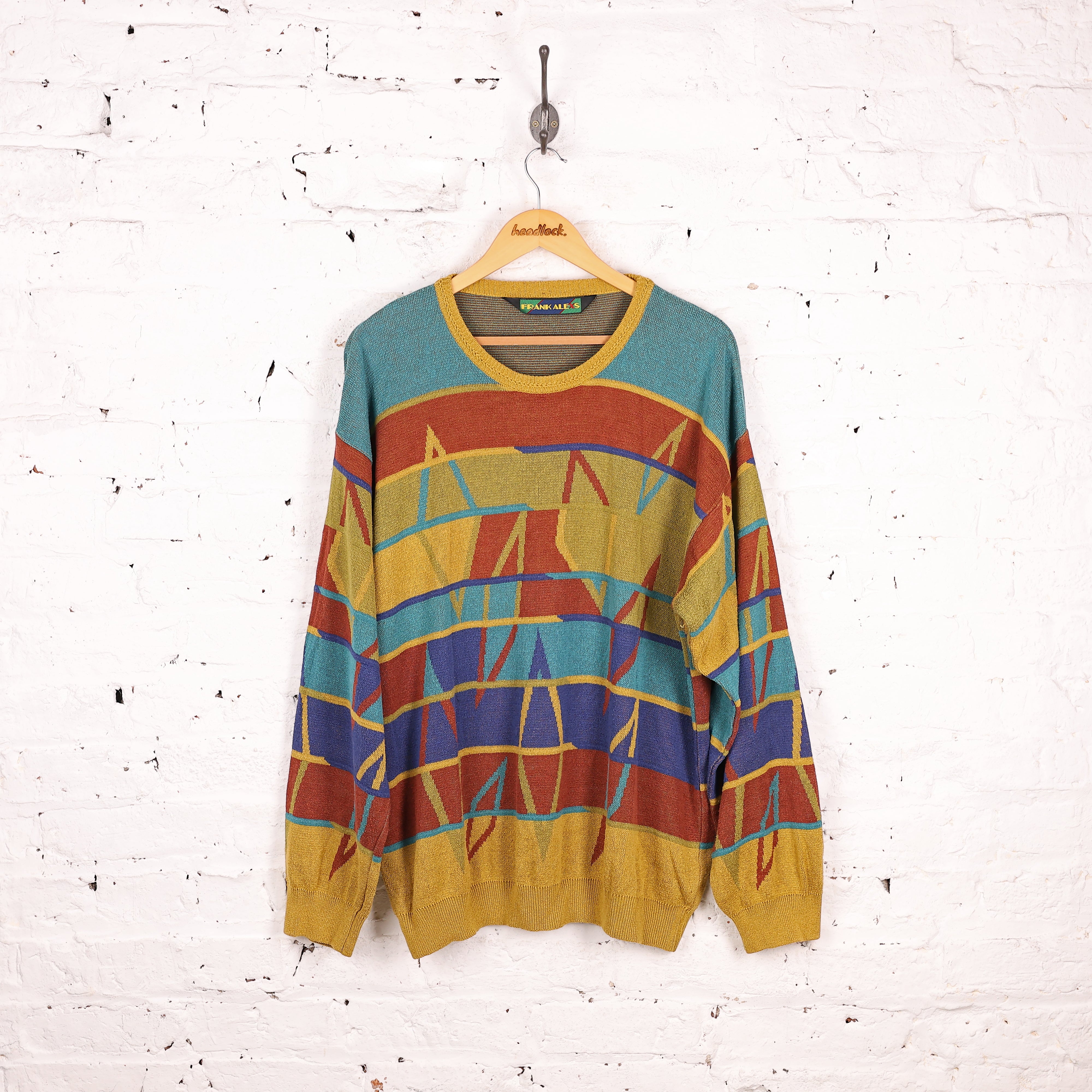 Good condition but bobbled fabric. 90s pattern knit jumper in yellow and blue colours, crew neck and loose fitting