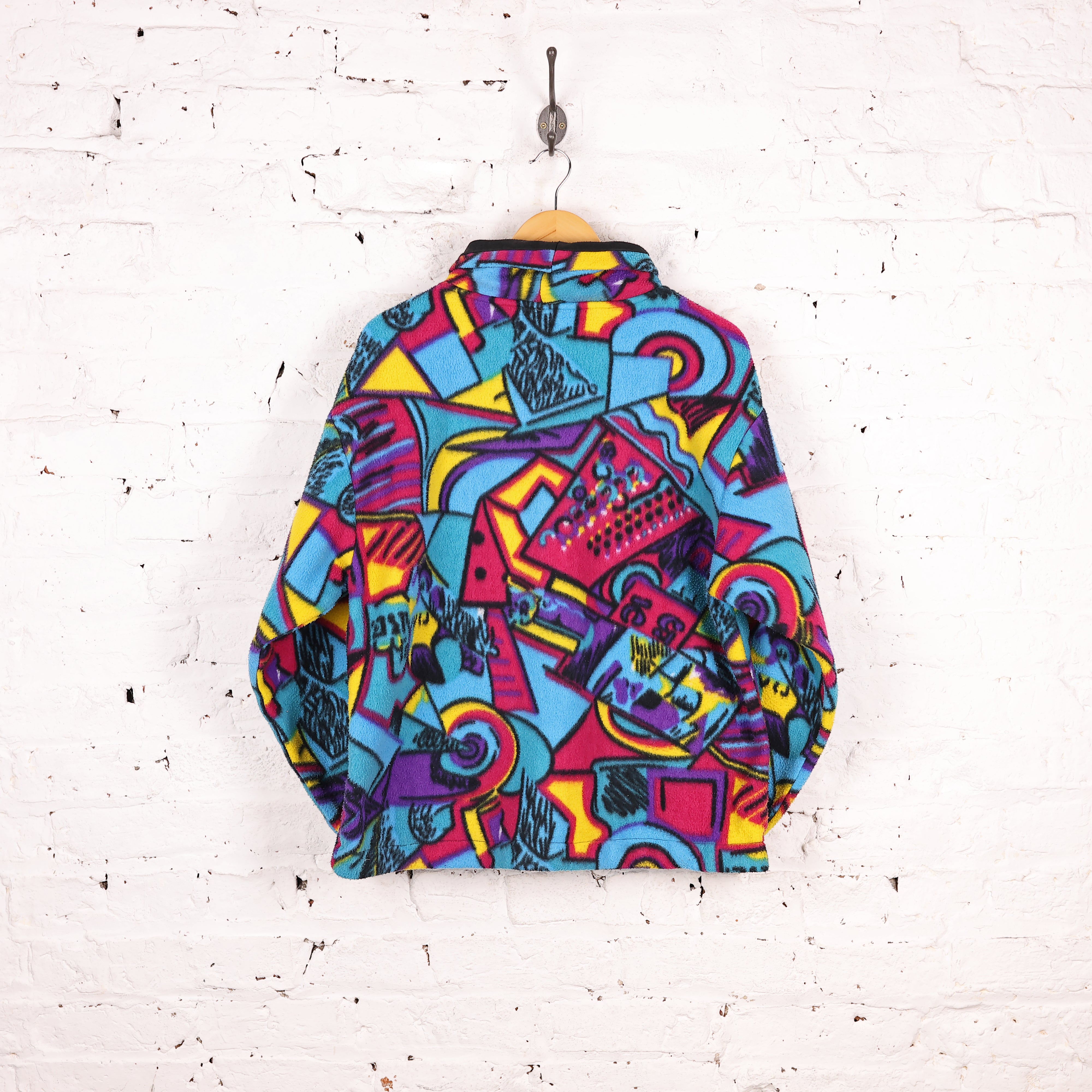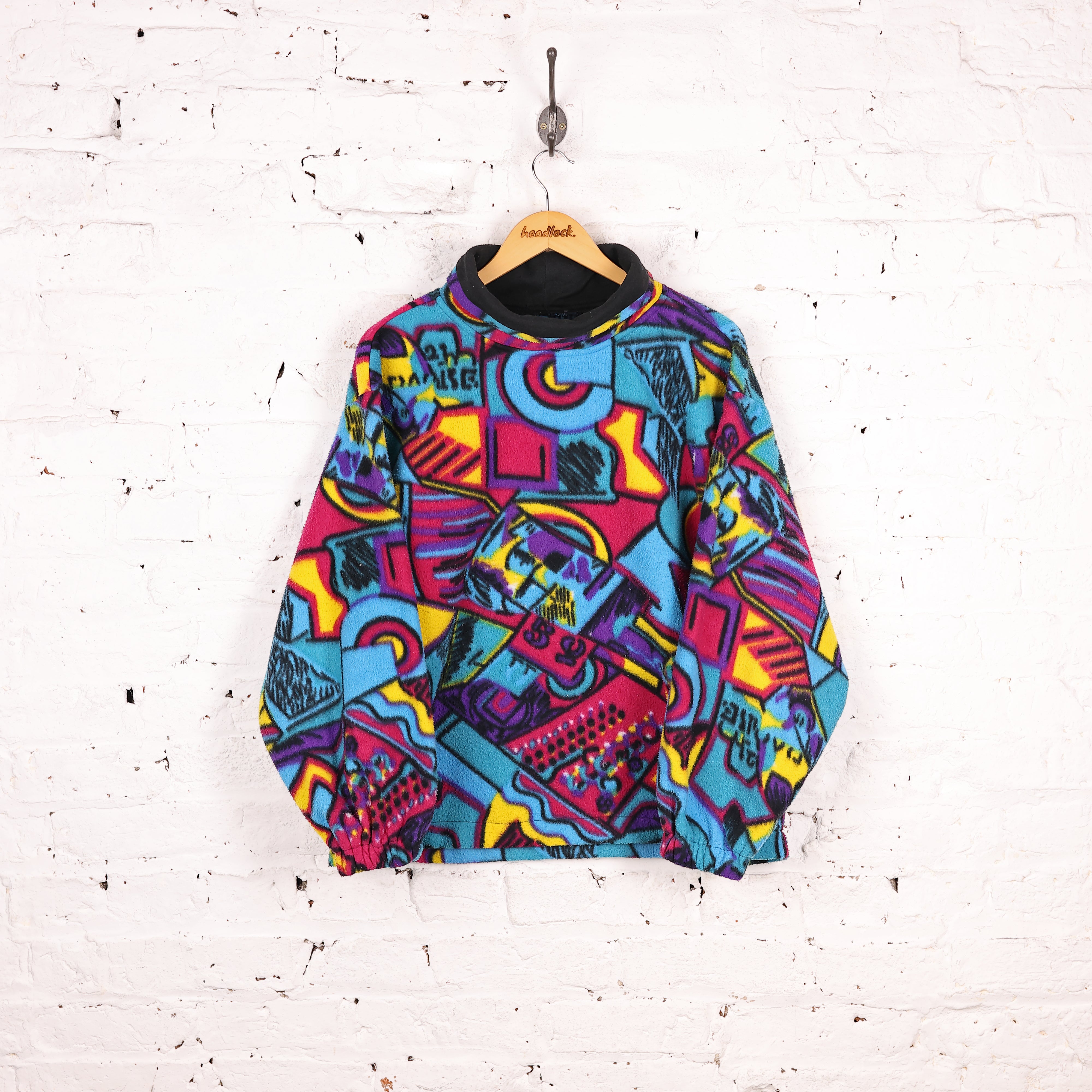 Good condition, slightly bobbled. 90s patterned fleece in blue, purple and yellow colours with high neck.