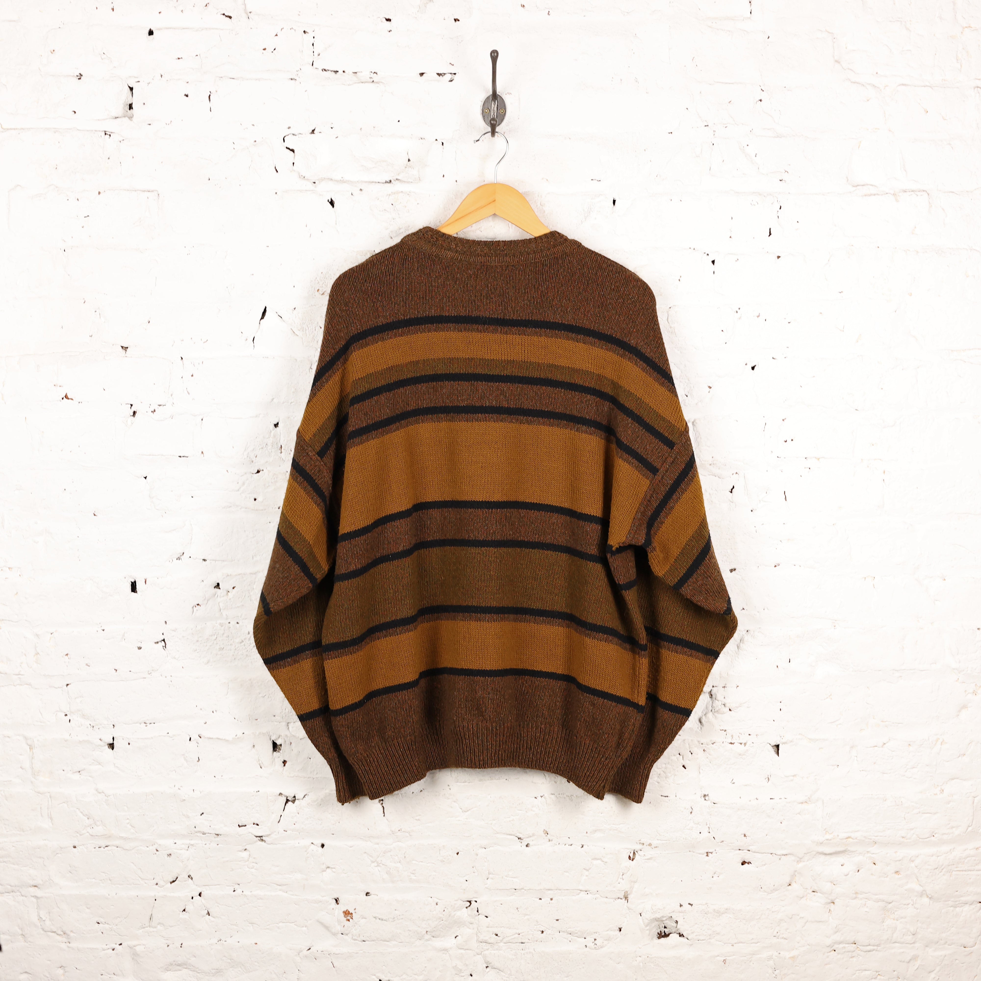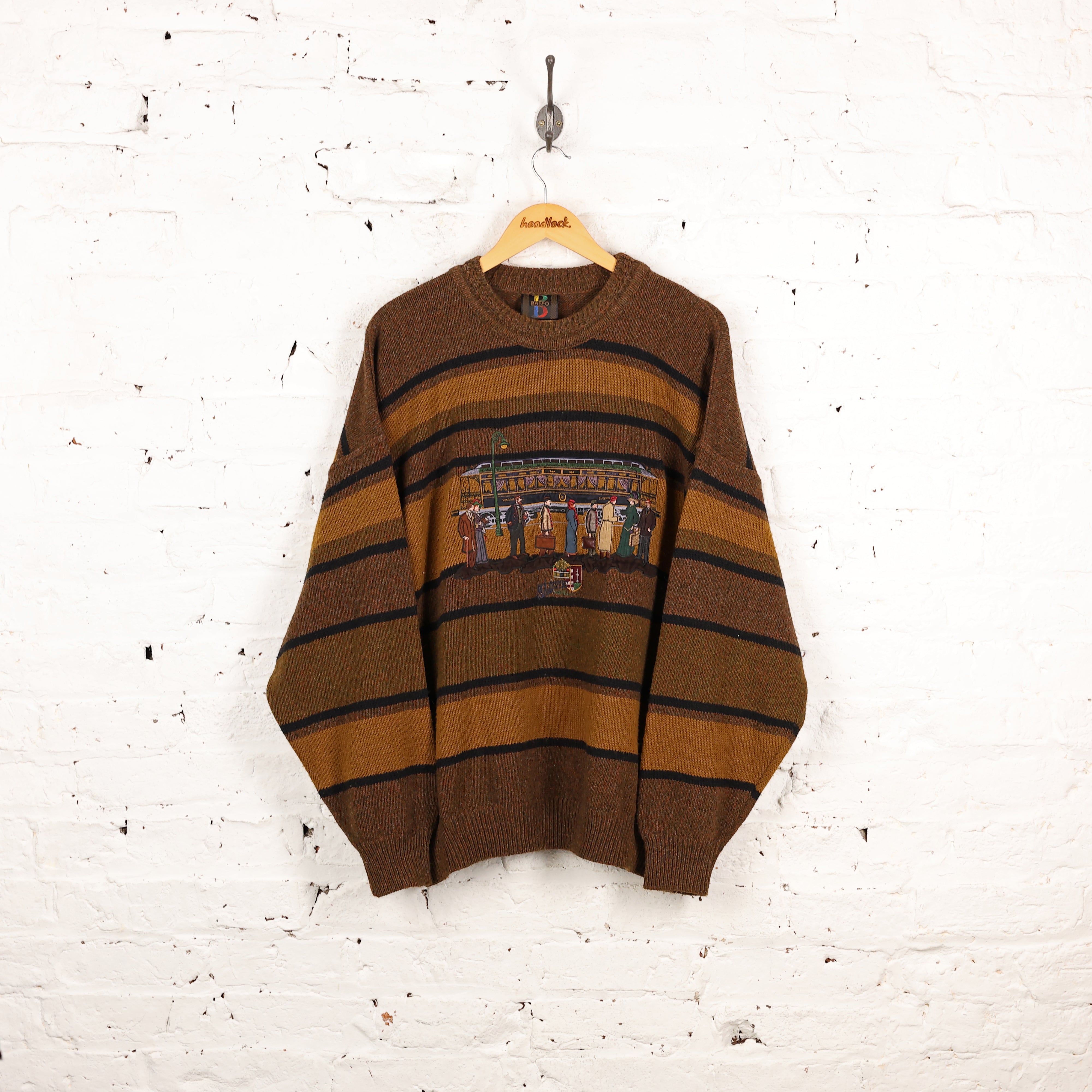 90s Striped Train Pattern Knit Jumper - Brown - XL
