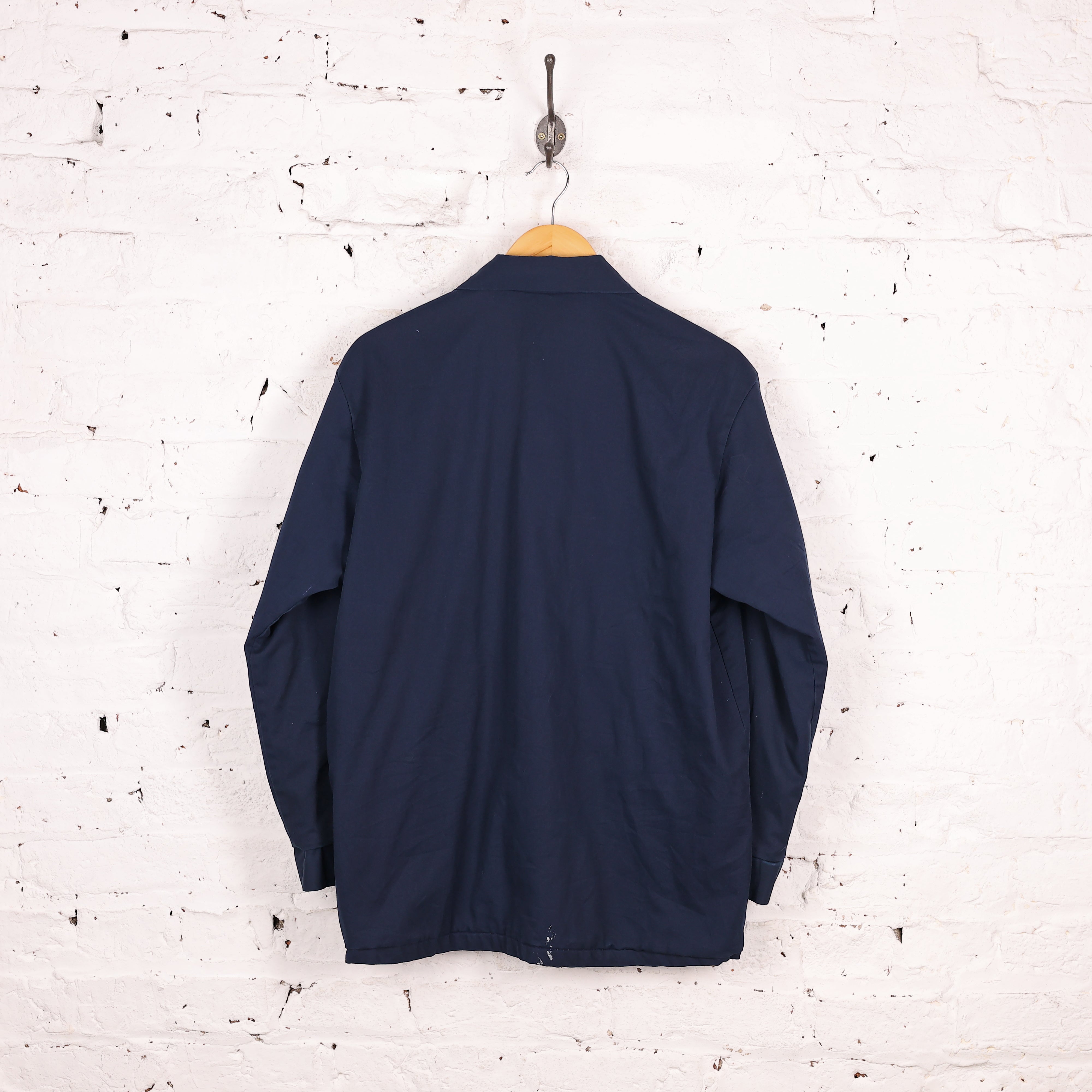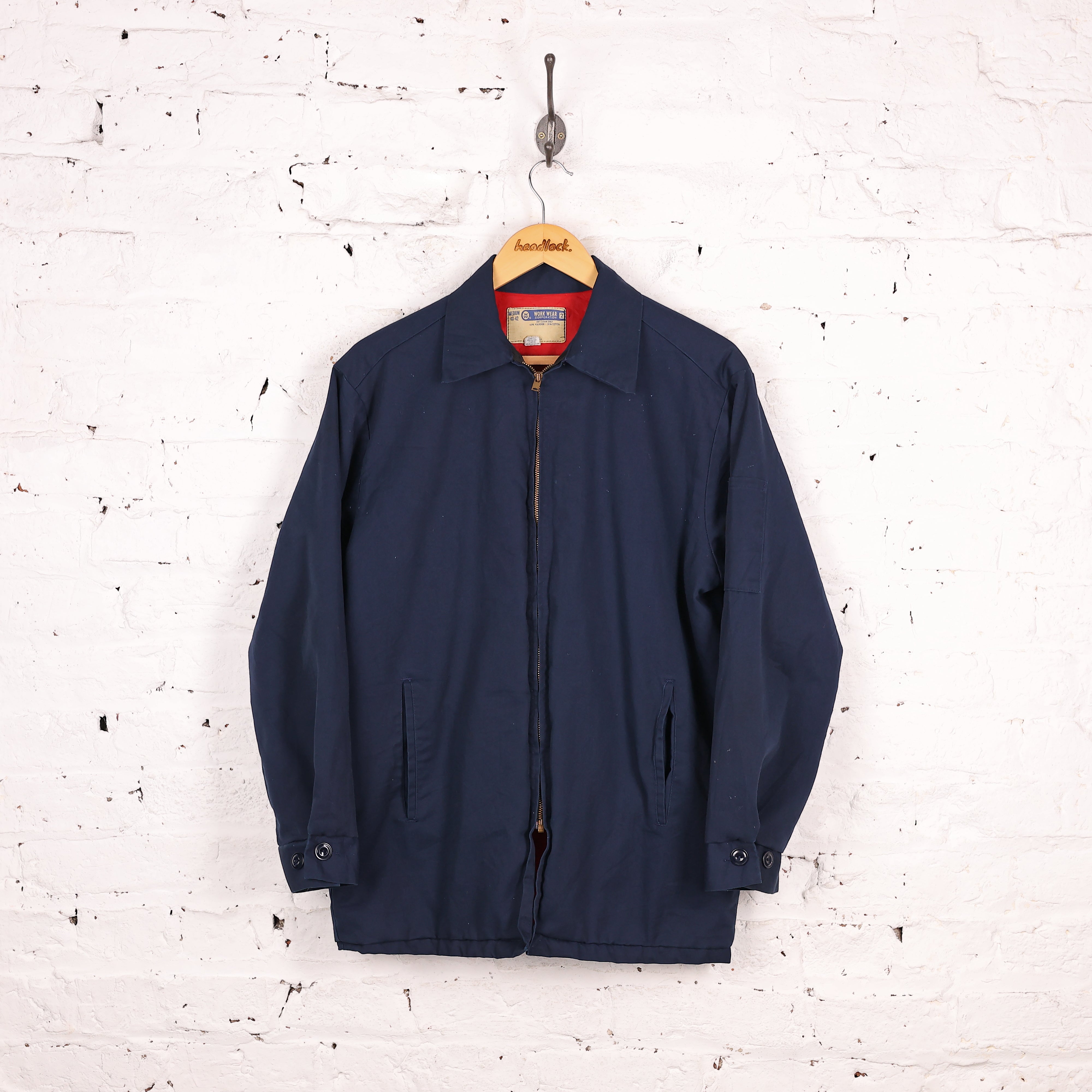 Good condition, some small pulls. American work jacket in blue with red inner lining, two outer pockets.