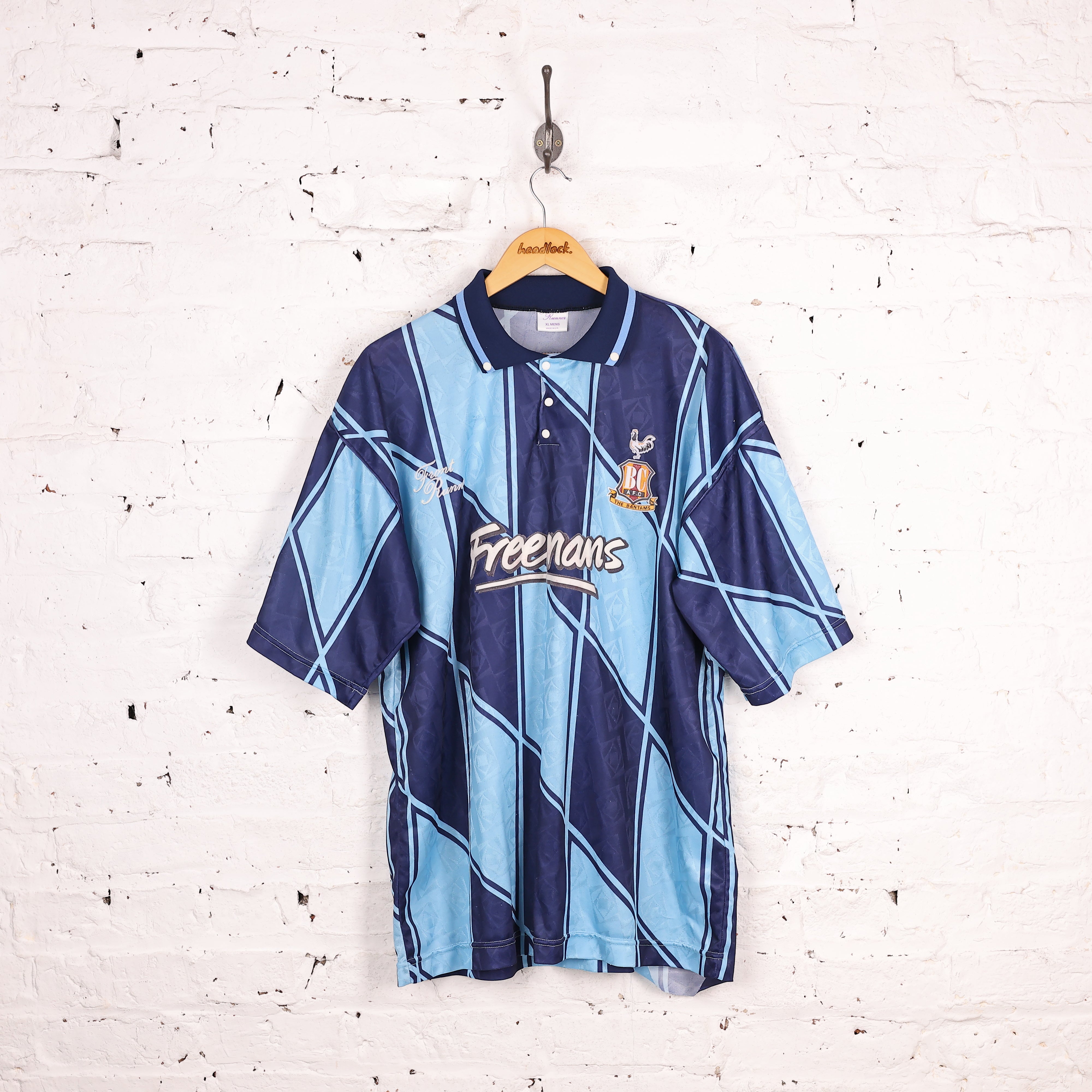 Good condition, some small bobbles. Bradford City away shirt from 1992 season made by Front Runners with amazing Freemans sponsor. Felt feel badges and button down collar.