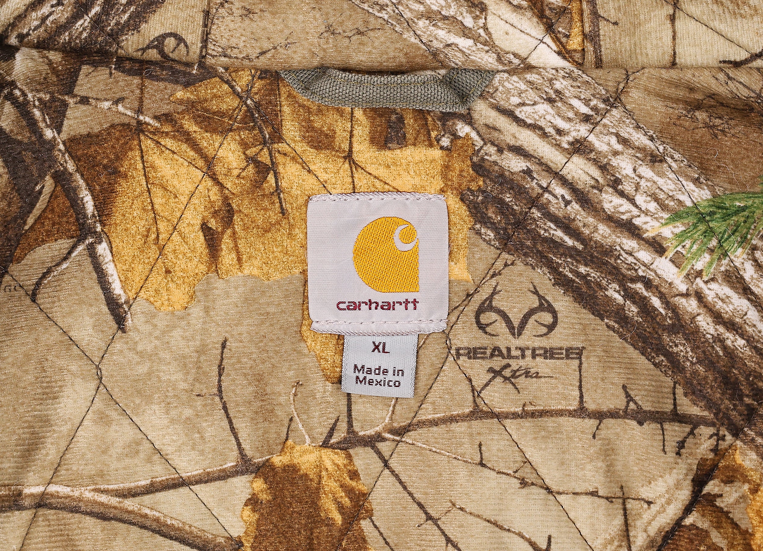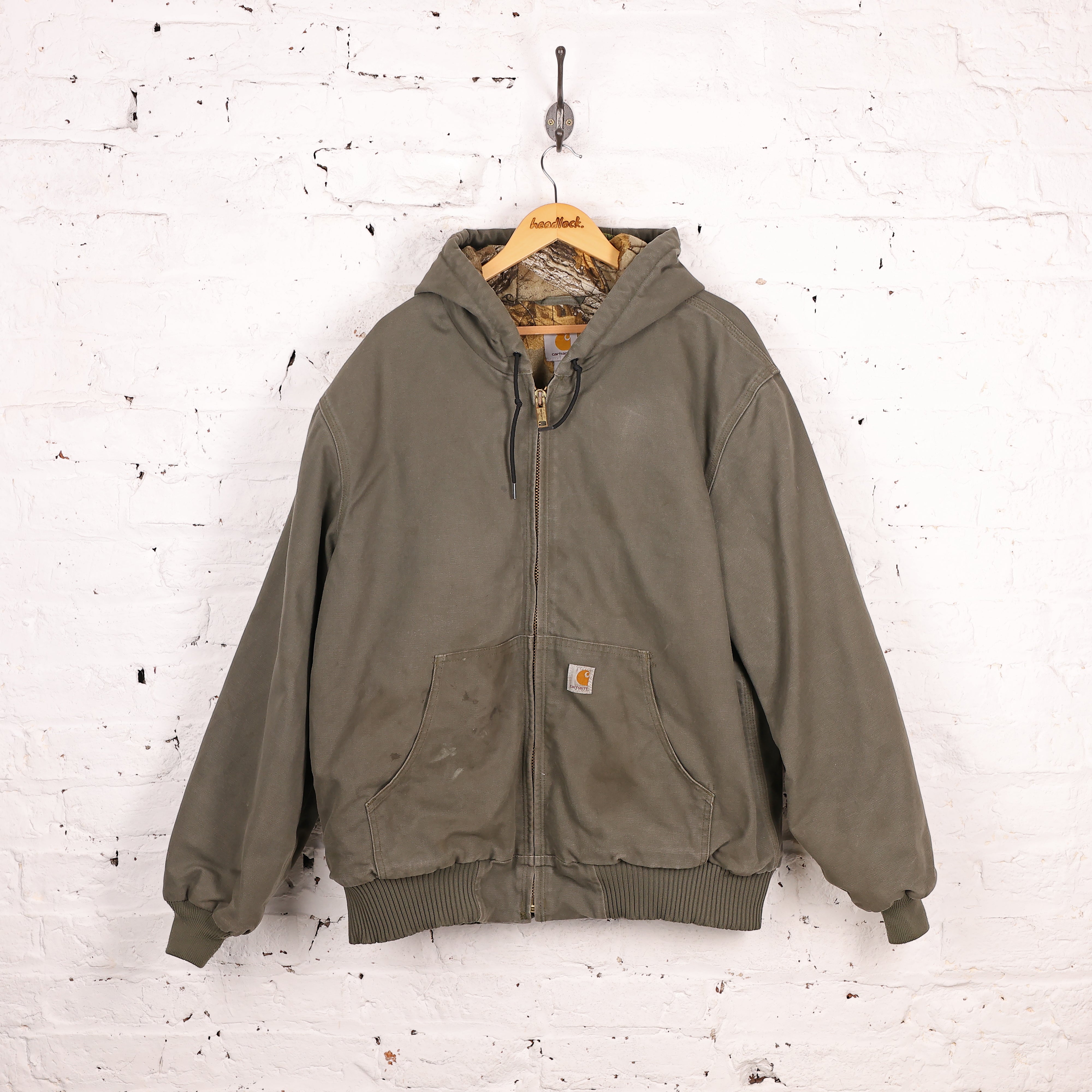 Good condition, some marks to the front pocket. Carhartt hooded work jacket with front pocket, stitched tab logo and hunting camo fleece lining.