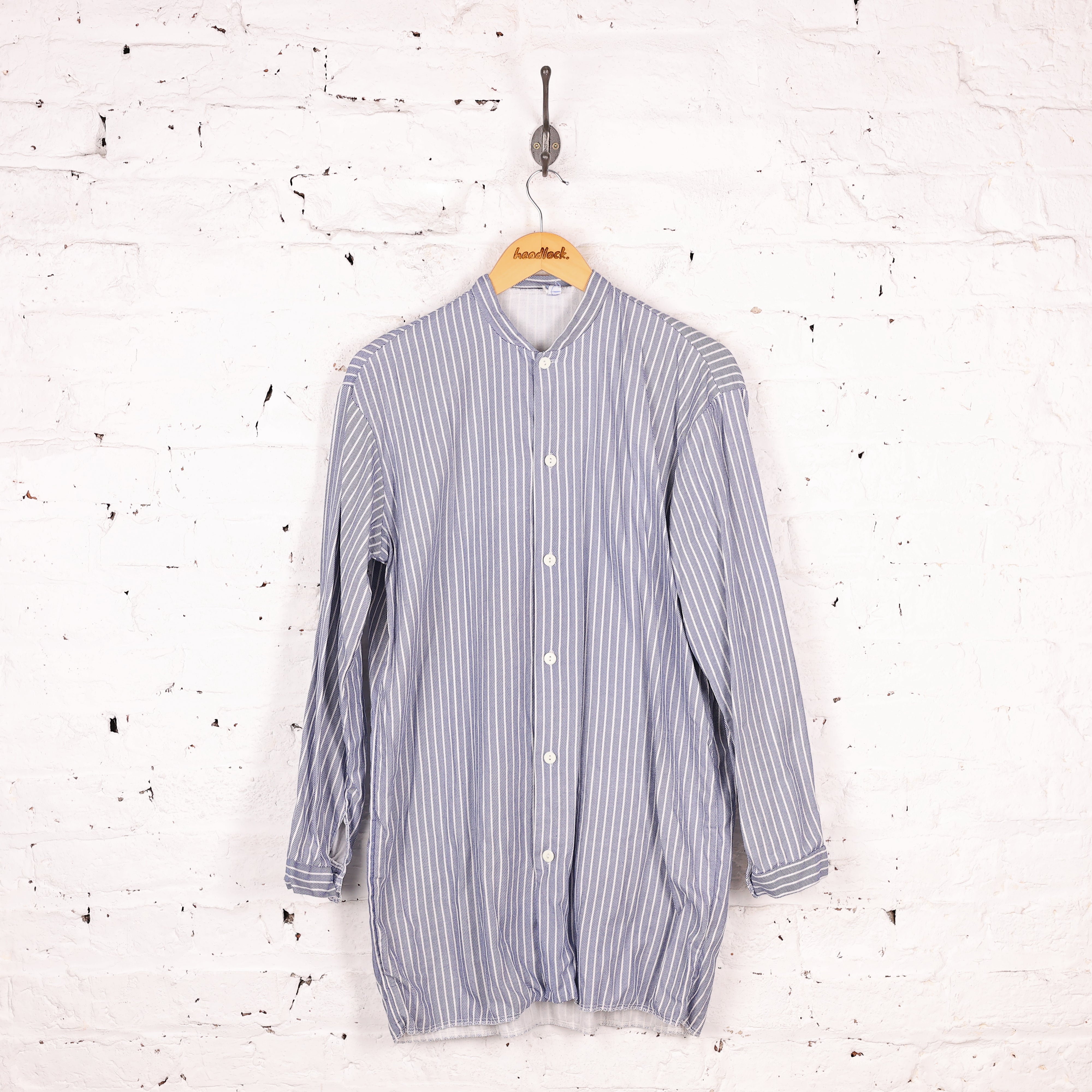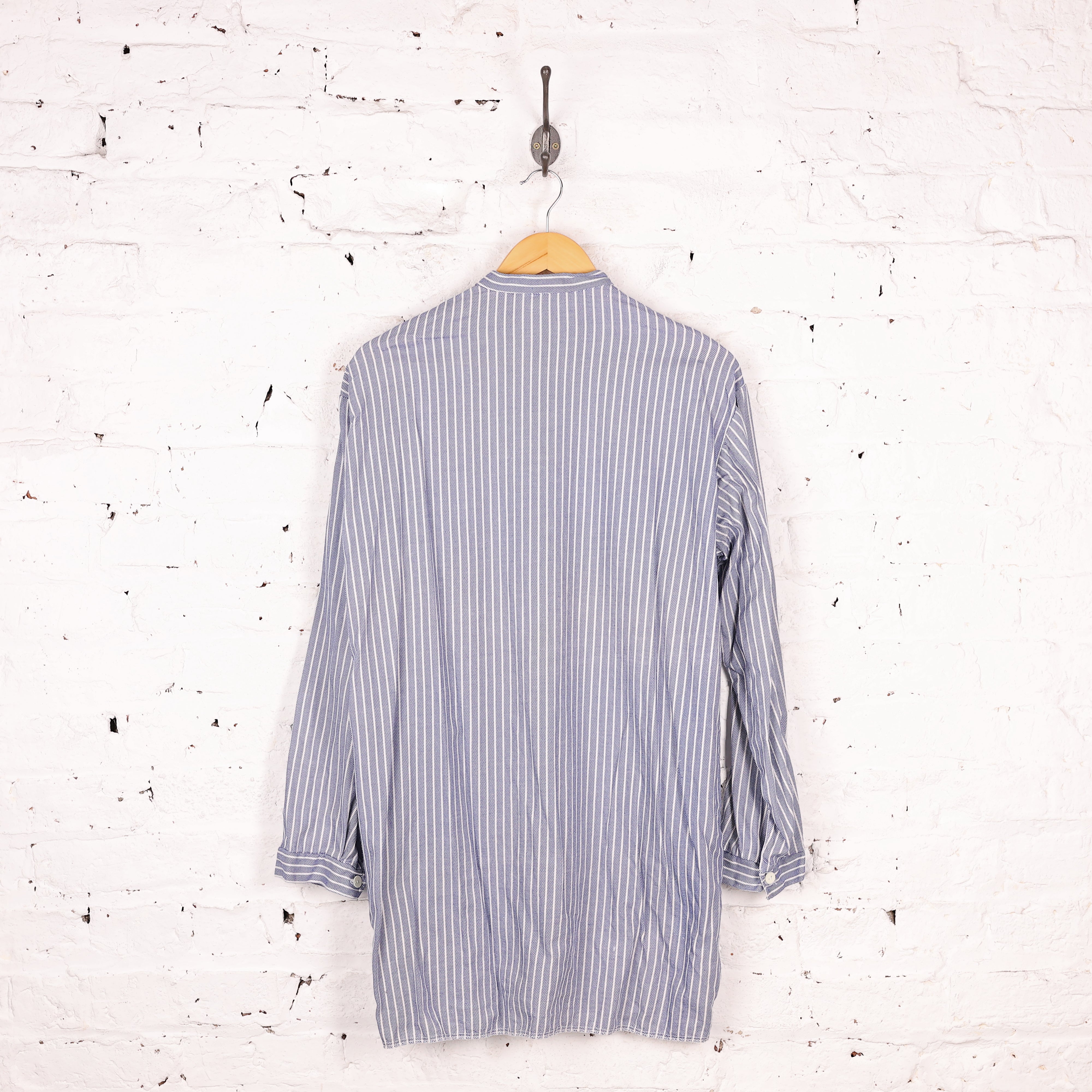Good condition. Light blue and white striped fisherman shirt, grandad collar and white buttoning. Long bodied fit.