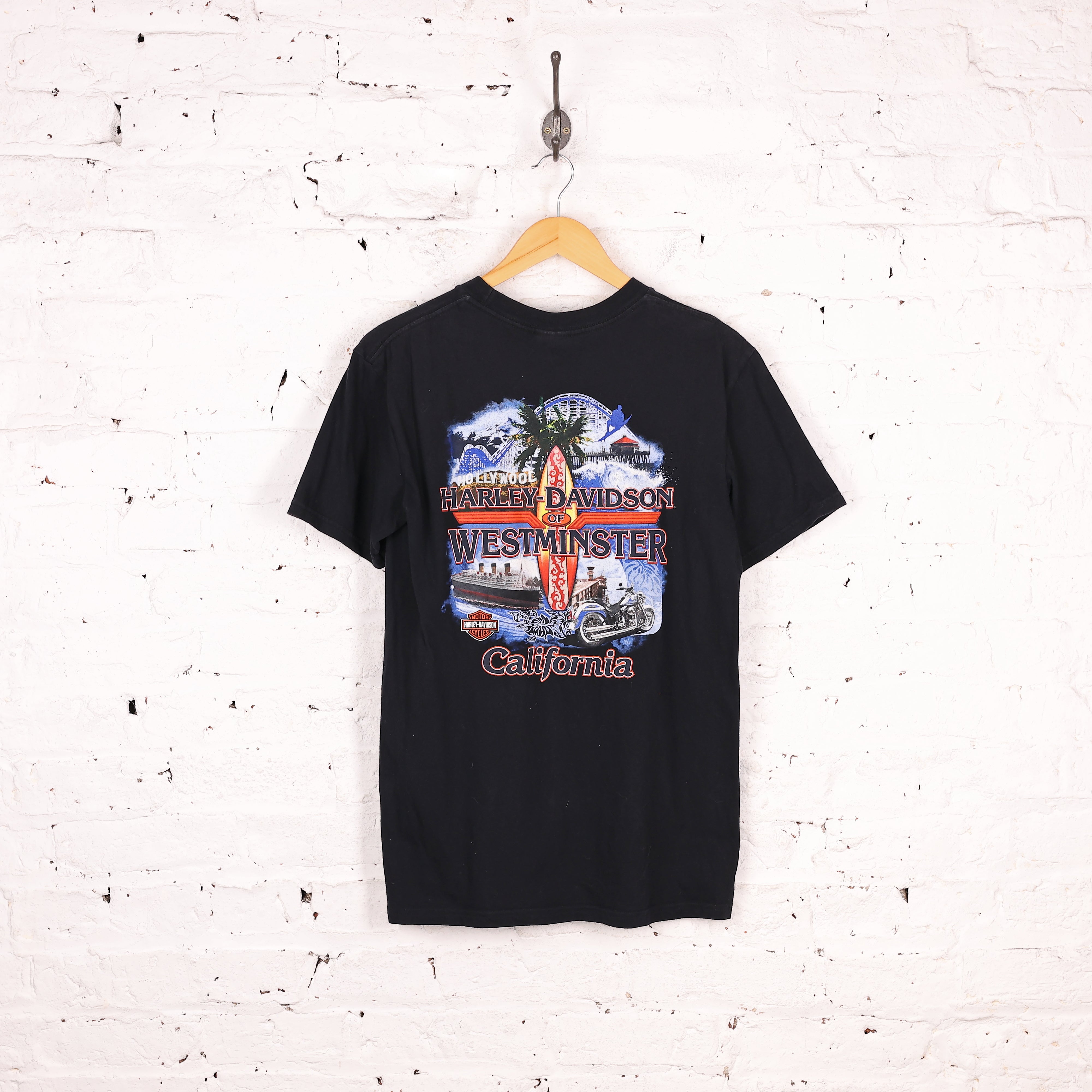 Good condition. Harley Davidson dealership T Shirt with pink logo on the front and California dealership image on the back