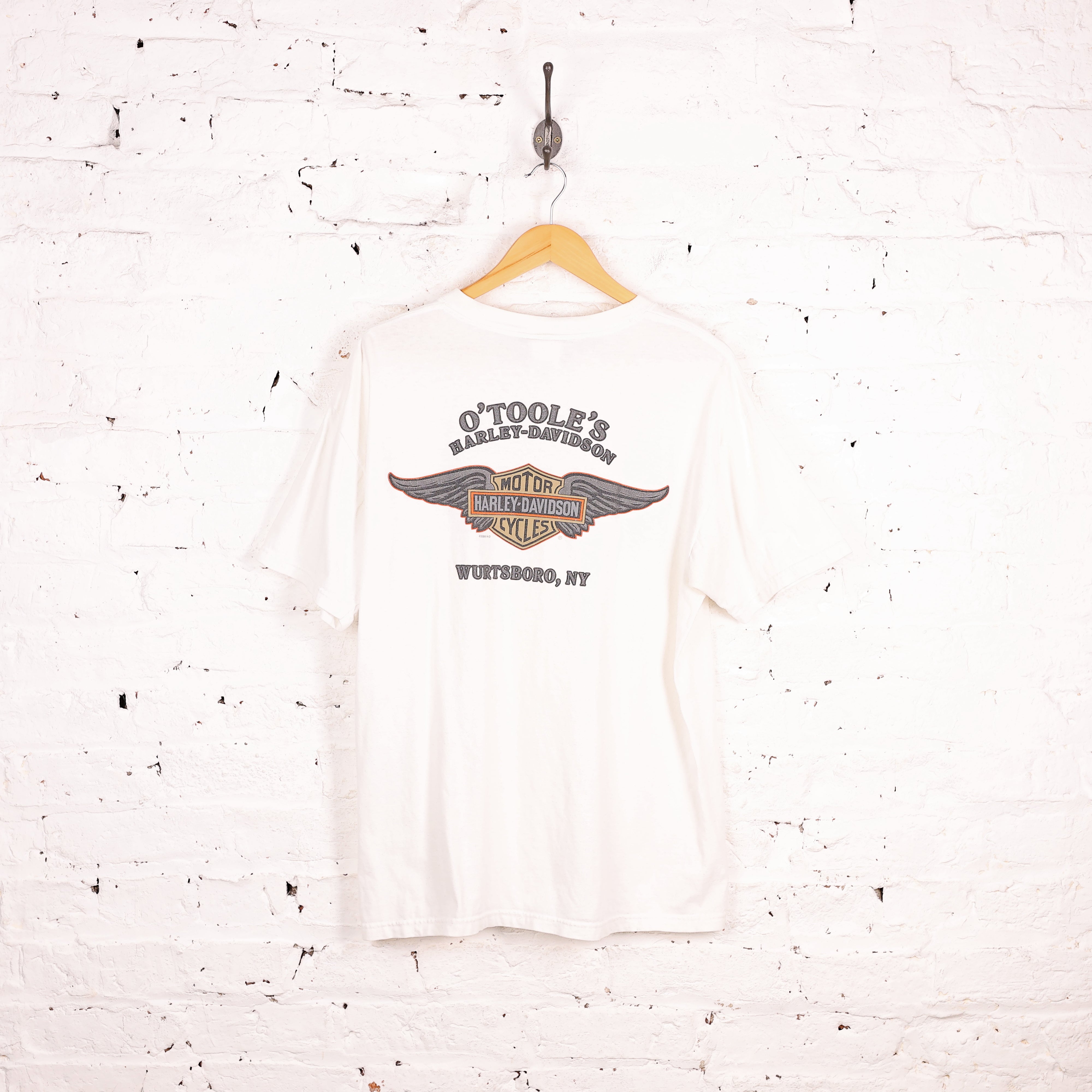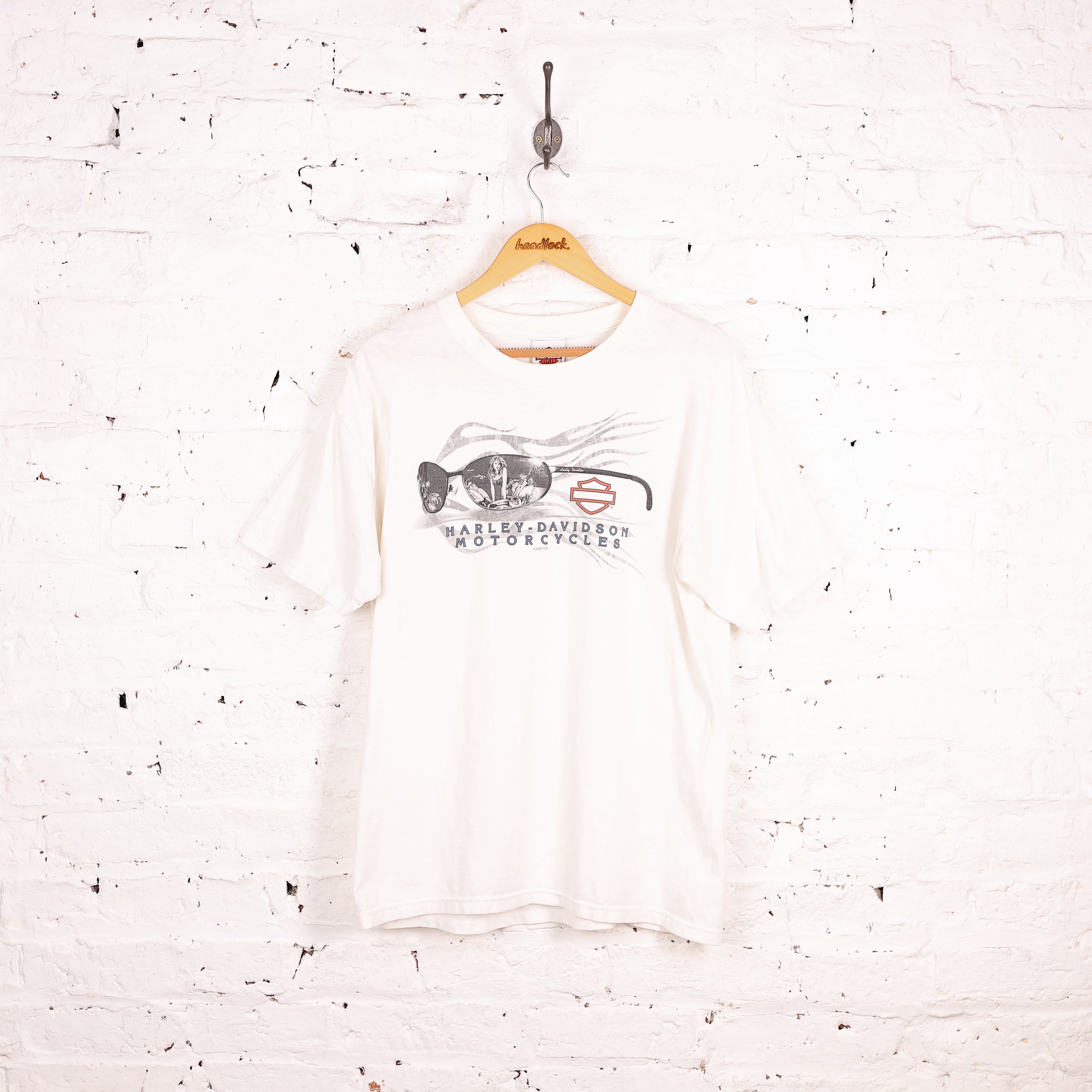 Good condition, two small holes in collar. Harley Davidson graphic t shirt in white.