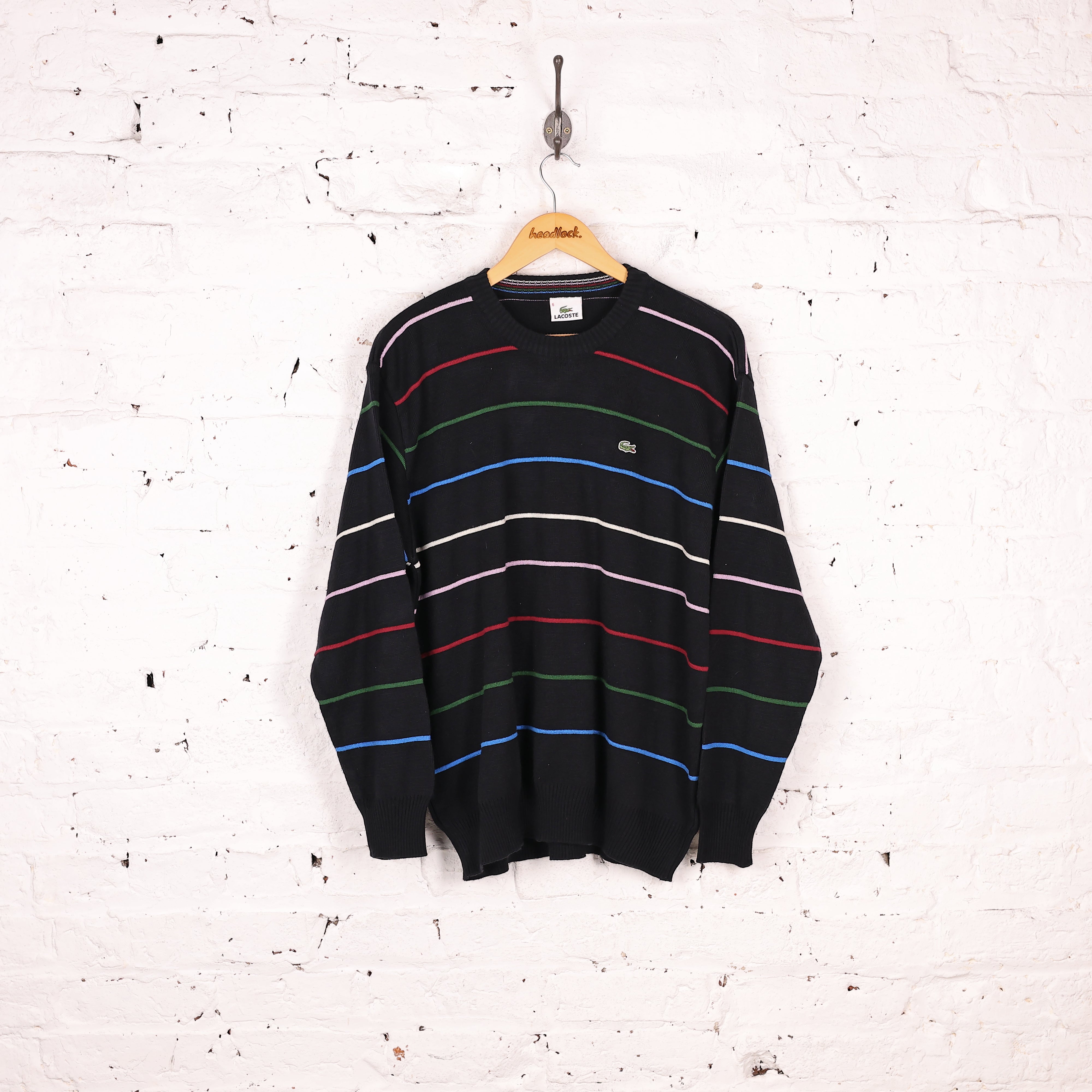 Good condition. Lacoste striped knit jumper in black with stitched logo on the chest.