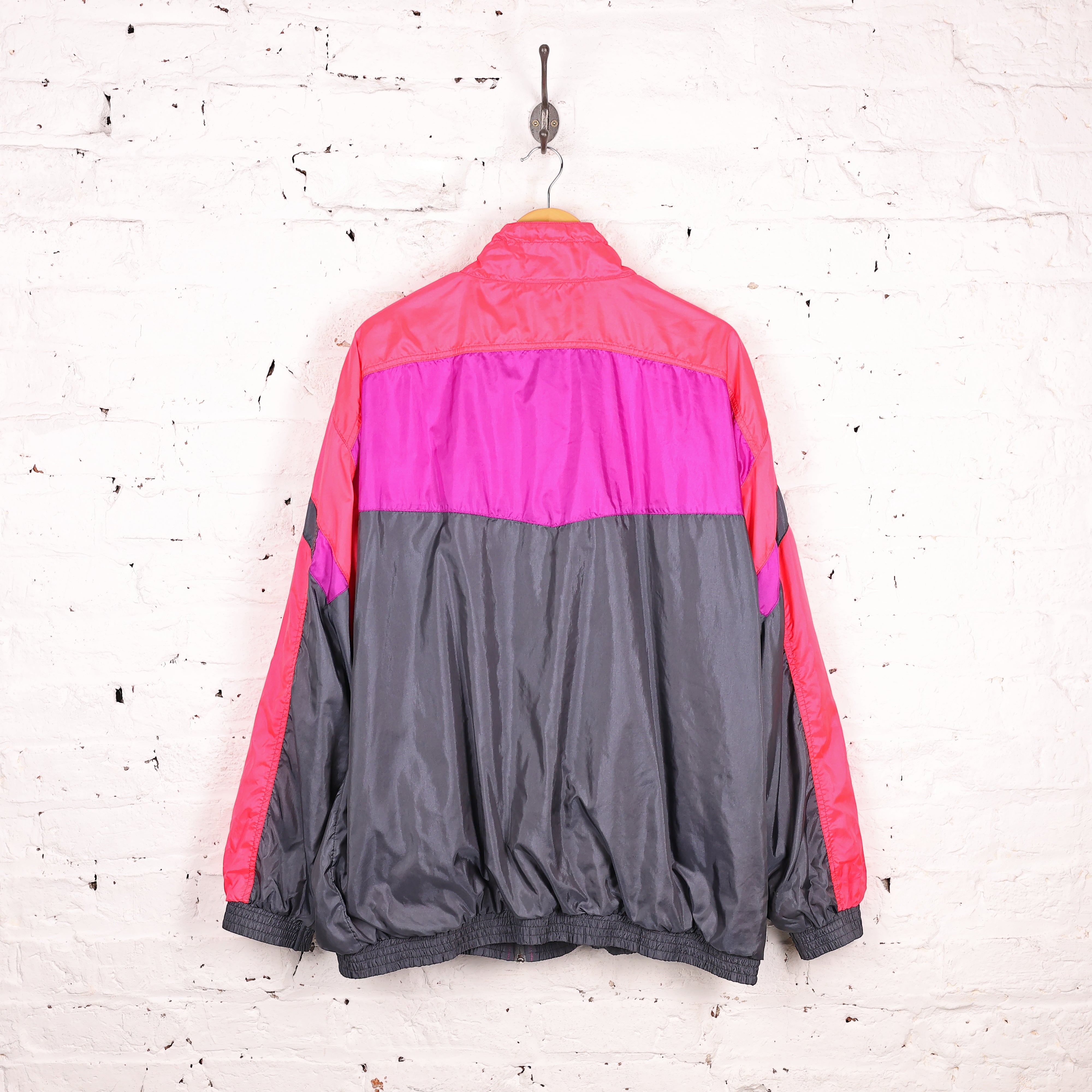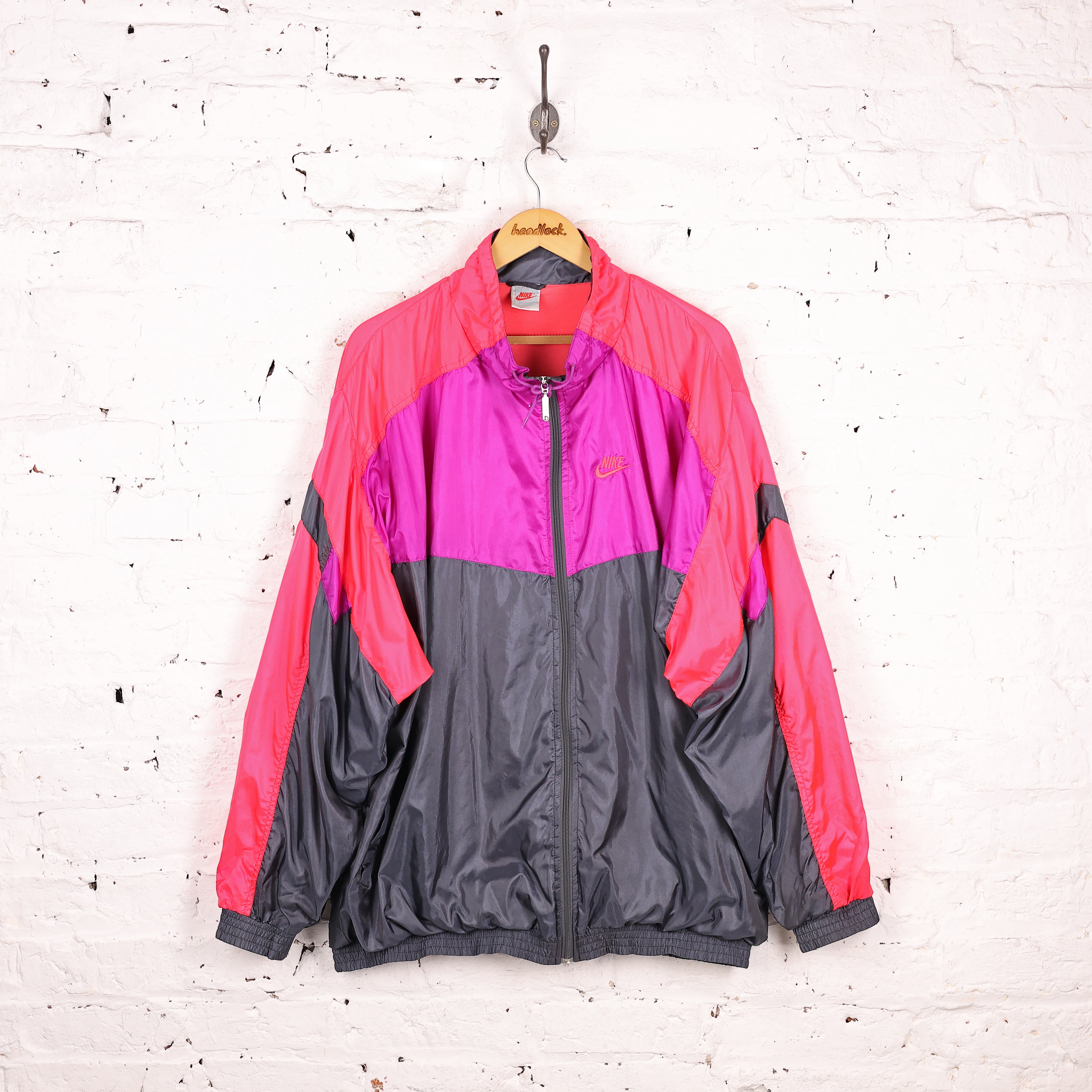 Excellent condition. Nike shell windbreaker track top in grey, pink and purple colourway, stitched logo, zip pockets and drawstring collar.