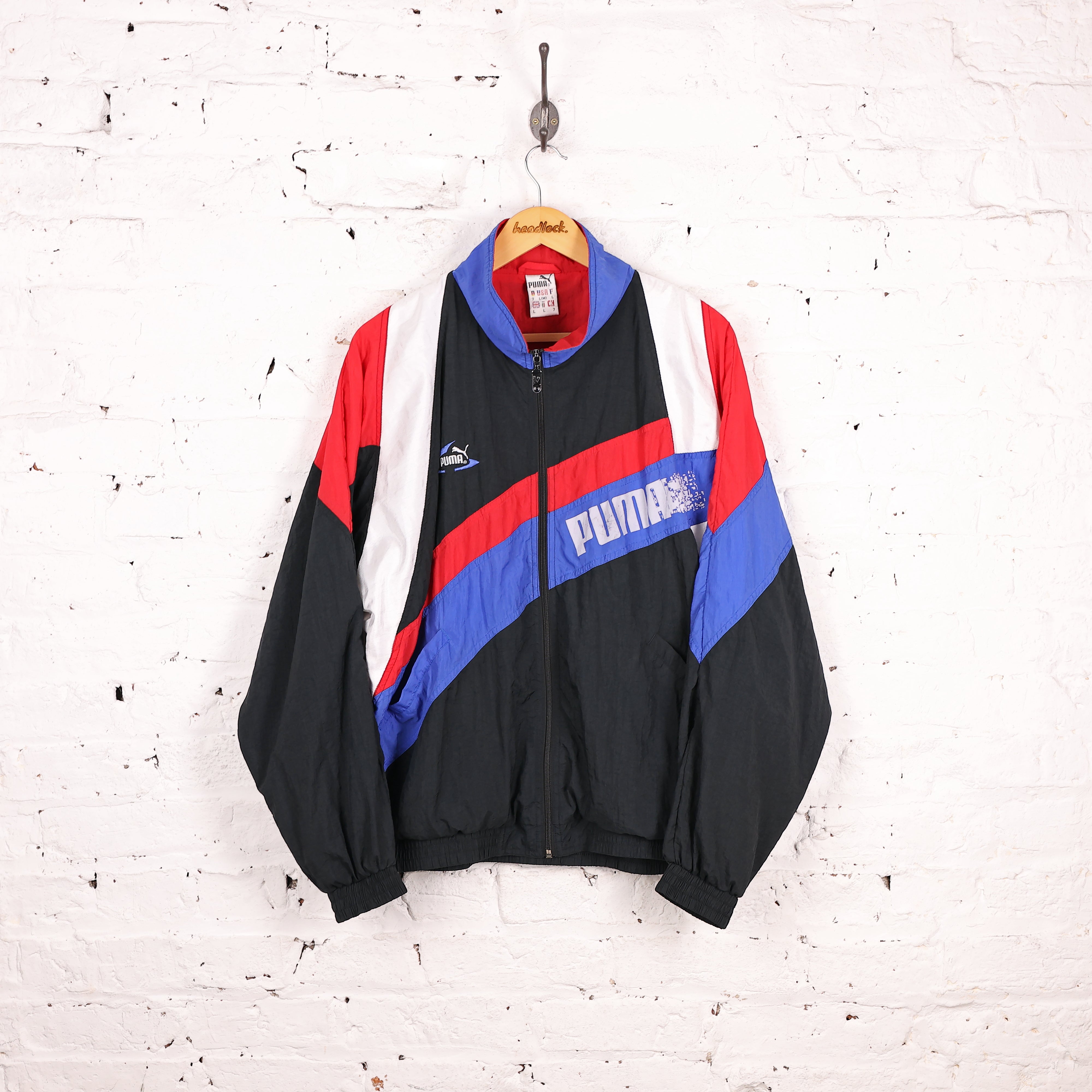 Good condition, small mark on stripe across the front. Puma 90s Shell Tracksuit Top Jacket in black, blue, white and red with stitched logo on the chest.
