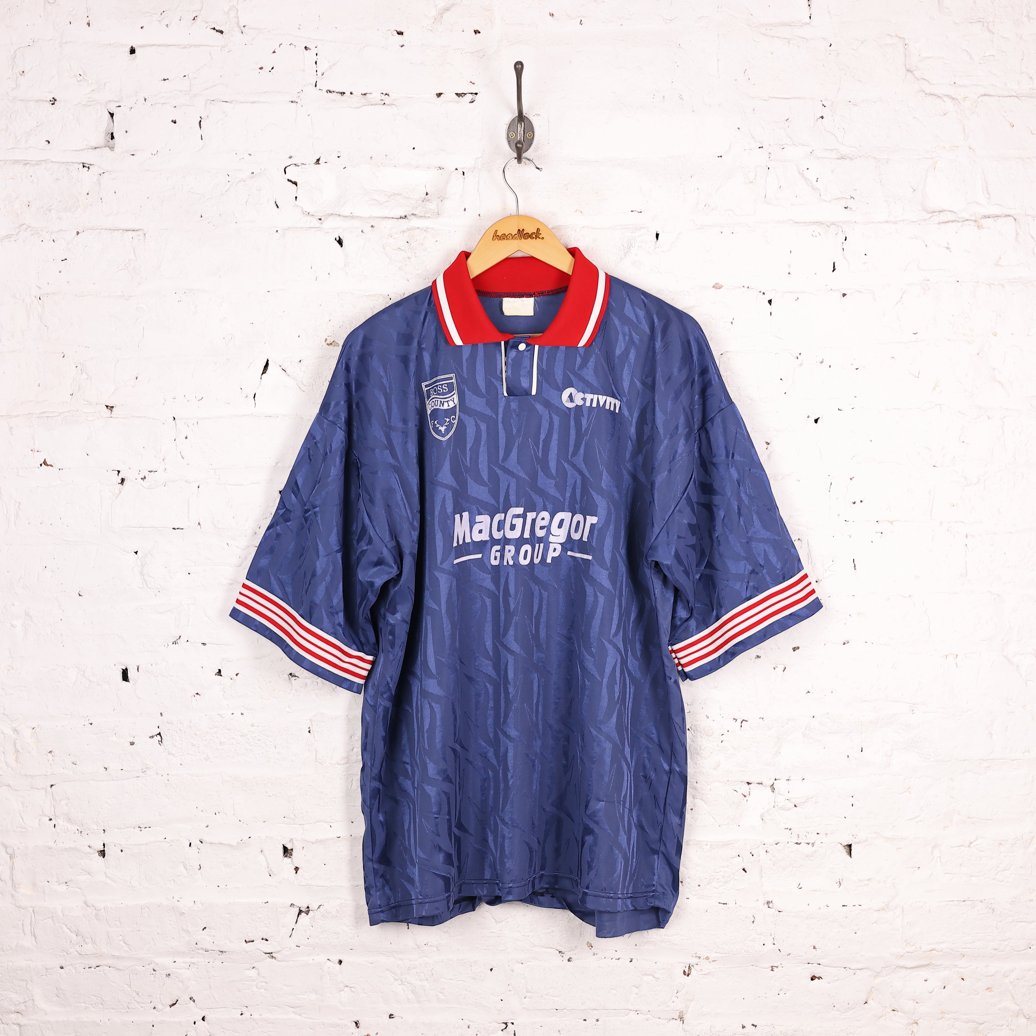 Good condition, some pulls and bobbles. Ross County home shirt made by Activity with Macgregor group sponsor, contrast red colour and sleeves with pattern blue fabric.