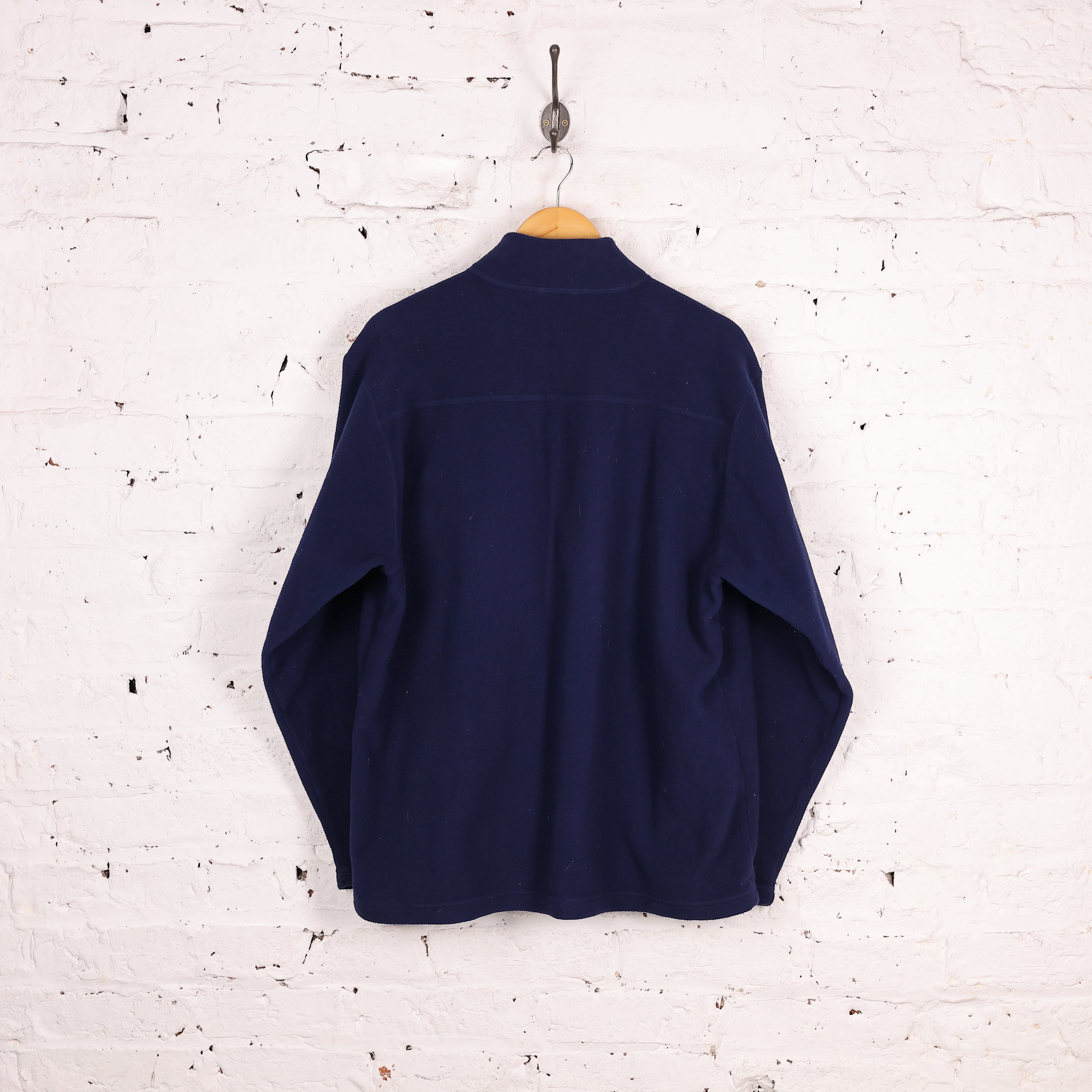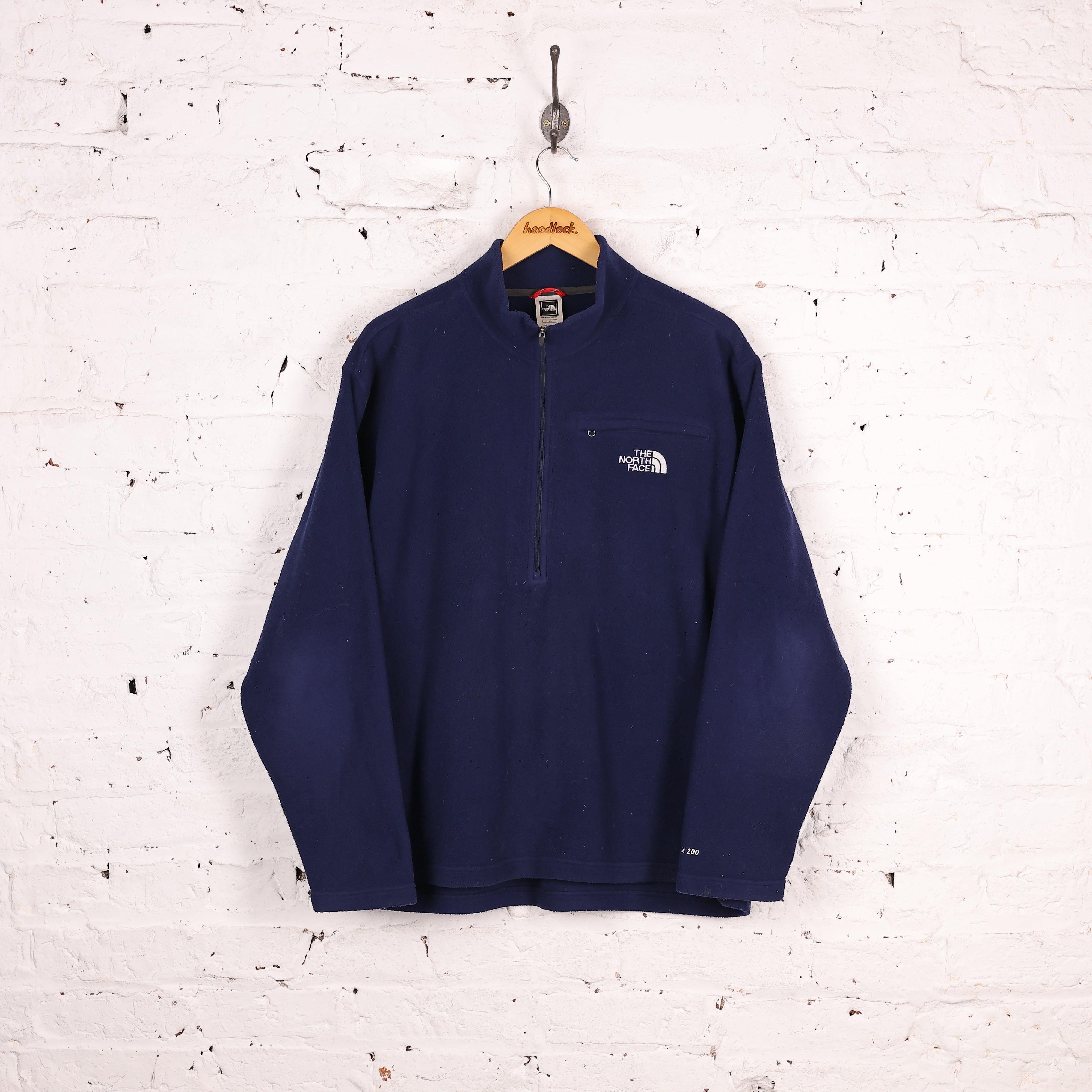 Good condition. The North Face 1/4 zip fleece in blue with stitched logo on the chest and zip chest pocket..