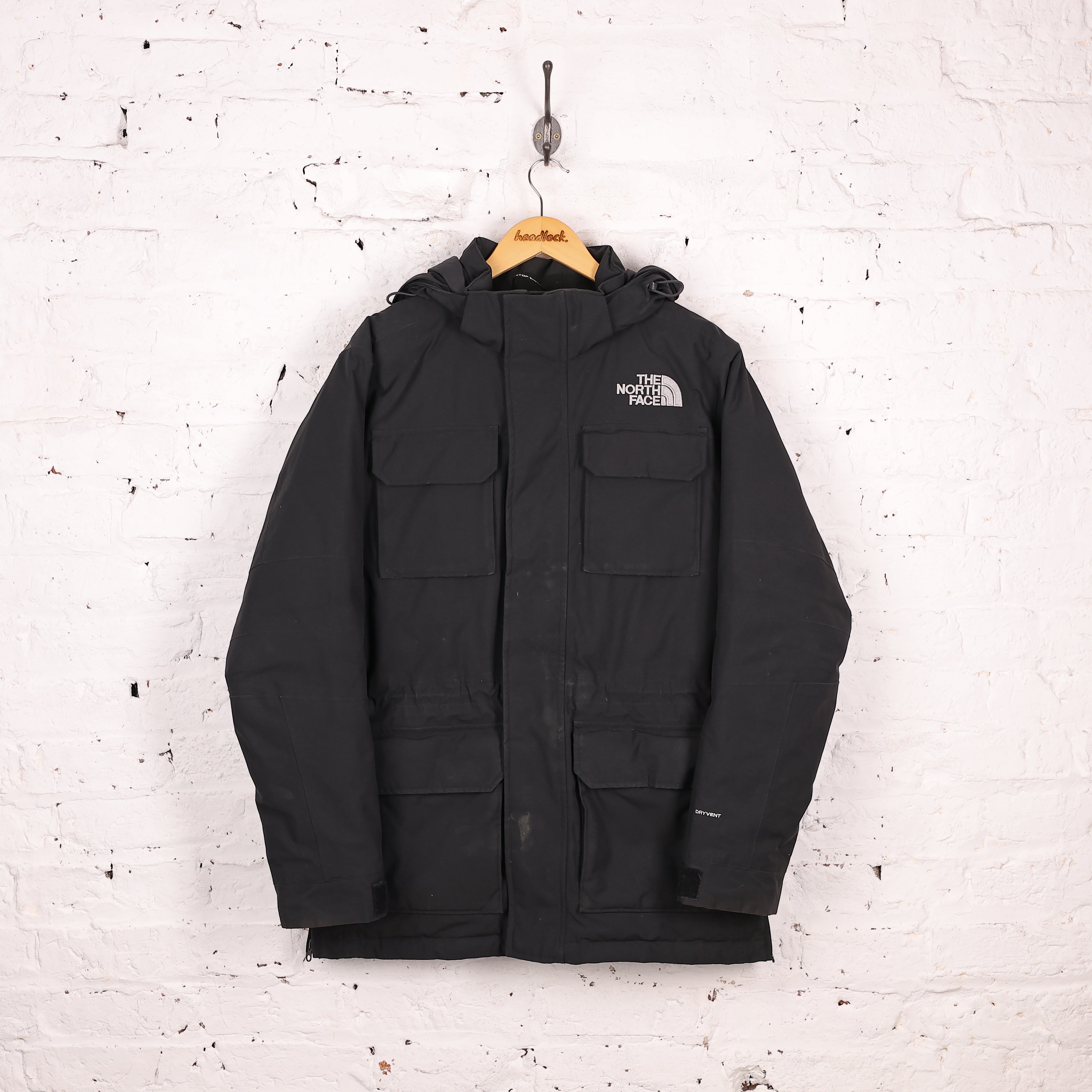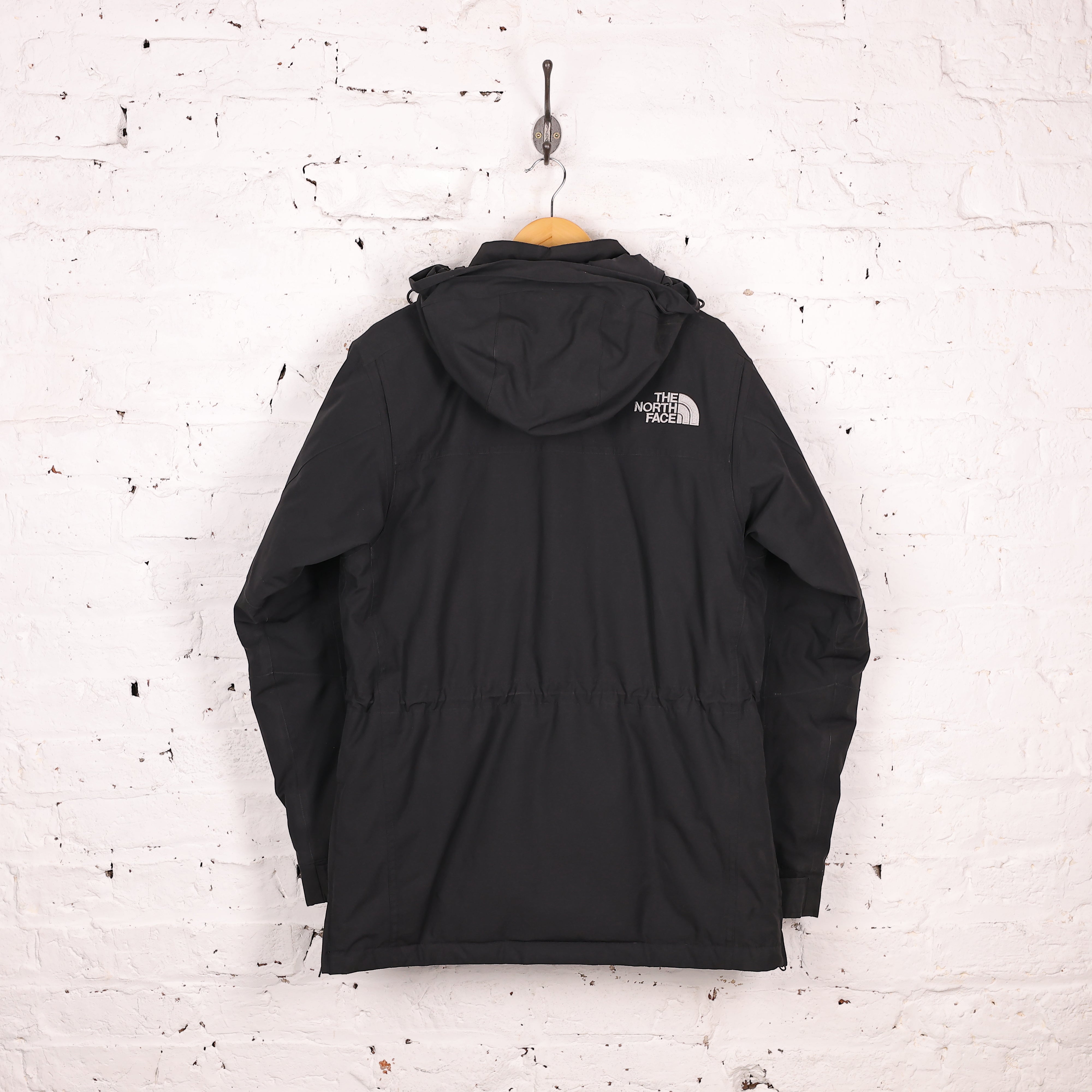 Good condition but slight marks to the front. The North Face coat in black with four outer pockets aswell as side pockets, down inner lining, stitched logo on the front, hood and zip fasten.